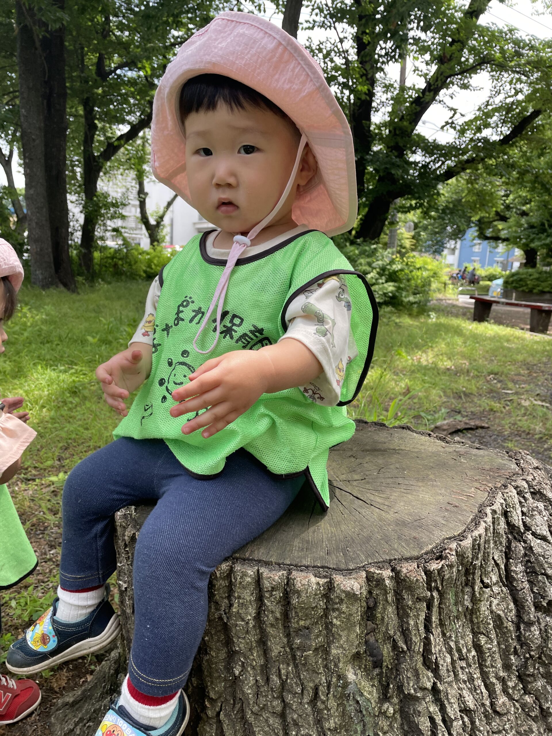 切り株に登っては「見てー!」と得意げな顔。