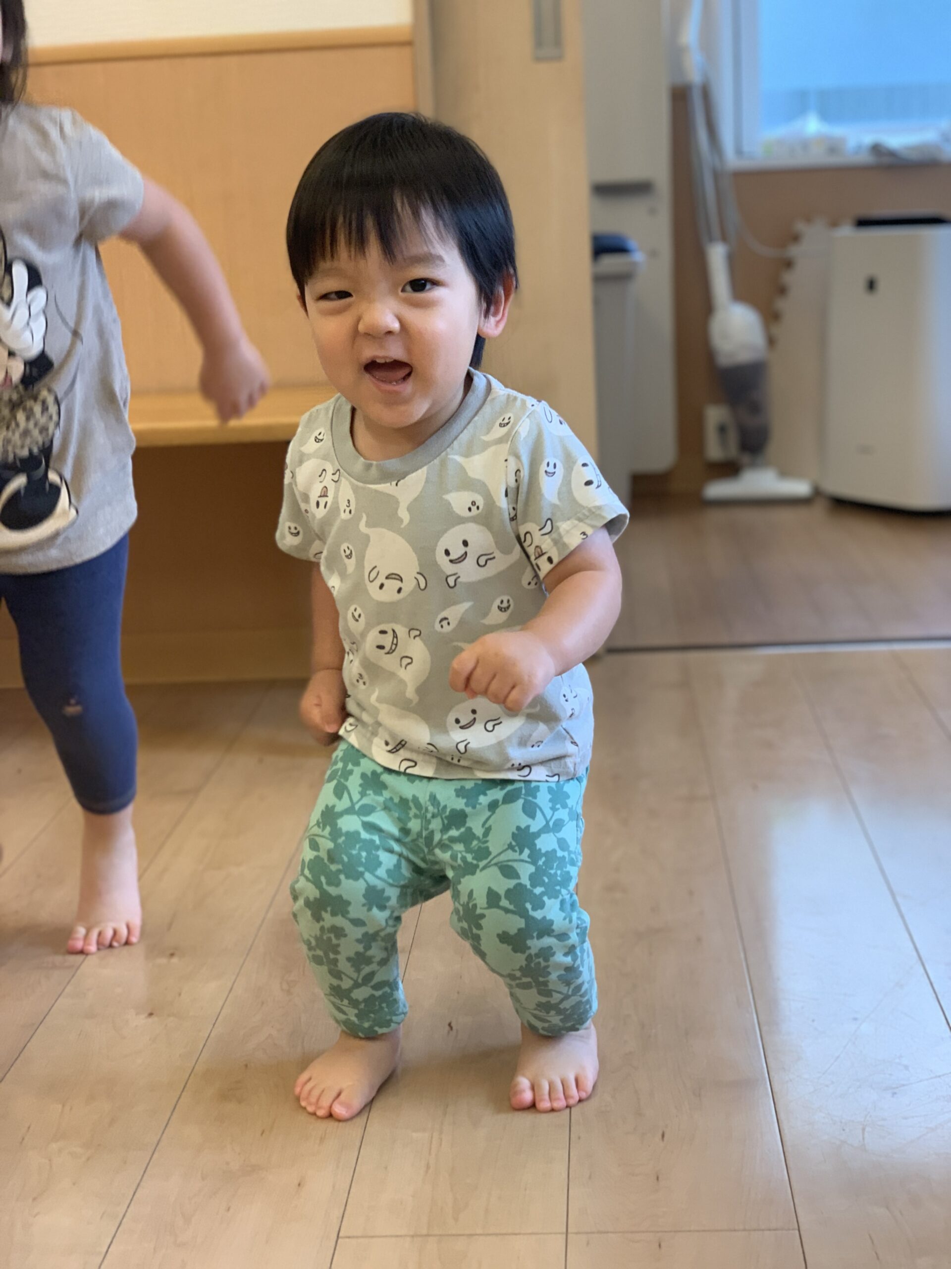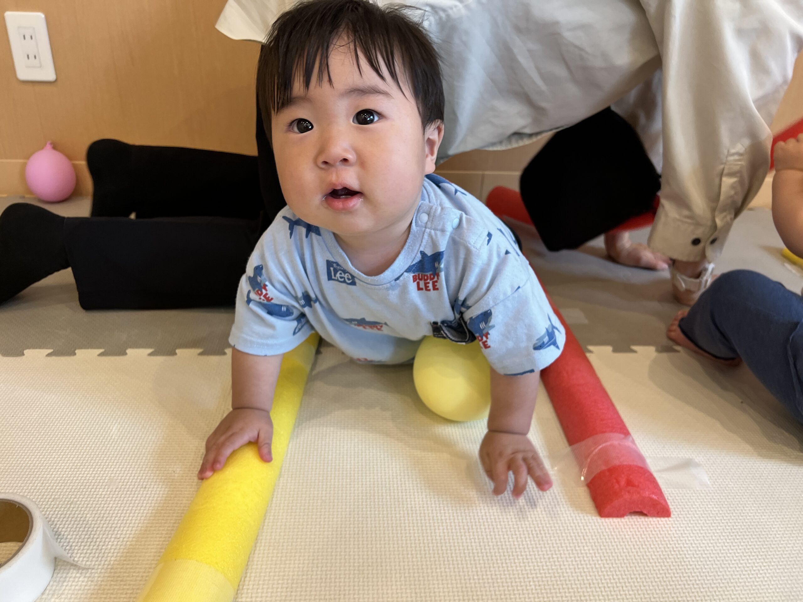 保育室では、バーを使ったハイハイ運動に挑戦!0歳児・1歳児のお友だちはバーを乗り越えたり、くぐったりして、体のバランスを取りながら元気いっぱいに動いていました。「先生、見て〜!」と得意気に通り抜ける姿もあり、思わず拍手♪