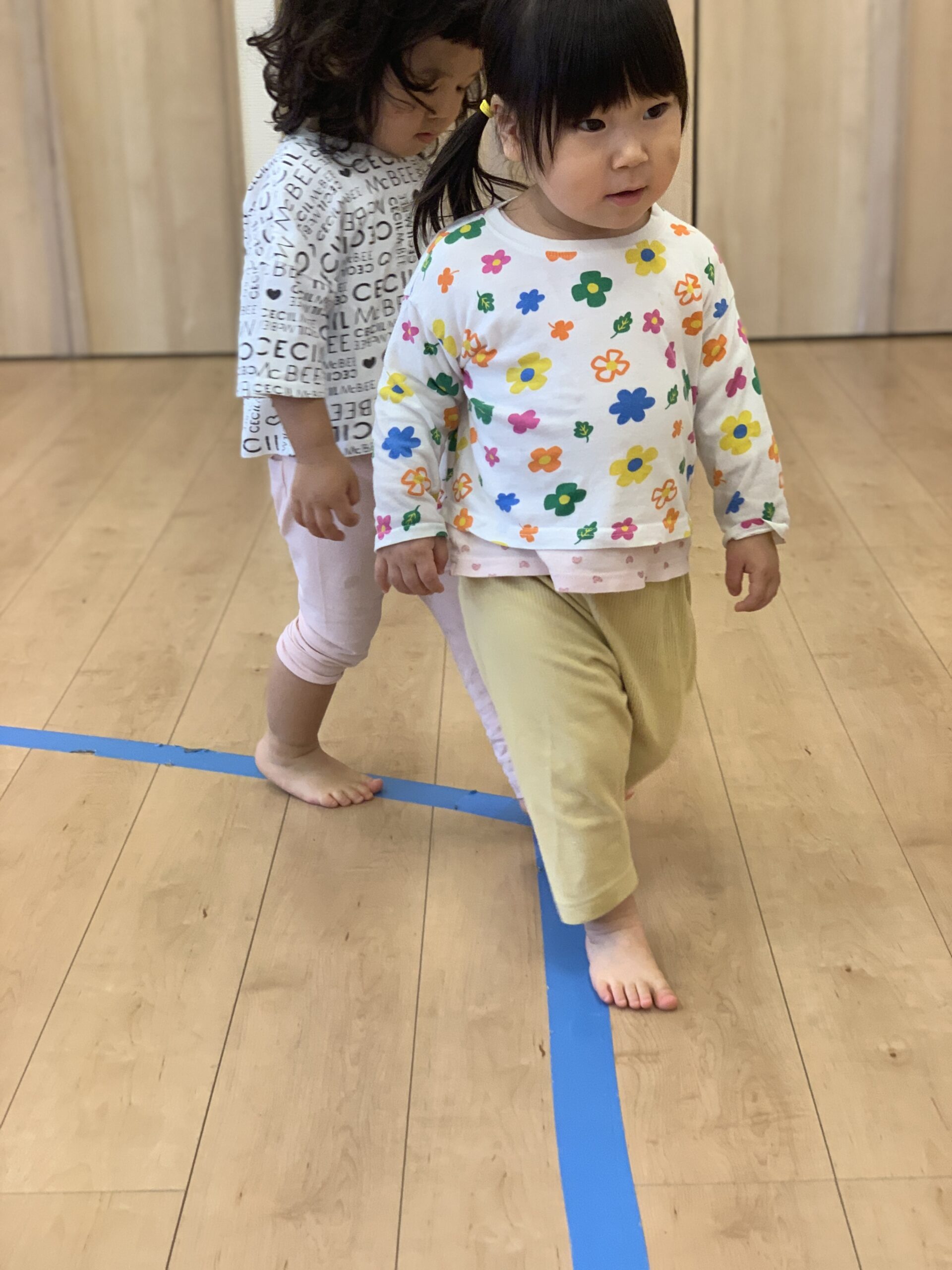 お友だち同士で「ハイタッチ〜!」と声をかけ合って、自然に笑顔があふれる場面も。仲良しの輪がどんどん広がっていく姿は見ている私たちも幸せな気持ちになります。線の上も上手に歩いていますね。集中しています。