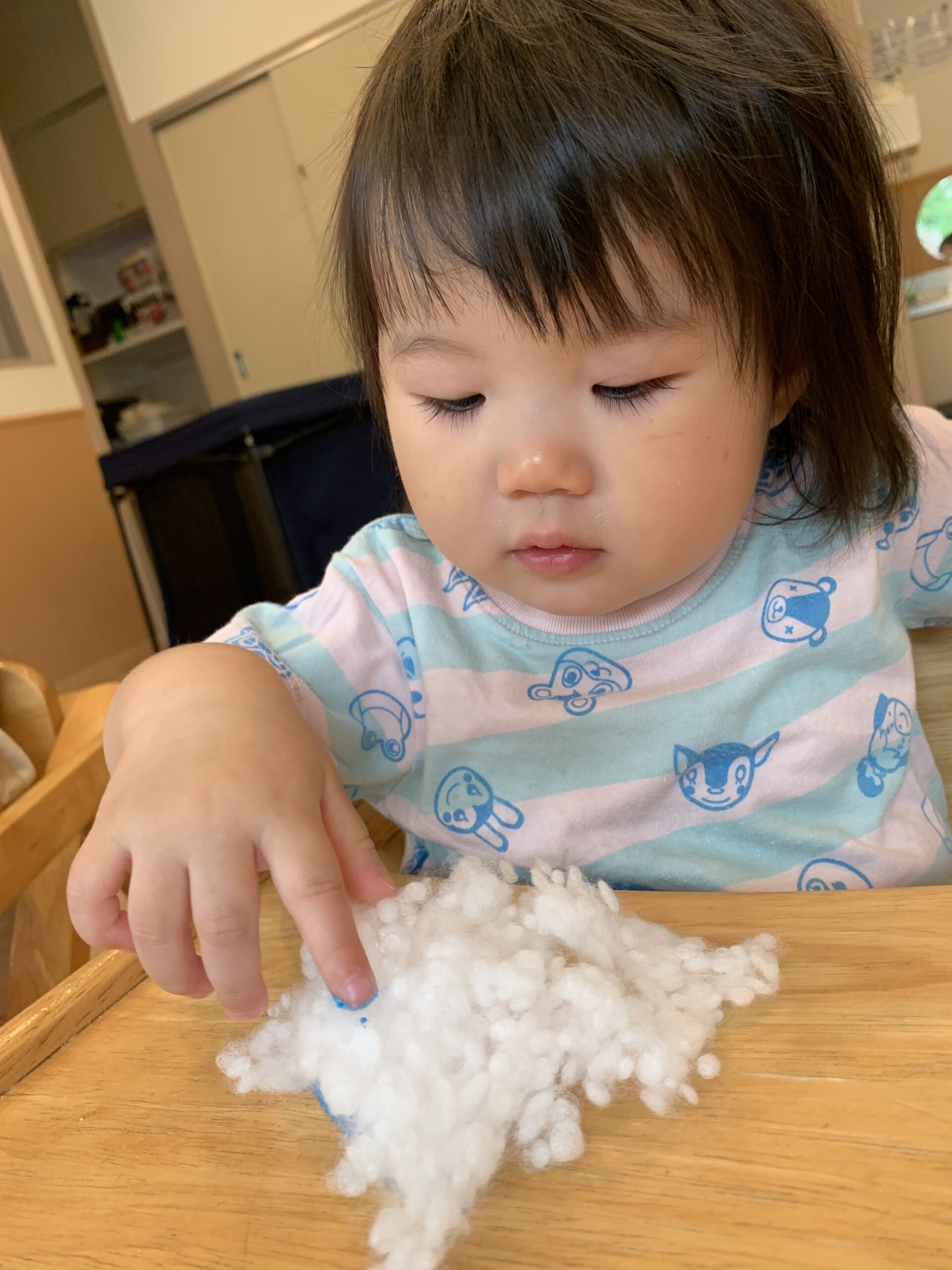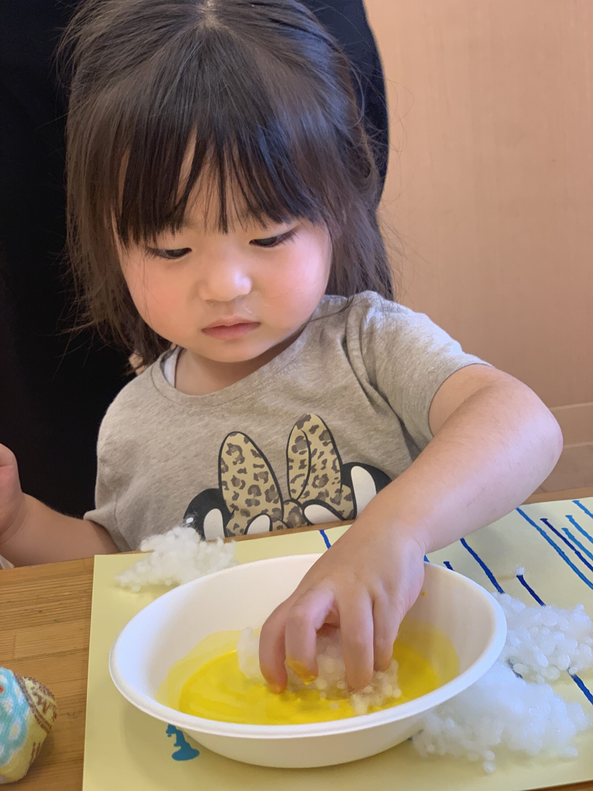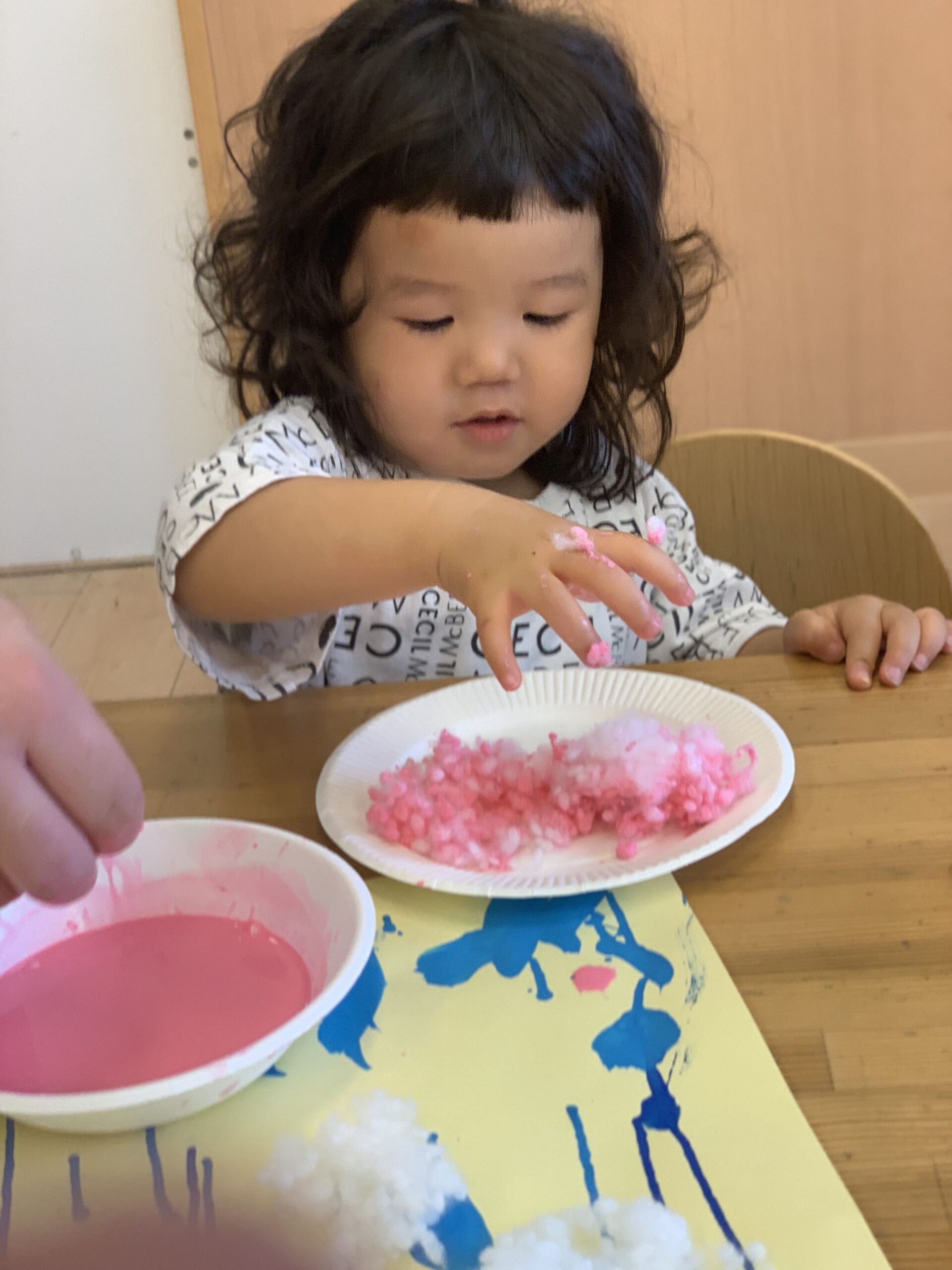 「ピンク!つけたい!」「きいろも!」と目を輝かせながら、筆を持つ手にも力が入ります。絵の具が紙の上で混ざり合う様子をじっと見つめて、「きれい〜!」と感動する声も聞かれました。感性が育まれる大切な時間です。
