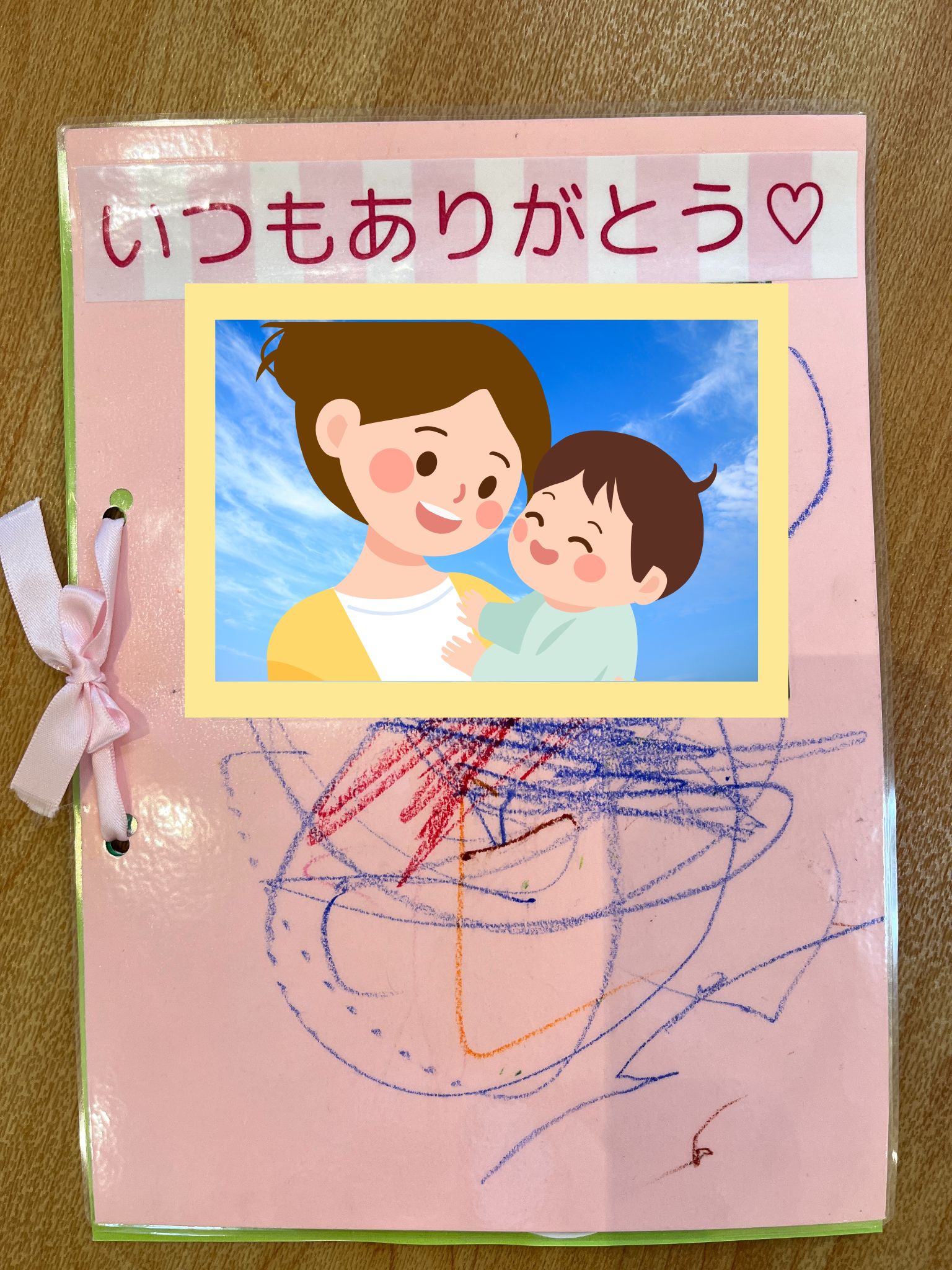 1~2歳児さんの制作表紙にはクレヨンで描いた絵にお母様とお子様の可愛い2ショット写真を♡