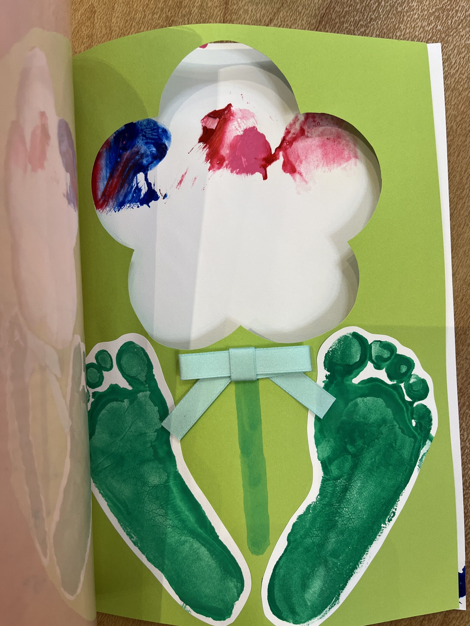 2枚目は花形にくりぬいた紙に足型の葉っぱがあり、3枚目のスポンジで描いた絵がお花の部分が透かして見えるようになっています!