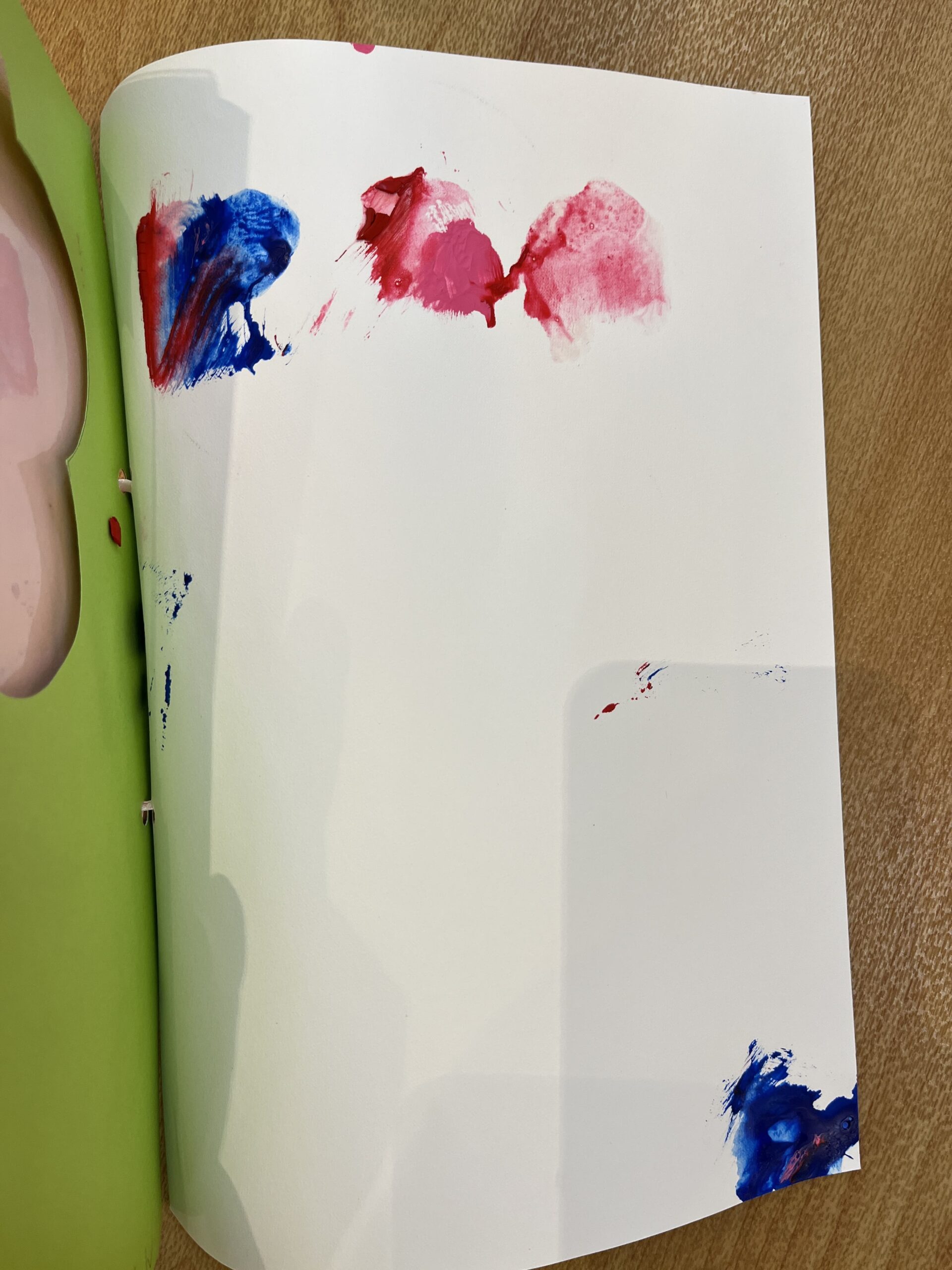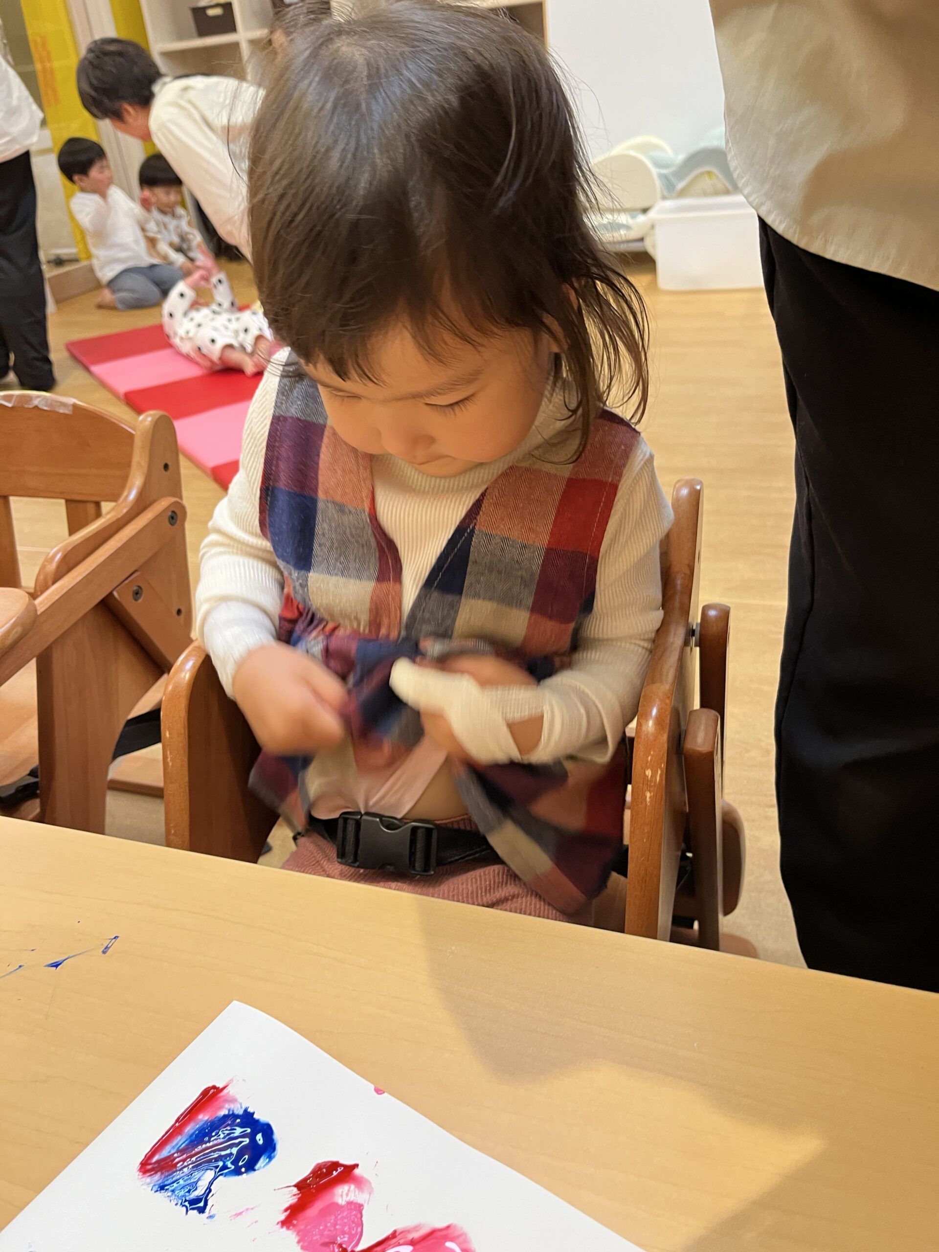 描いているうちに「手についちゃった!」と訴えてきました(笑)絵の具を拭いたら続きを描いてくれるかな?