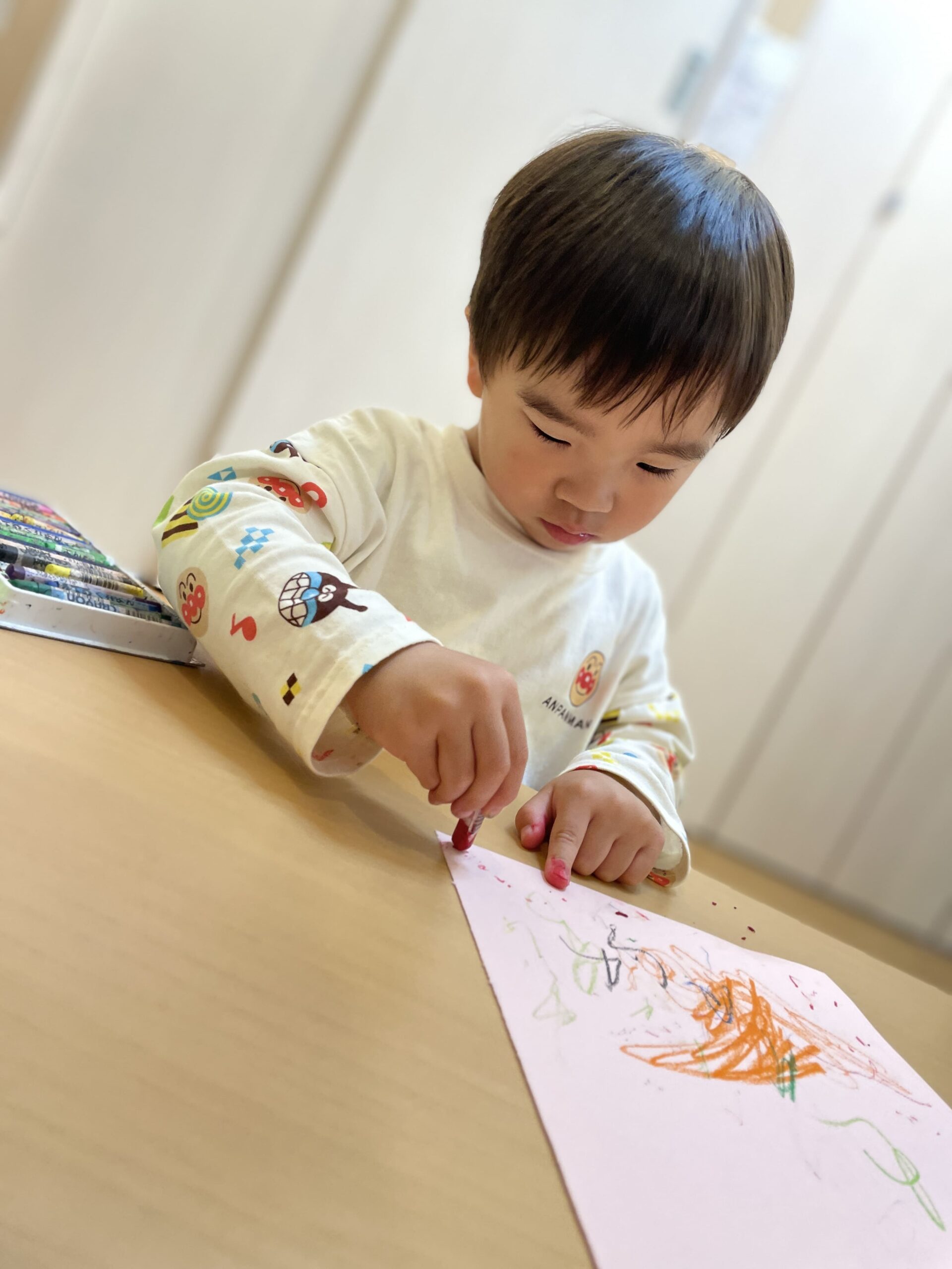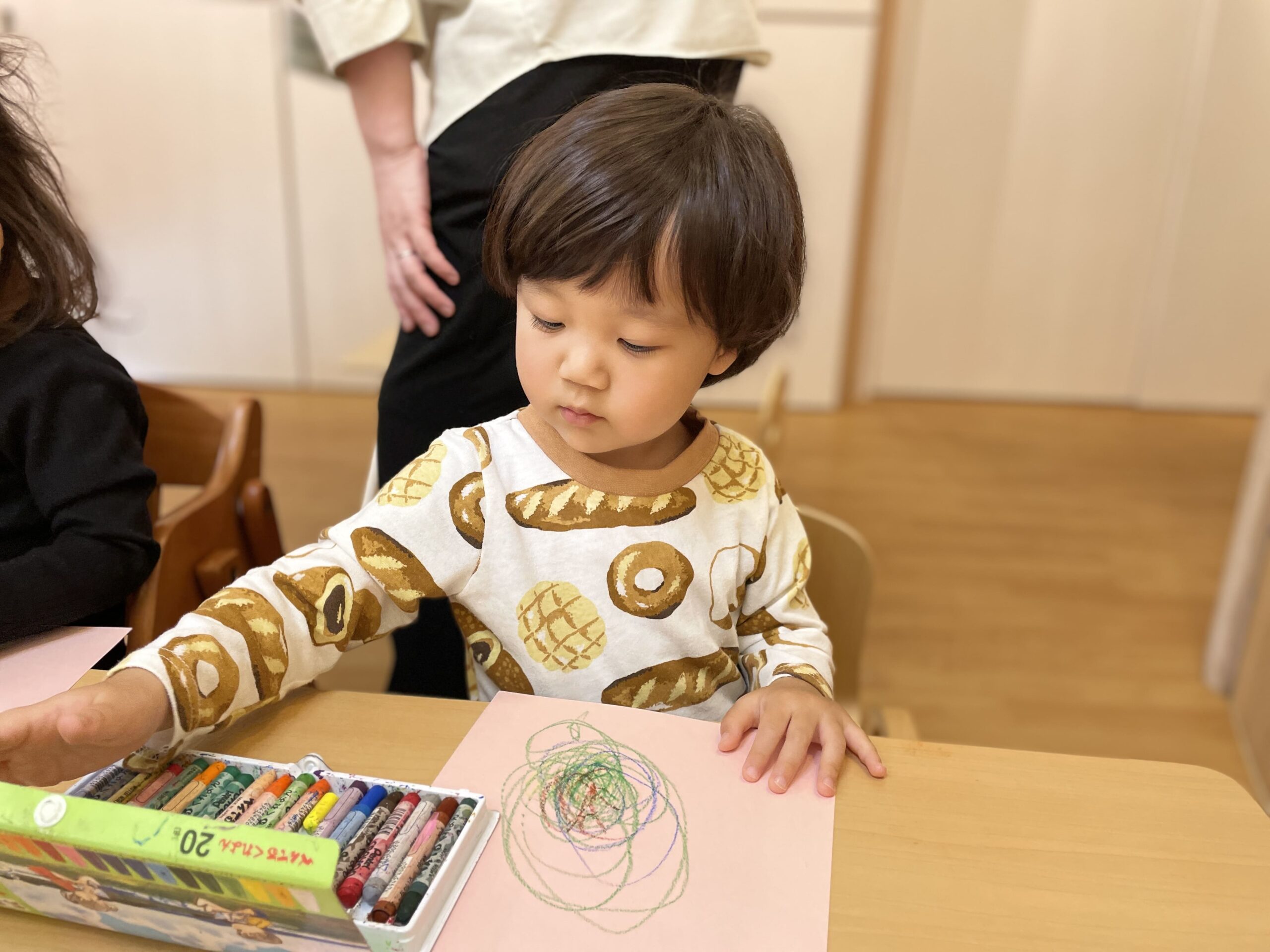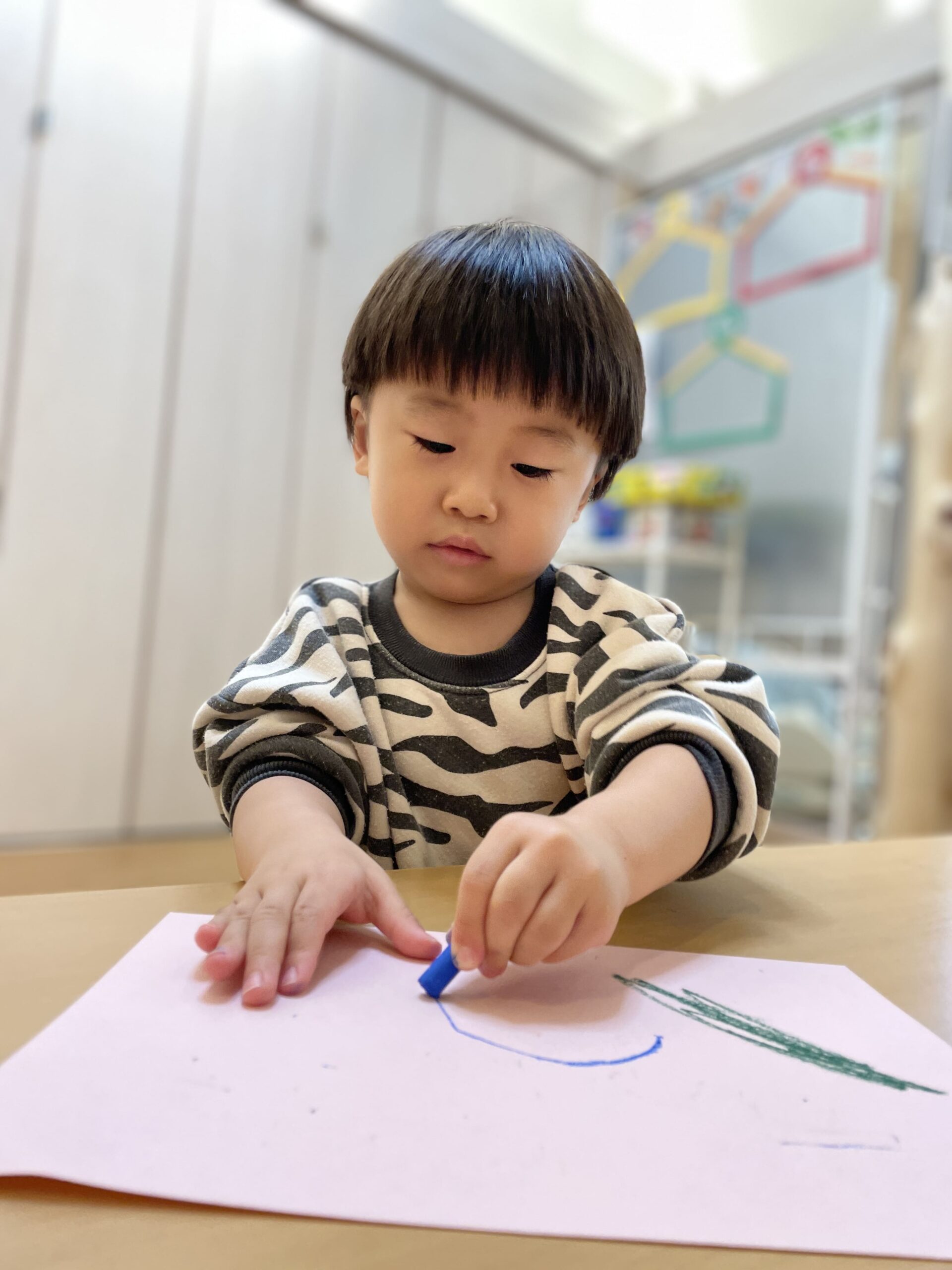 クレヨンの持ち方に悩んでいましたが、先生と一緒に描くとすぐにコツを掴み、自分で描くことが出来ました!色使いもカラフルでとっても素敵な模様ですね!