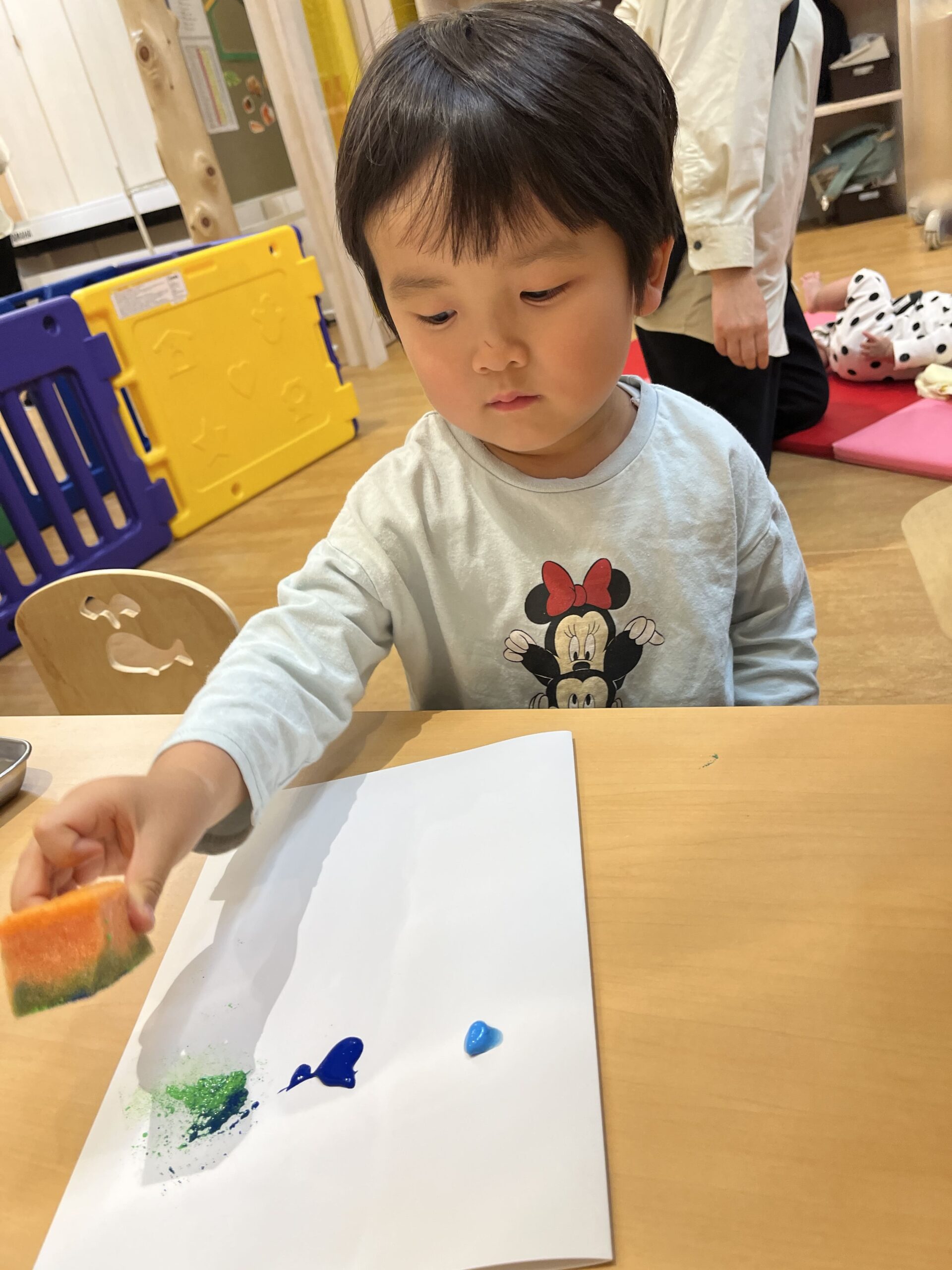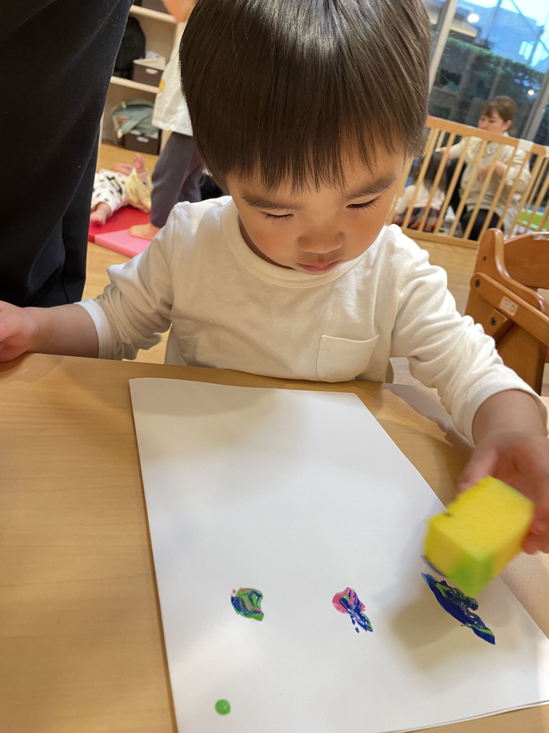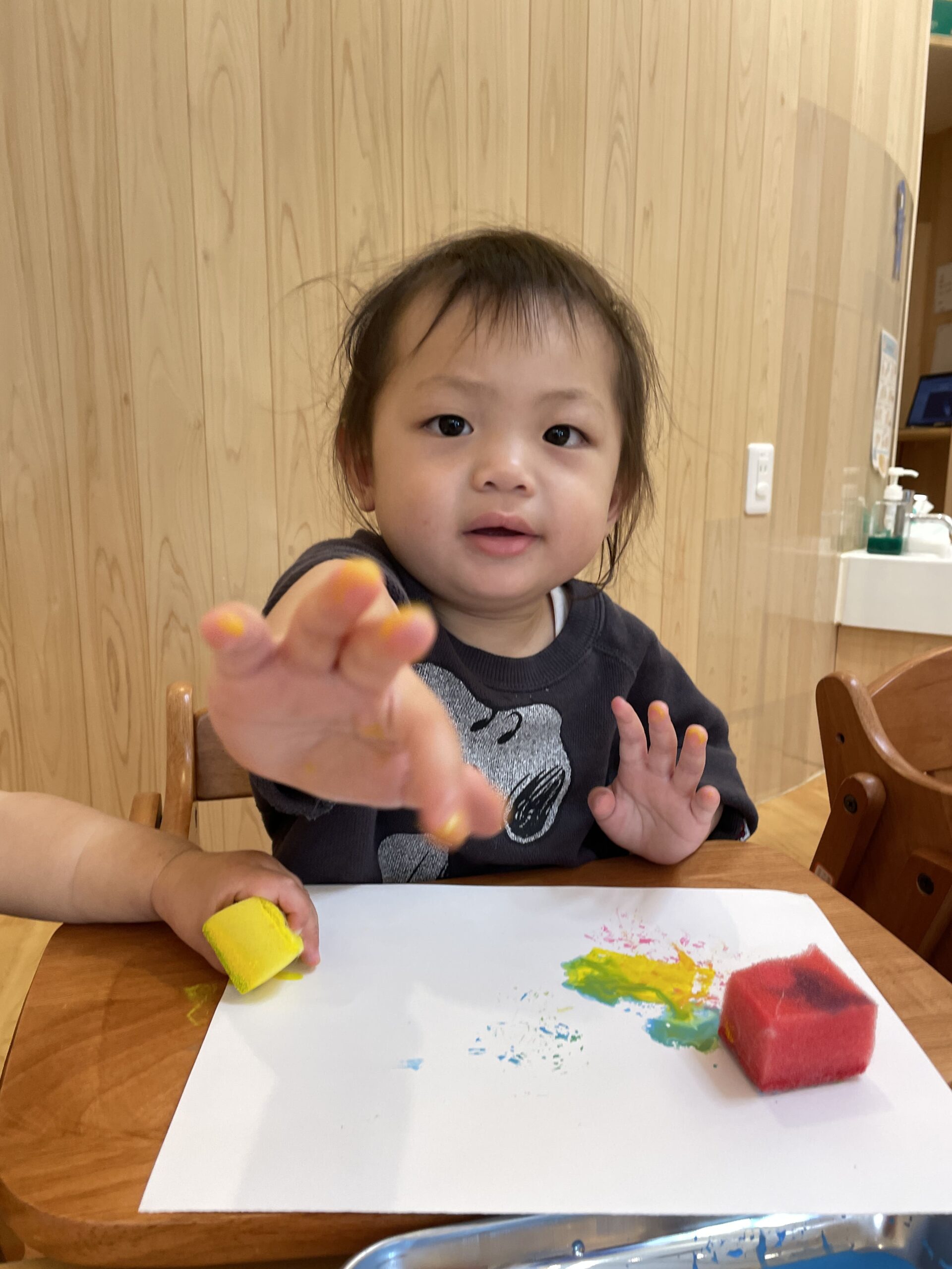 絵の具よりスポンジに興味があるわたしです!フワフワだけど弾力がある感触を楽しんでいます♪