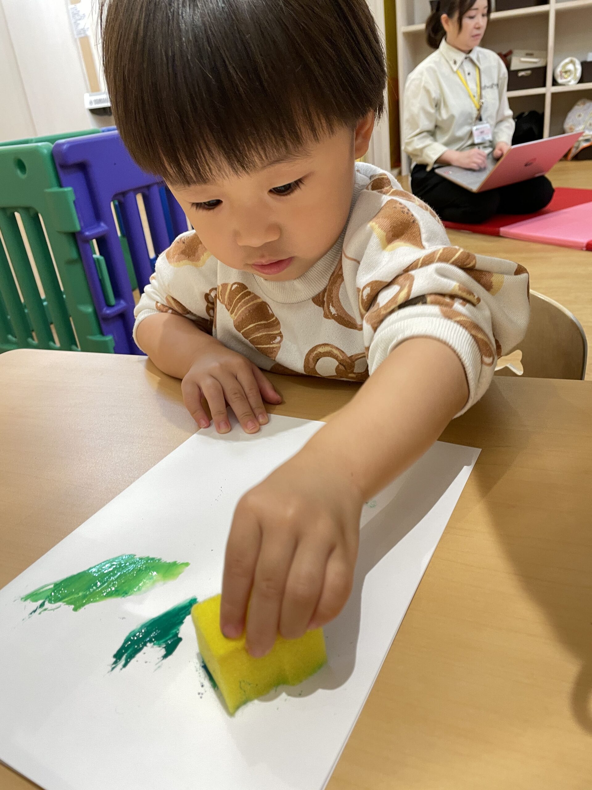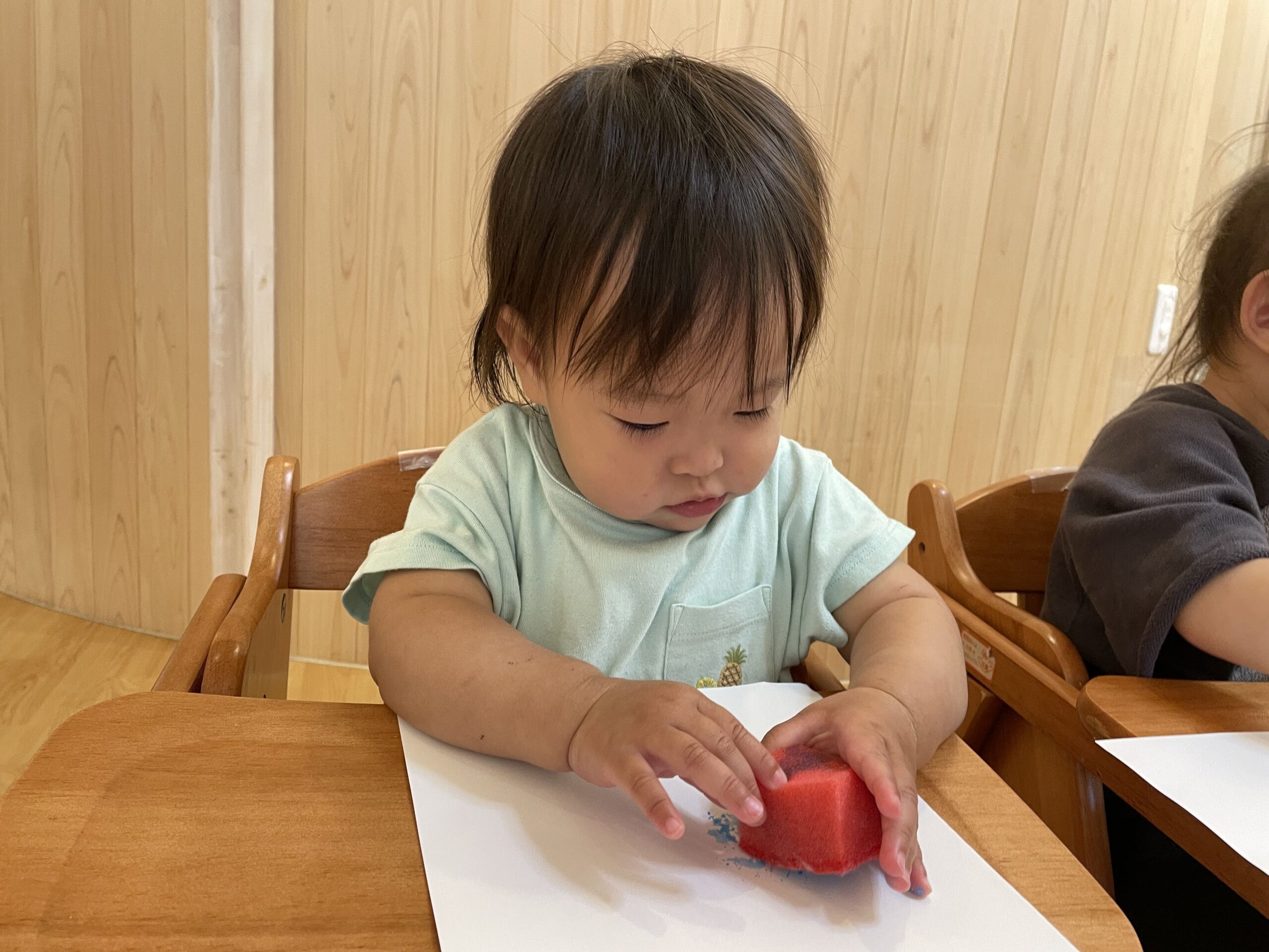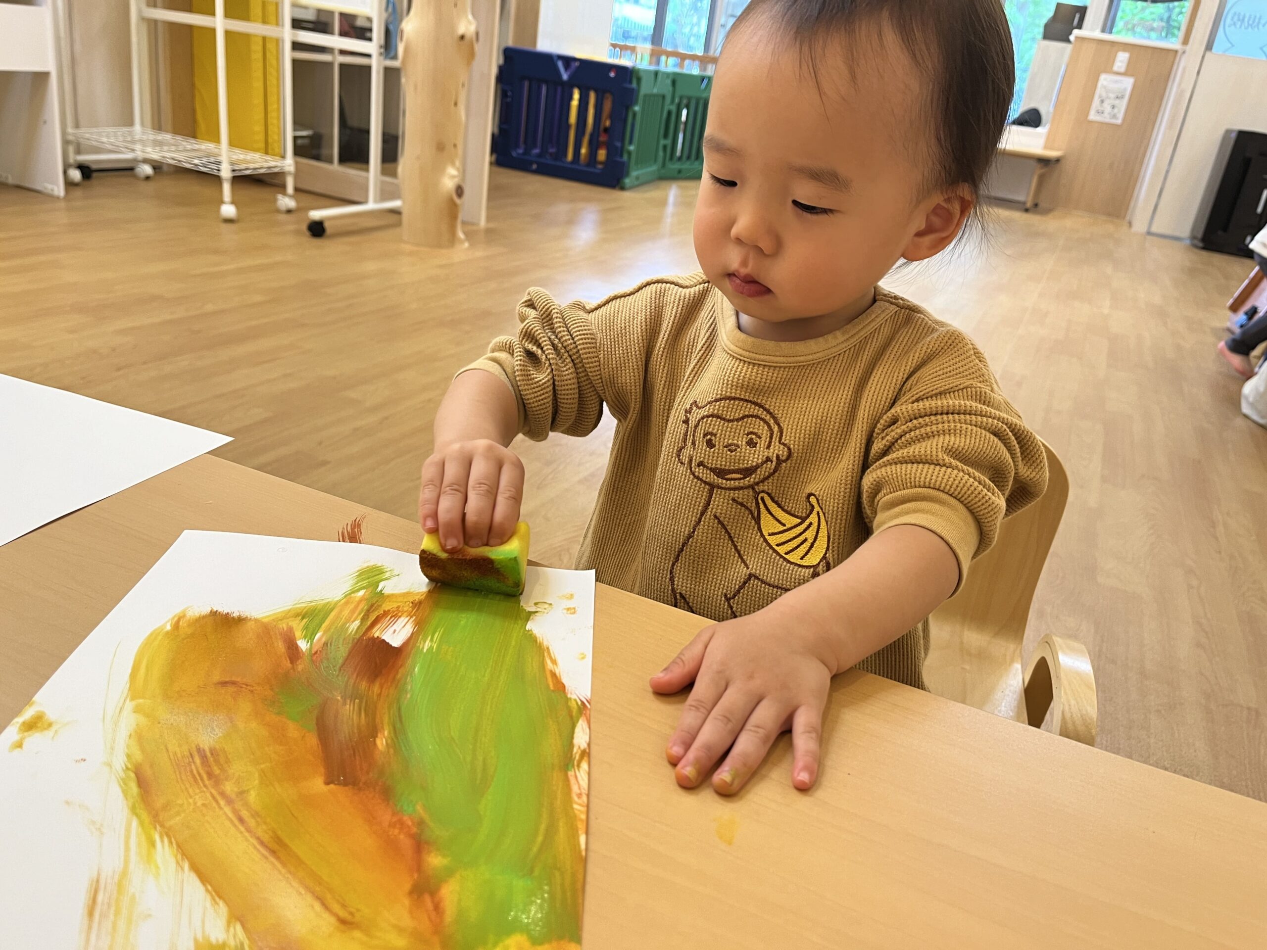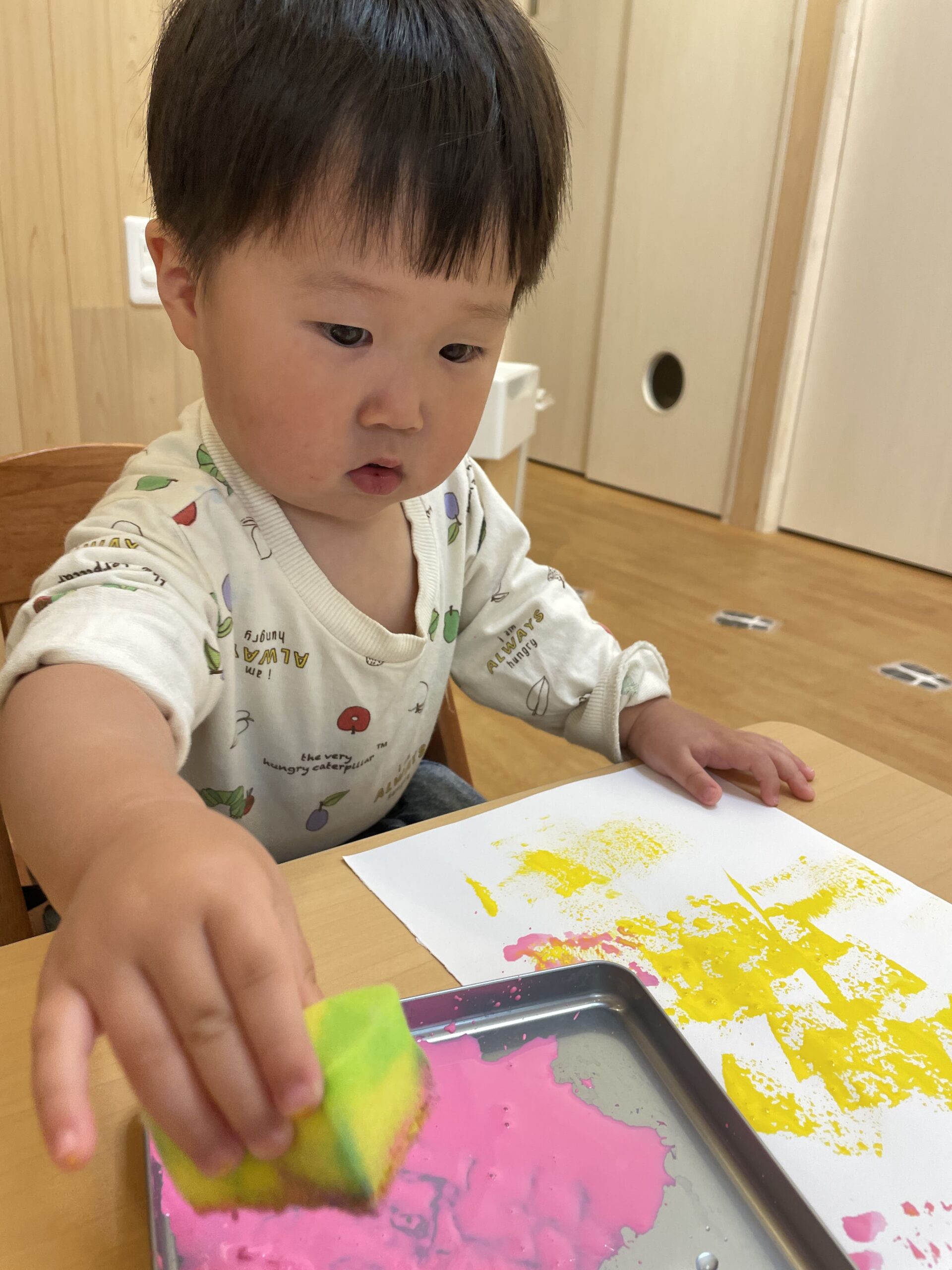 絵の具よりスポンジに興味があるわたしです!フワフワだけど弾力がある感触を楽しんでいます♪