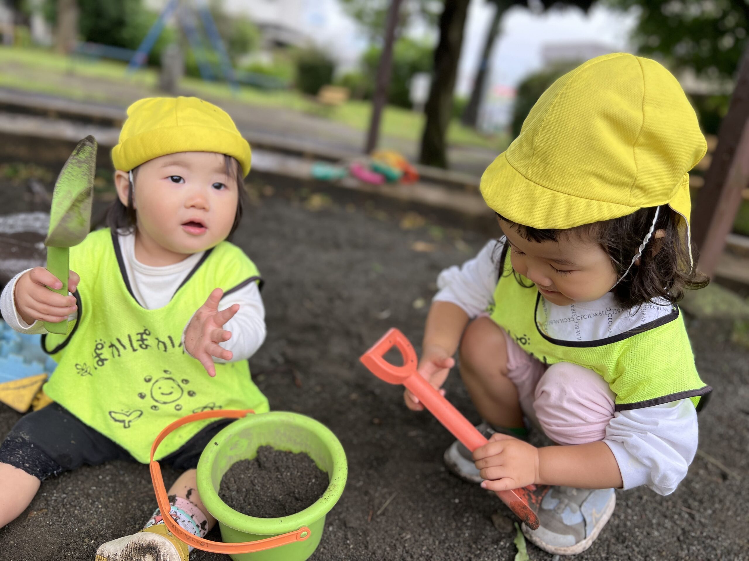 砂場ではスコップで砂をすくって「アイスですよ~」「ケーキできたよ!」とお店屋さんごっこが始まりました。