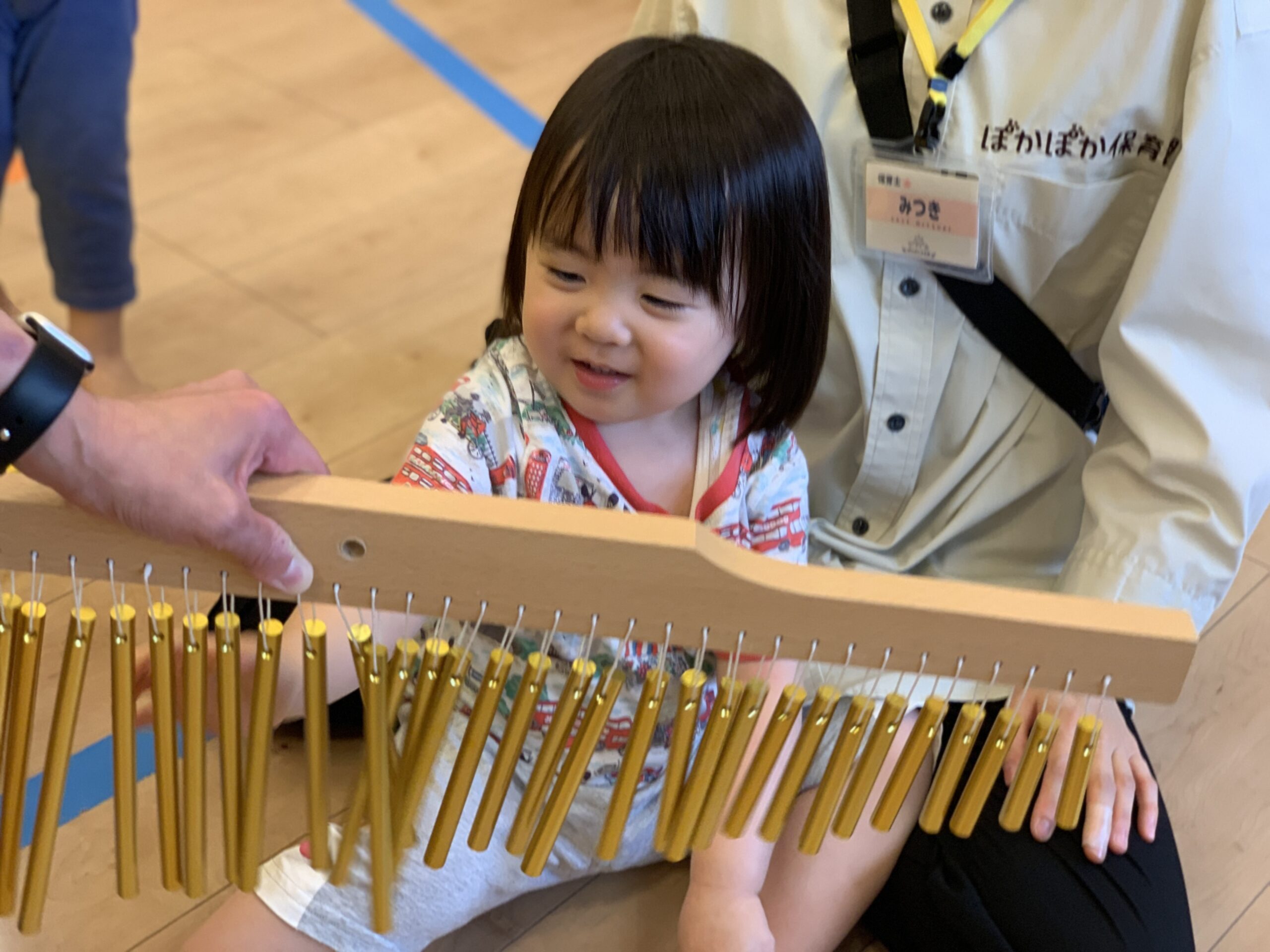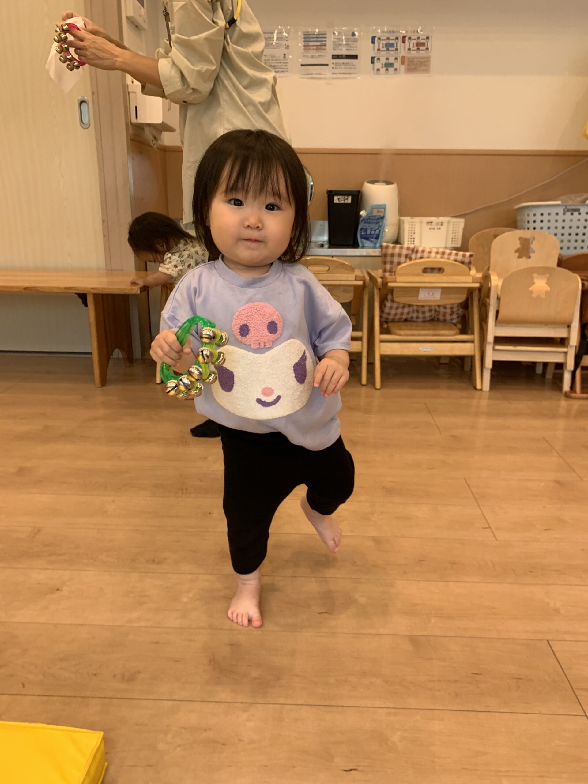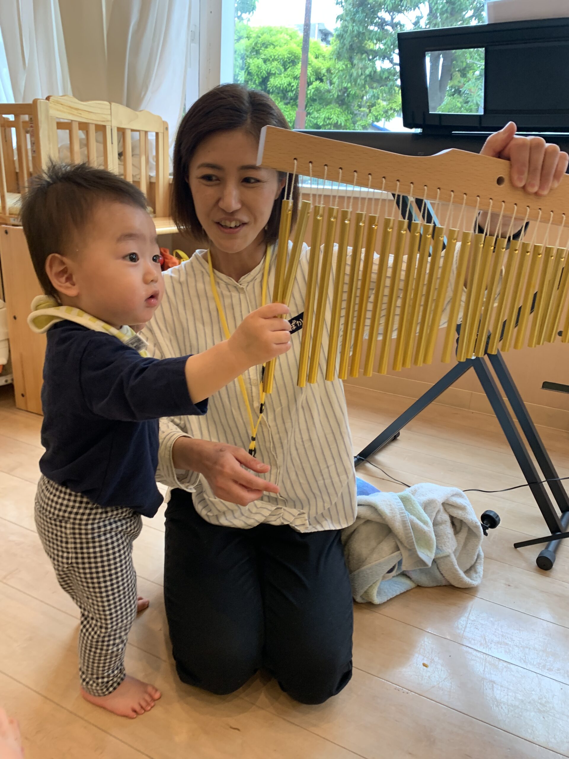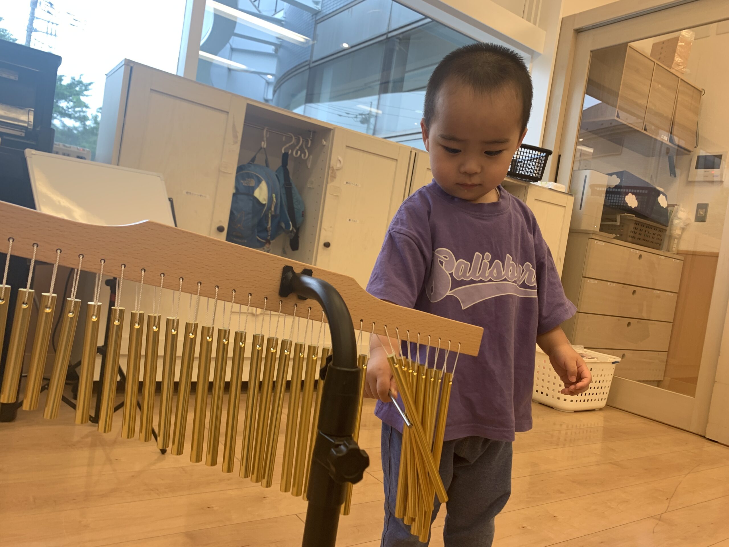 音楽遊びの時間では、鈴やウィンドチャイムの音色に合わせて手をふったり、鳴らしてみたりと、音を出すこと自体を楽しむ姿が見られました。