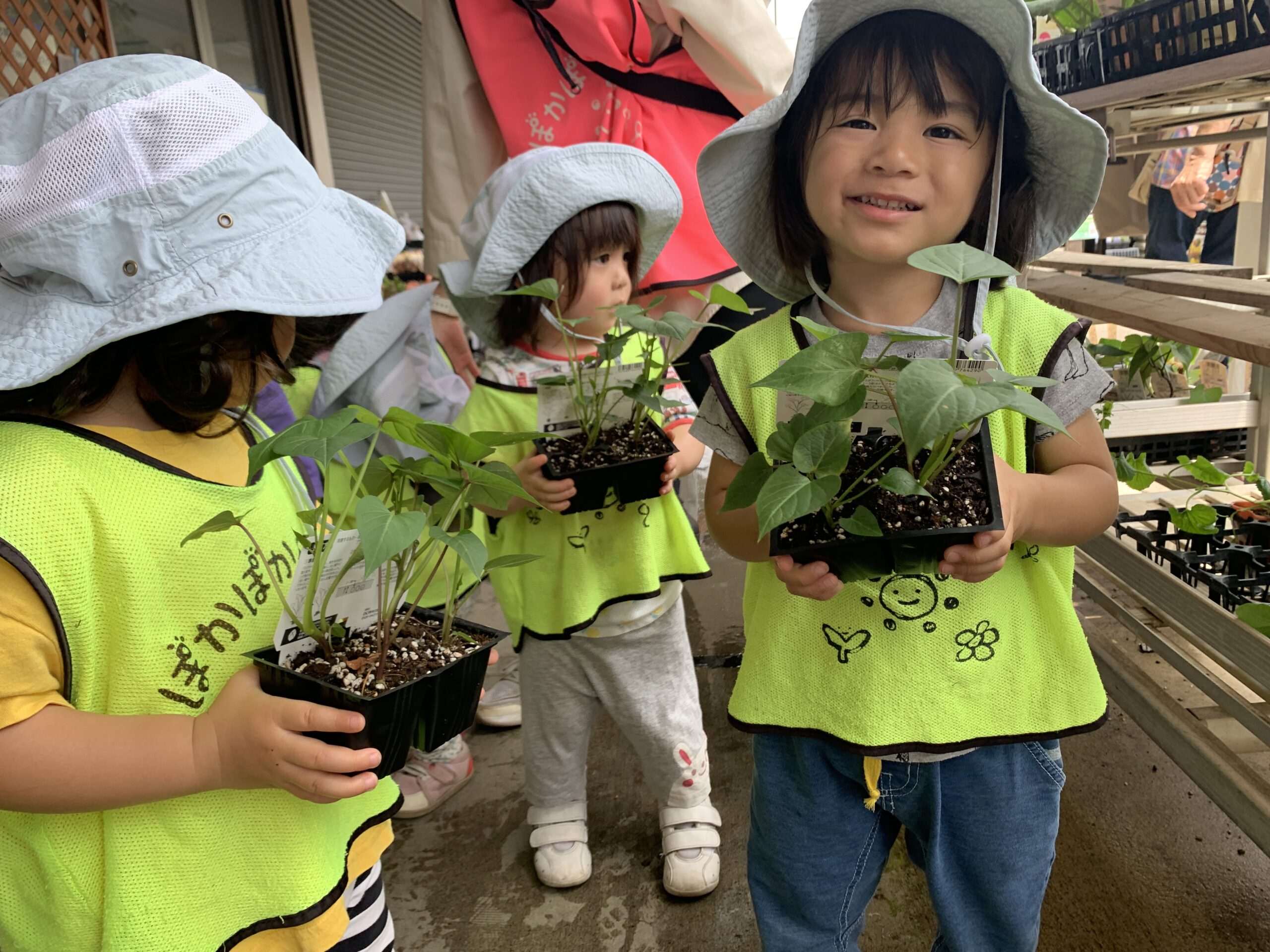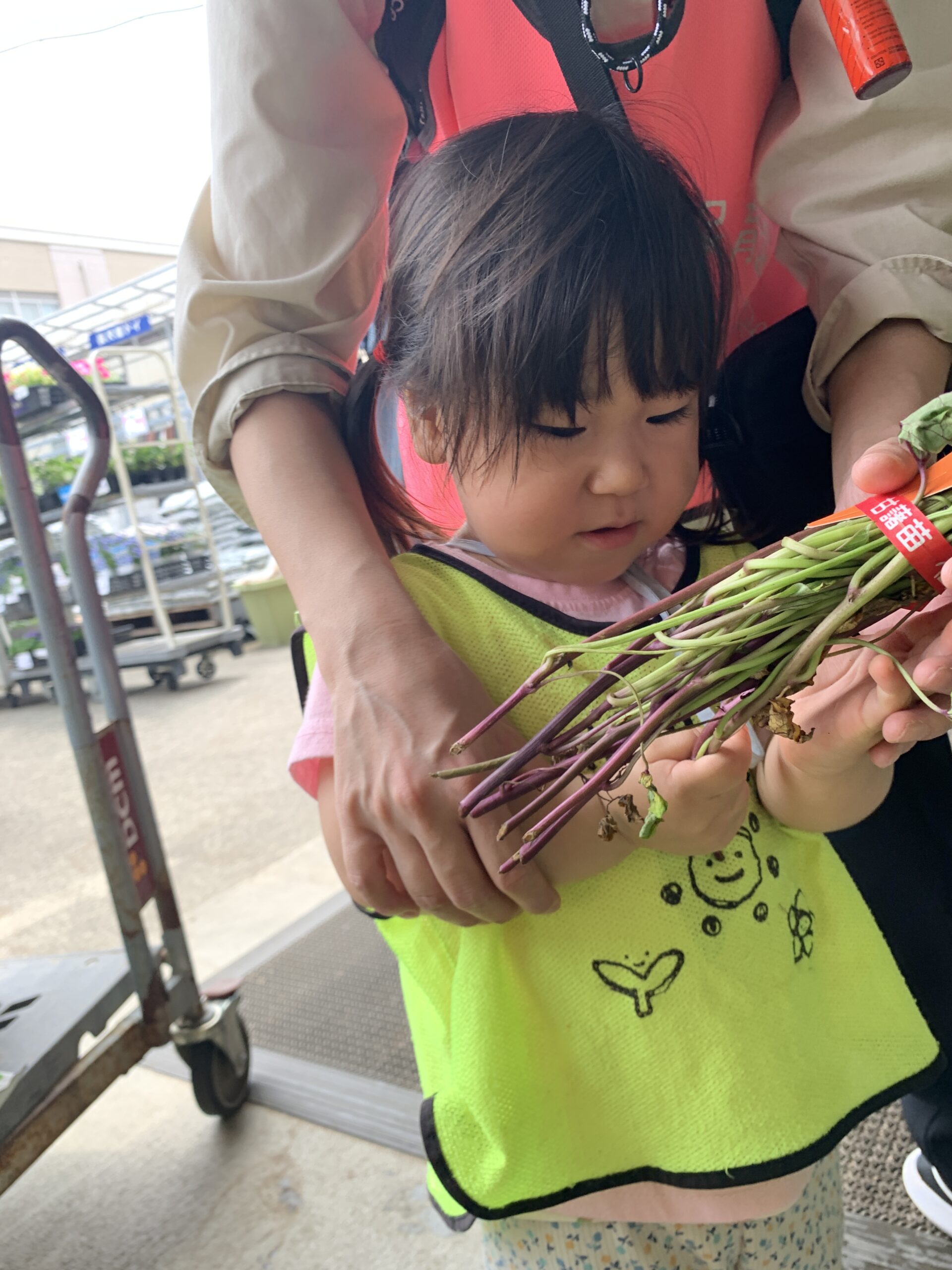 その後はなんと、さつまいもの苗を買いにお買い物へ!「おいも、これかな?」「おおきくなるかな?」と会話を楽しみながら、お金と苗を大切に握りしめてお買い物体験をしました。カメラを向けると可愛いポーズも決めて、お買い物にみんな嬉しそうな様子でしたよ☆植物を育てるという活動に対する期待と、自然とのふれあいがこれからどんどん広がっていきそうです。