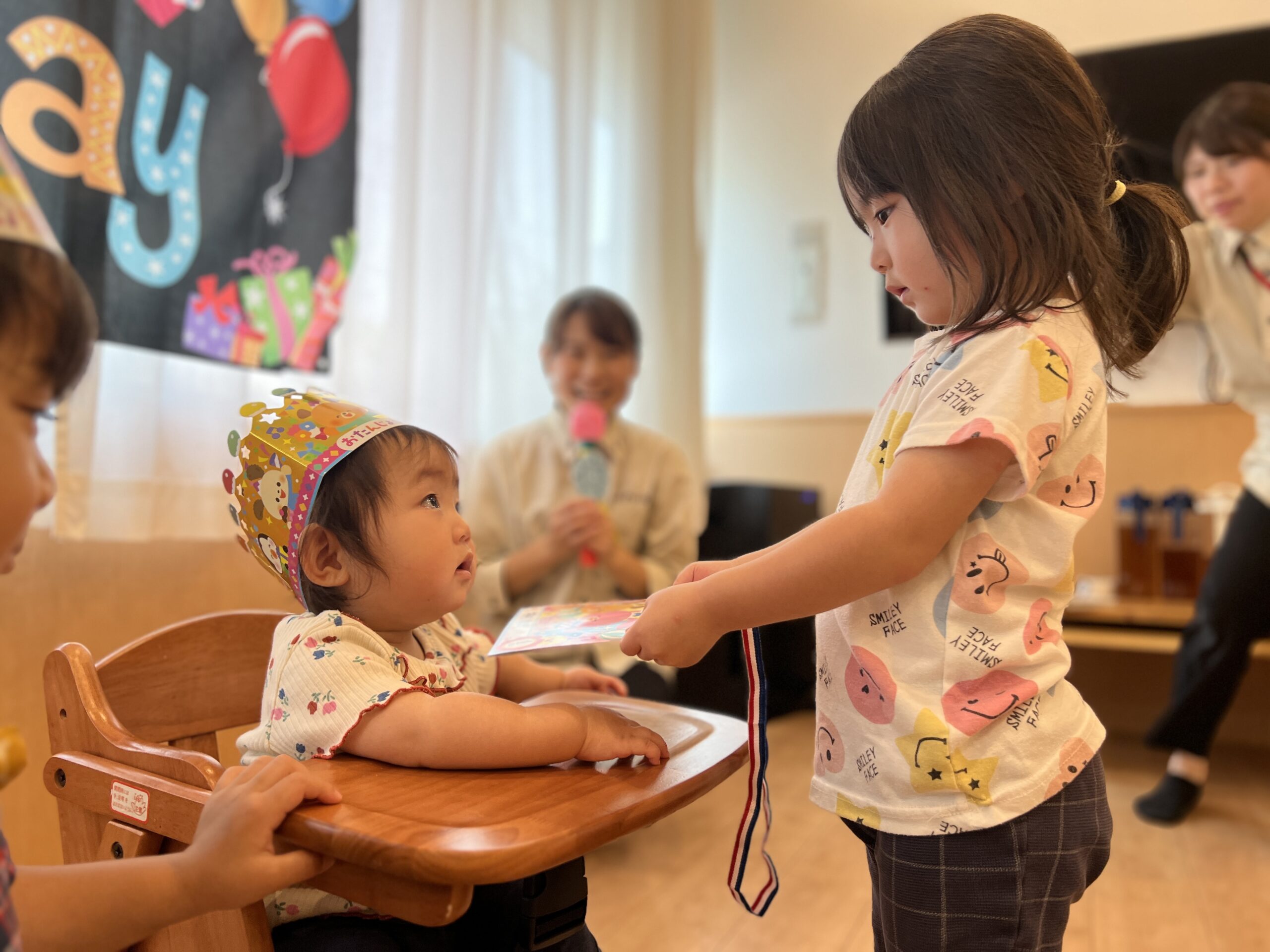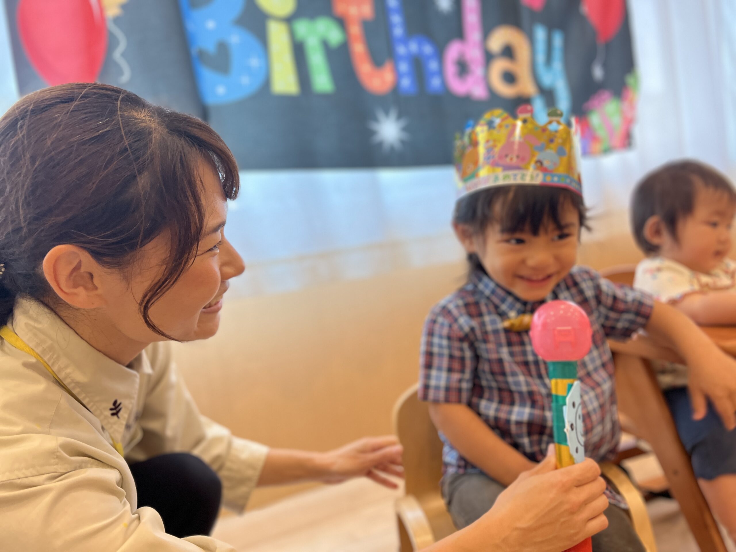 お誕生日を迎えたお友だちは、少し照れたような表情を浮かべながらも、みんなの前に立ち、インタビューに元気に答えてくれました。