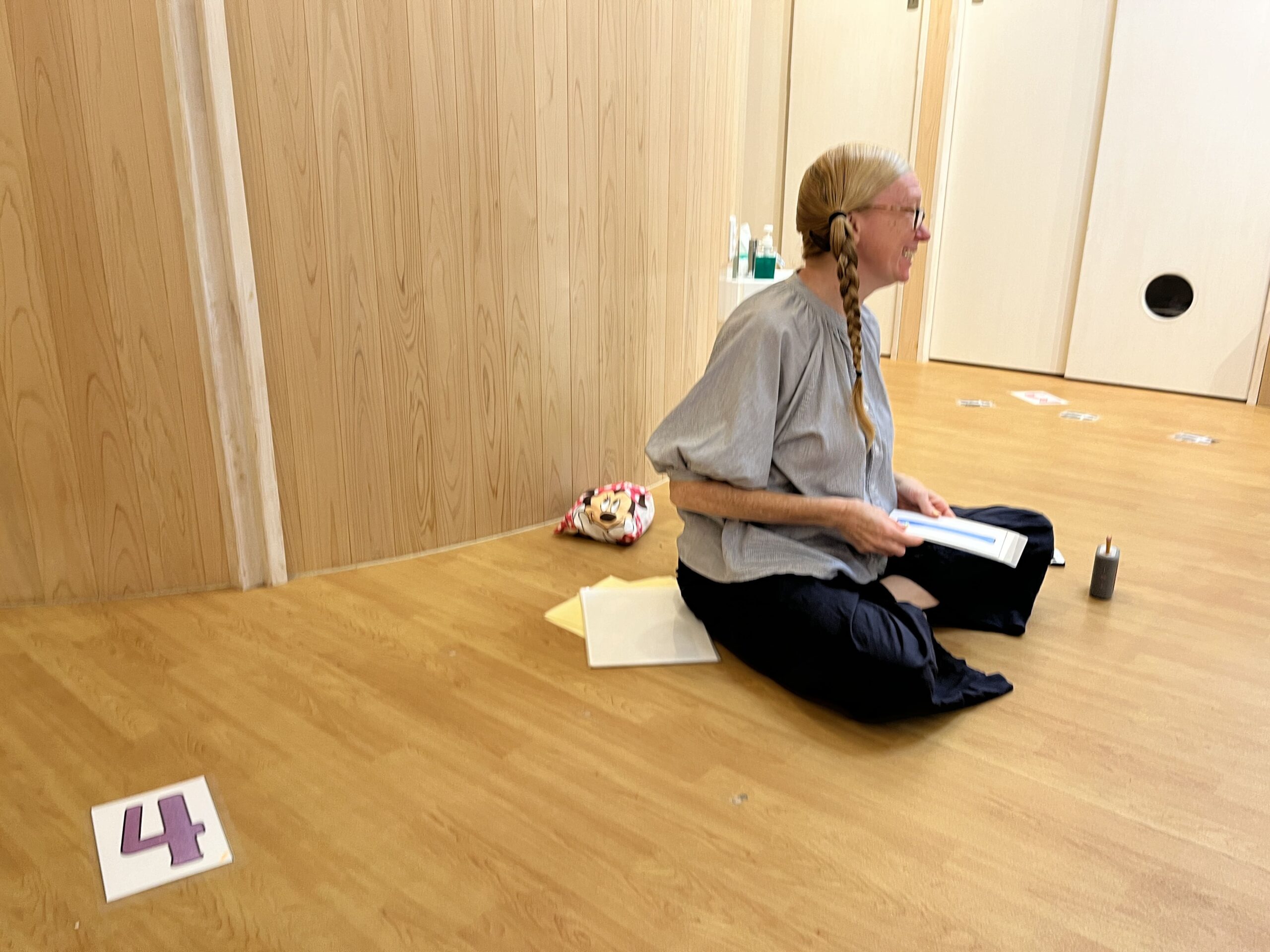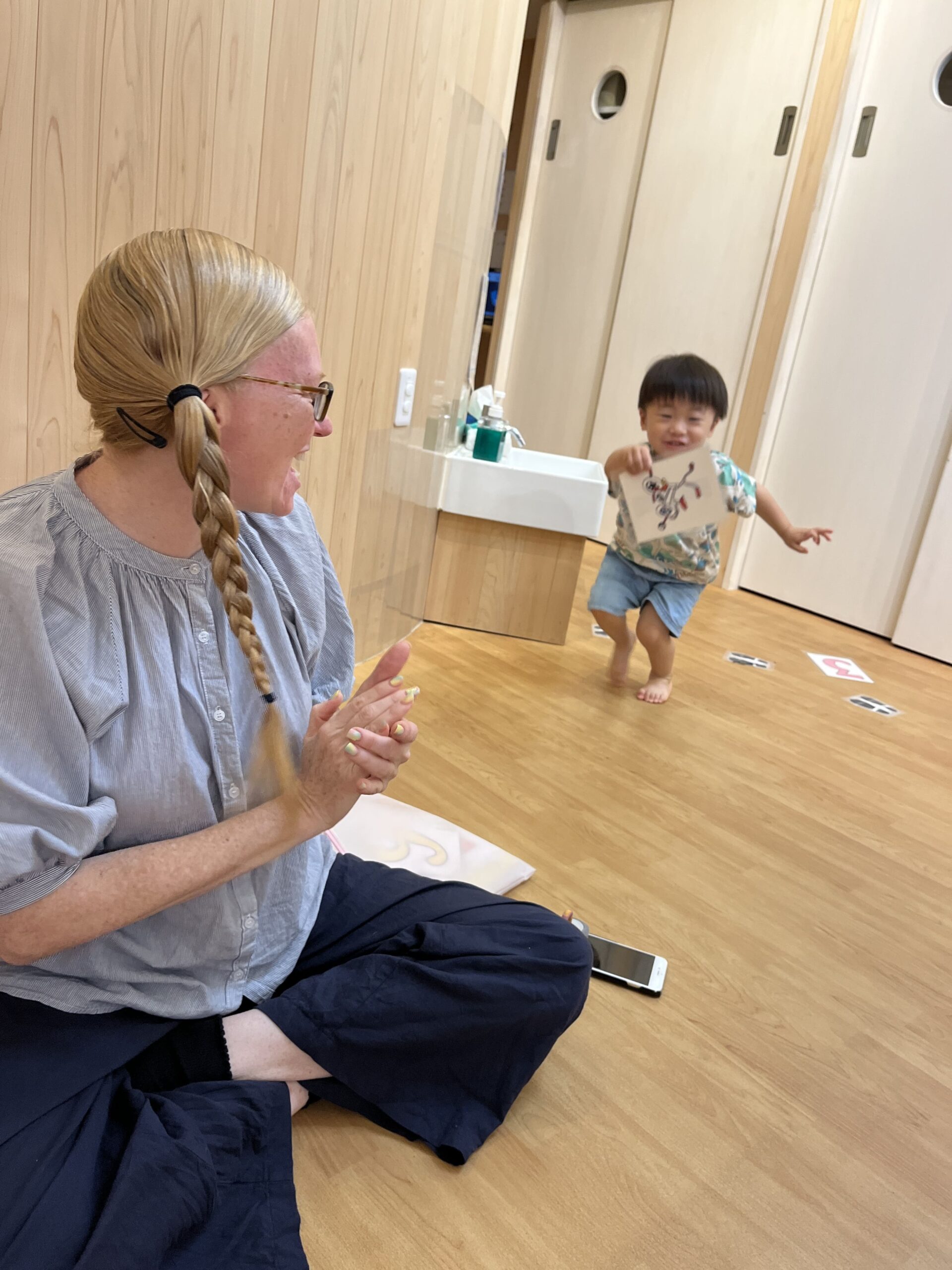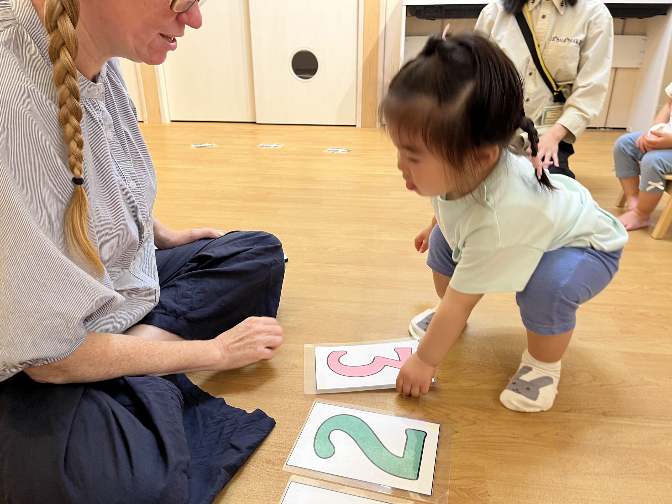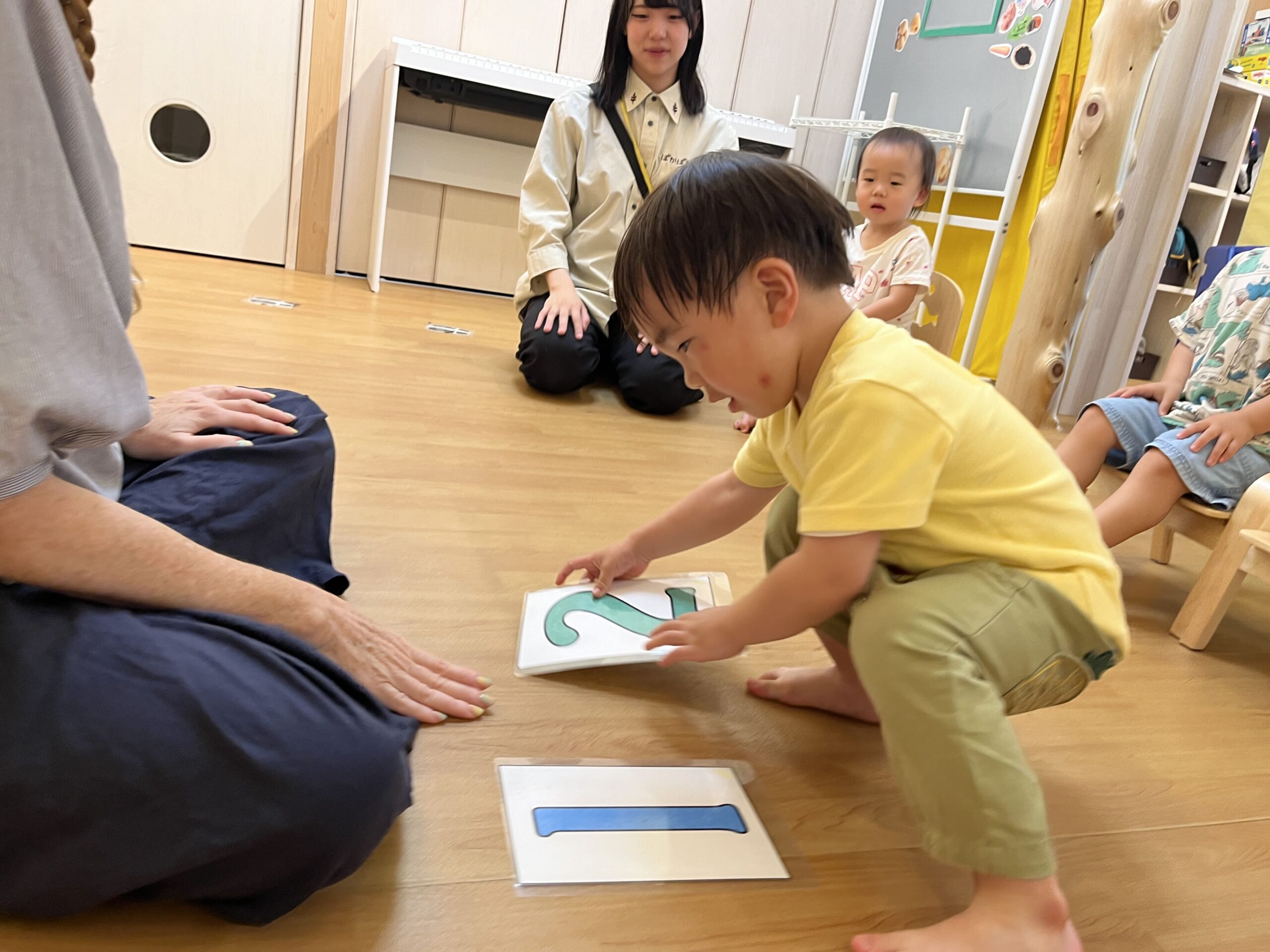 保育室には数字カードがばらばらに散らばっていて、そこから「1、2、3…」と順番に並べる遊びに挑戦。でも、数字だけでは難しく感じたようで一瞬手が止まってしまいました。そこで先生が「グリーン!」と声をかけると、「緑だ!」とピンときた子がサッとカードを取りに。色と英語がヒントになるなんて、驚愕のひらめきの瞬間でした!