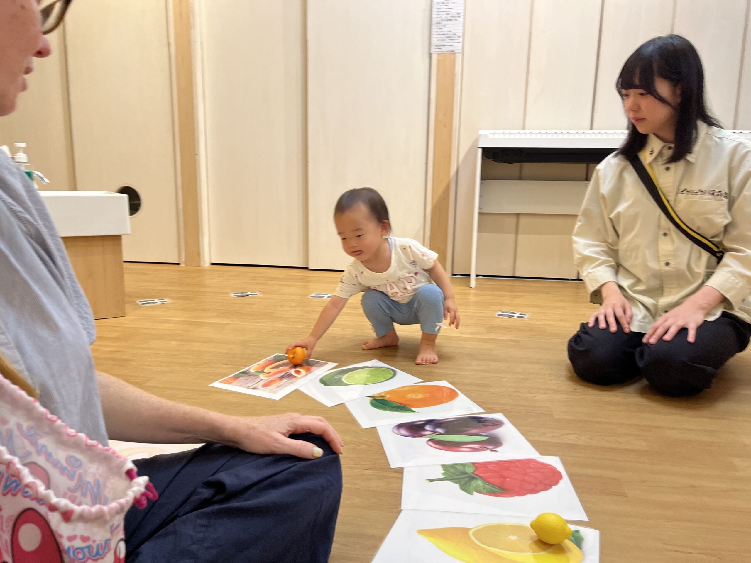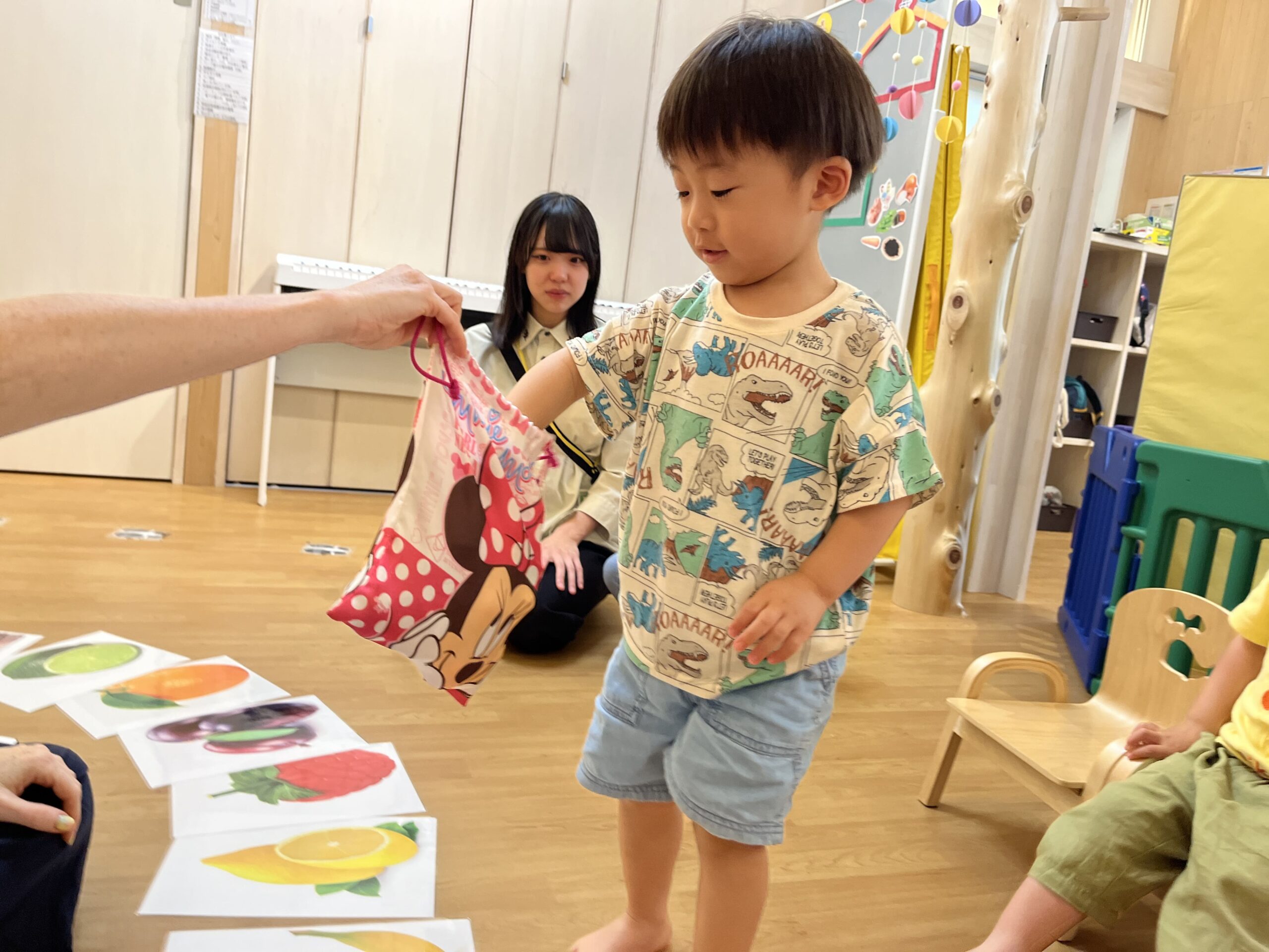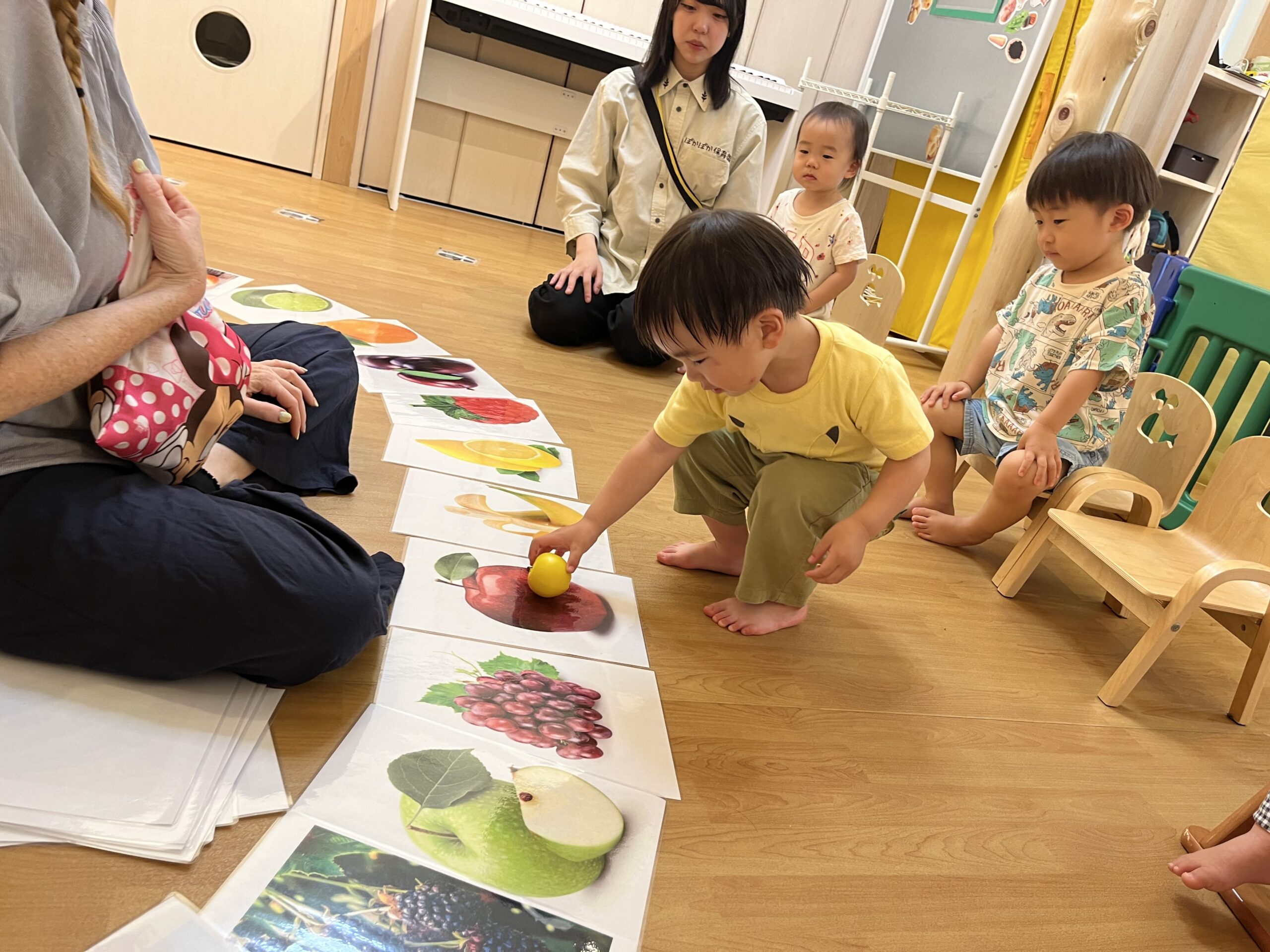 次に出てきたのは、果物のカード。「アップル!」「バナナ!」と英語で言ってみる姿はまるで小さな探検家。袋から本物そっくりの果物のおもちゃが出てくると、迷わず正しいカードの上にポン!ついこの前まで「これなあに?」と聞いていたのが、今では自分で言葉と意味を結びつけて動けるようになったんだね。成長に、私たちも思わず笑顔になります。