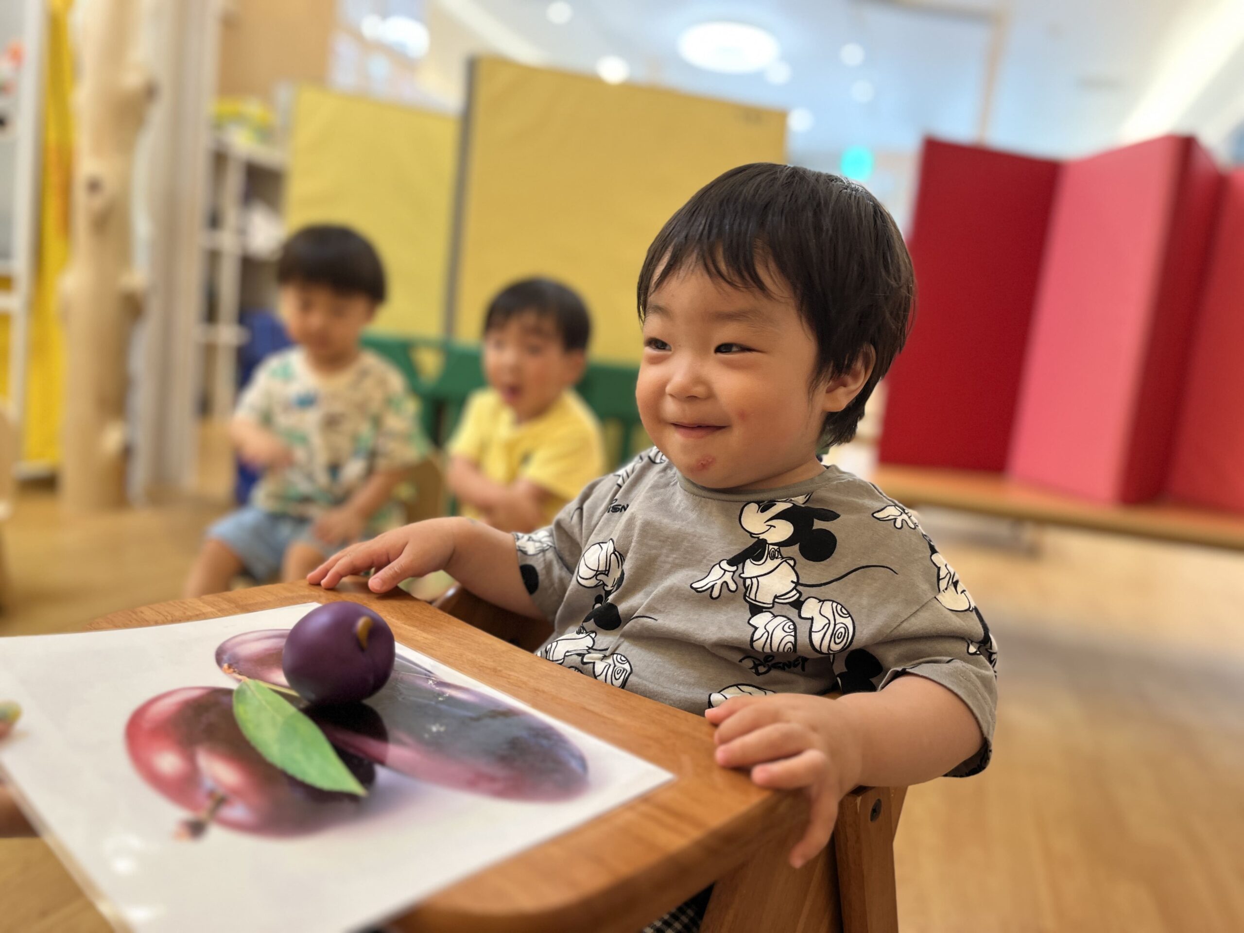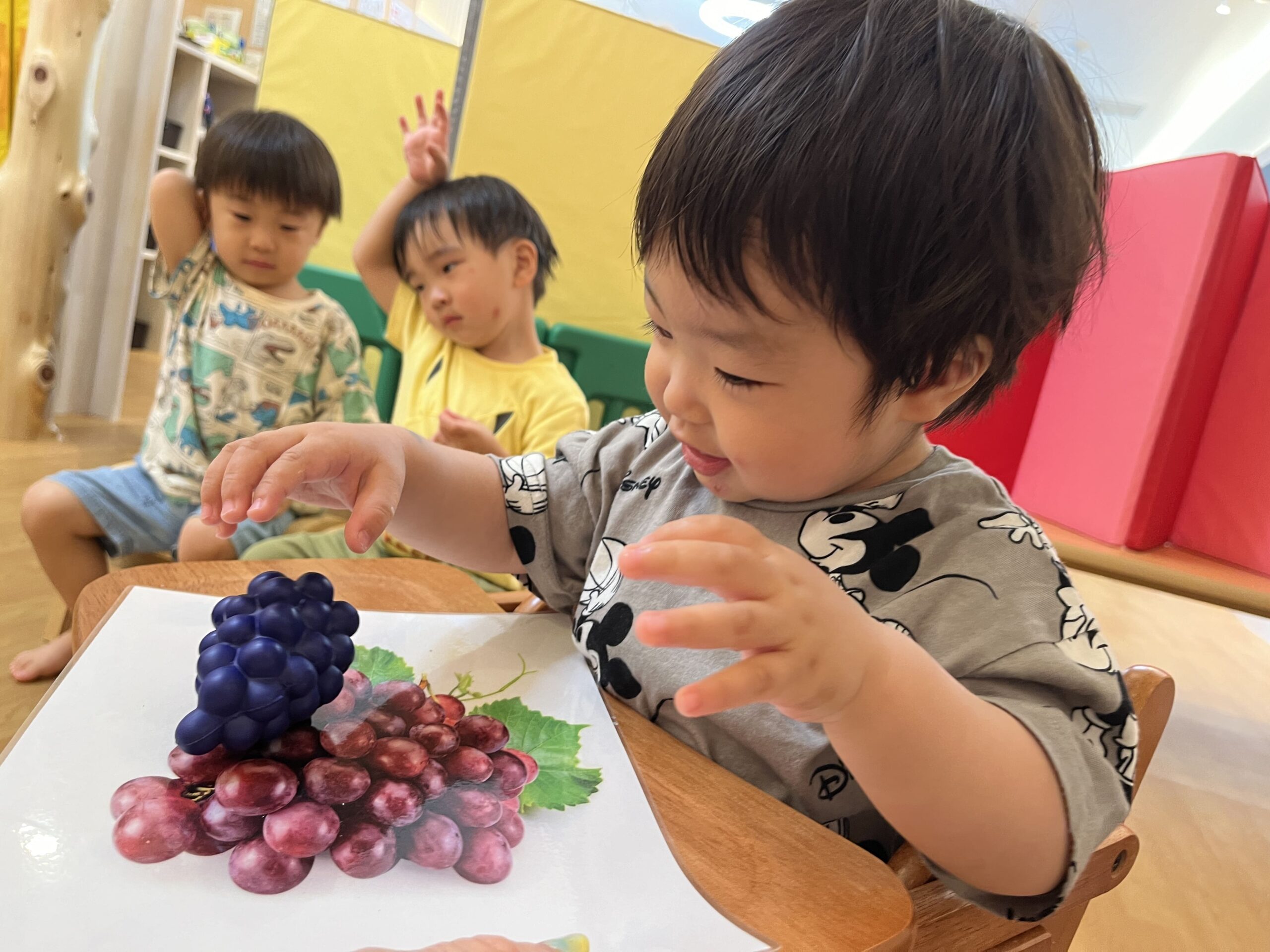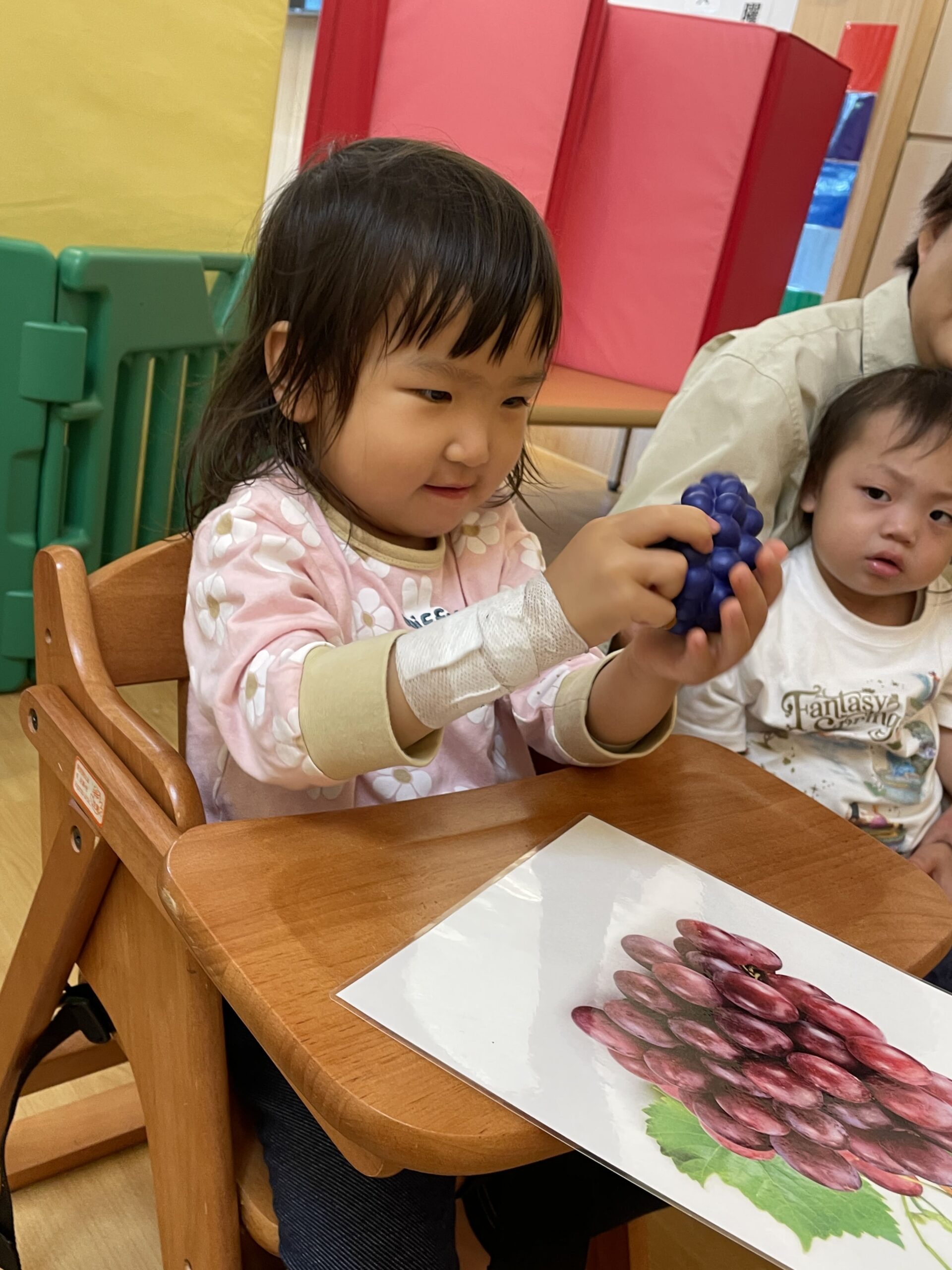 次に出てきたのは、果物のカード。「アップル!」「バナナ!」と英語で言ってみる姿はまるで小さな探検家。袋から本物そっくりの果物のおもちゃが出てくると、迷わず正しいカードの上にポン!ついこの前まで「これなあに?」と聞いていたのが、今では自分で言葉と意味を結びつけて動けるようになったんだね。成長に、私たちも思わず笑顔になります。