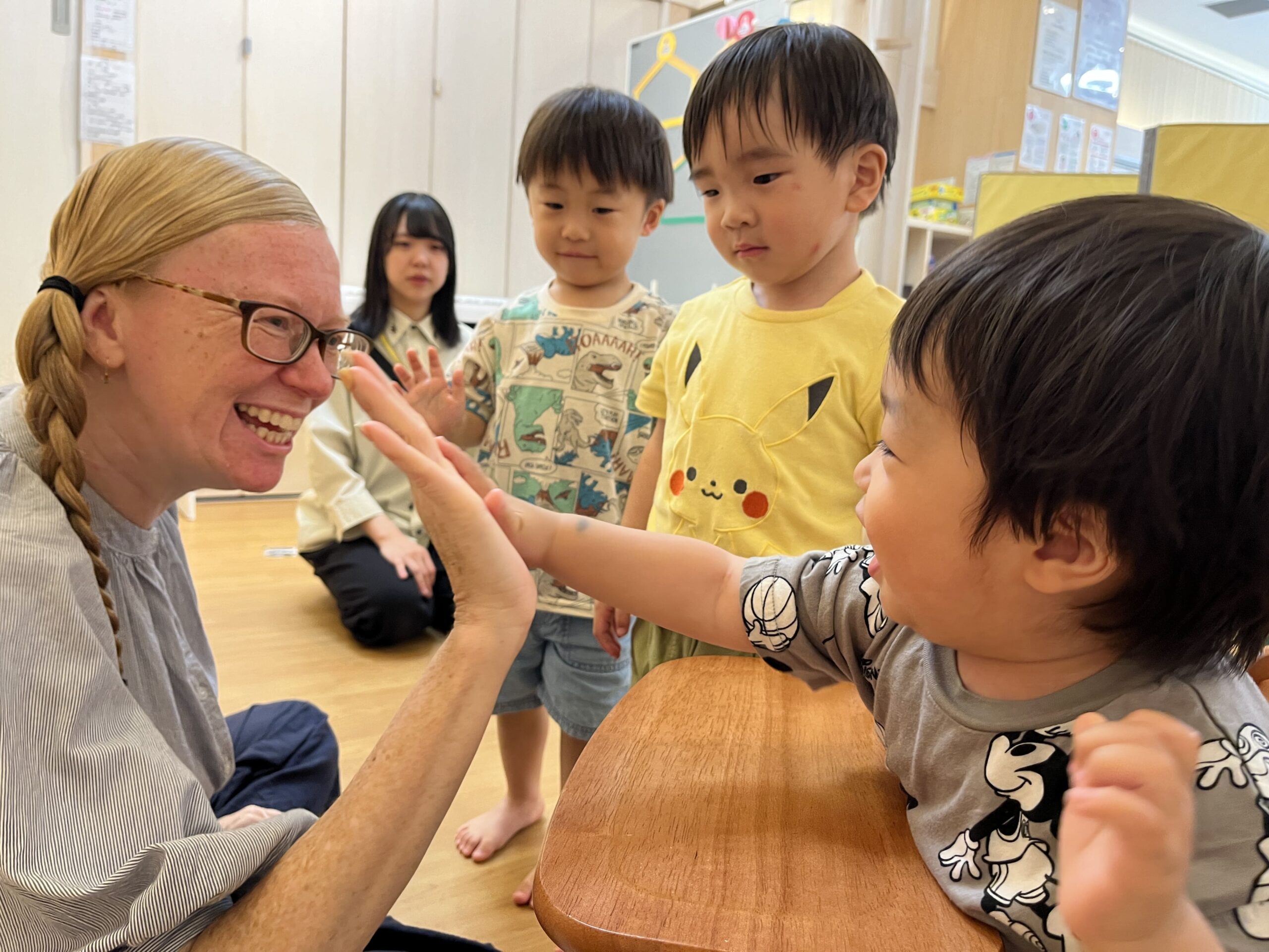英語遊びの時間がスタートすると、みんなお馴染みの「ハローソング」で身体を揺らしながら自然に輪の中へ。英語の音に親しむこの時間、実は0〜2歳の言葉の吸収にとっても大事なひとときです。