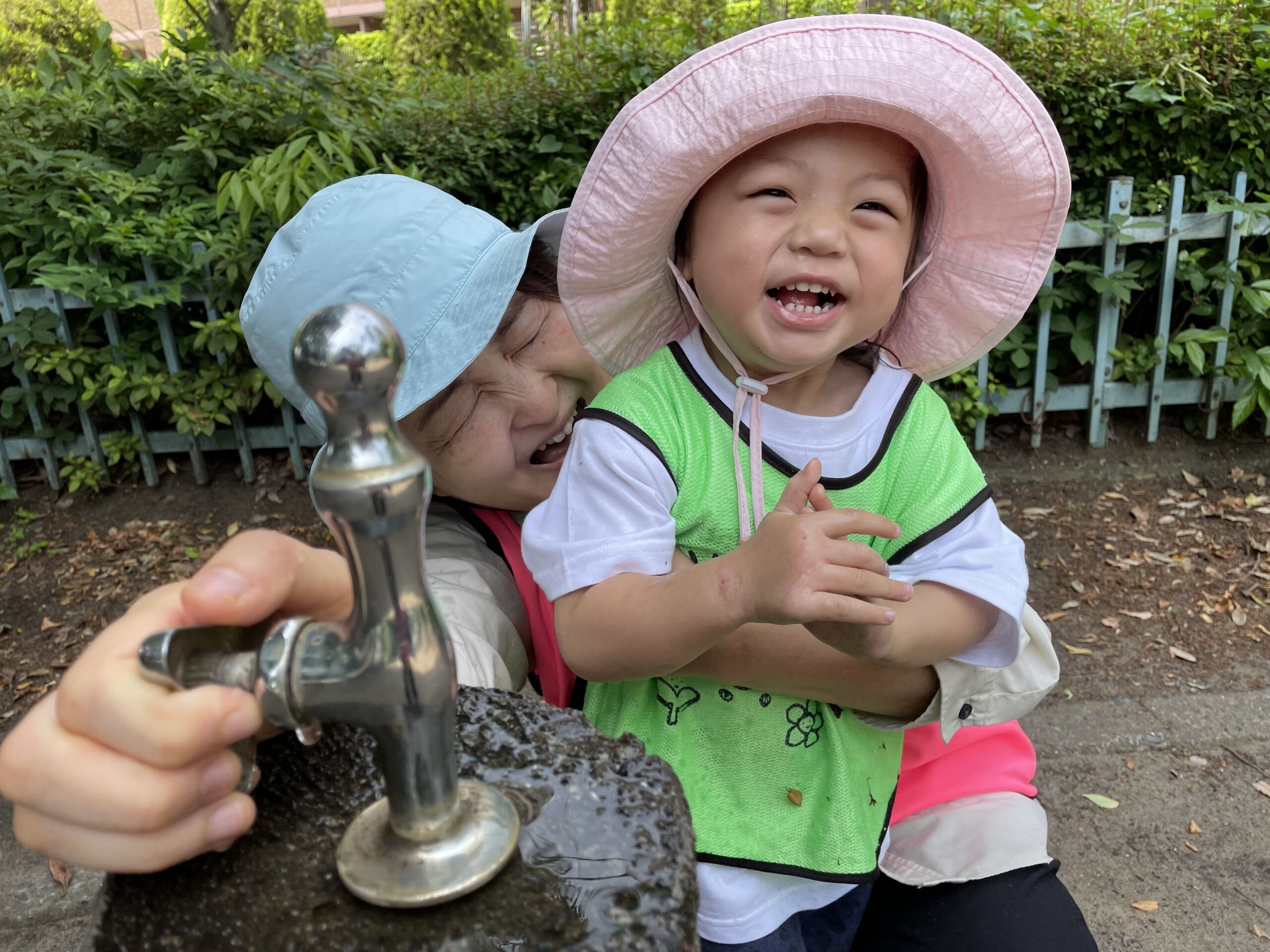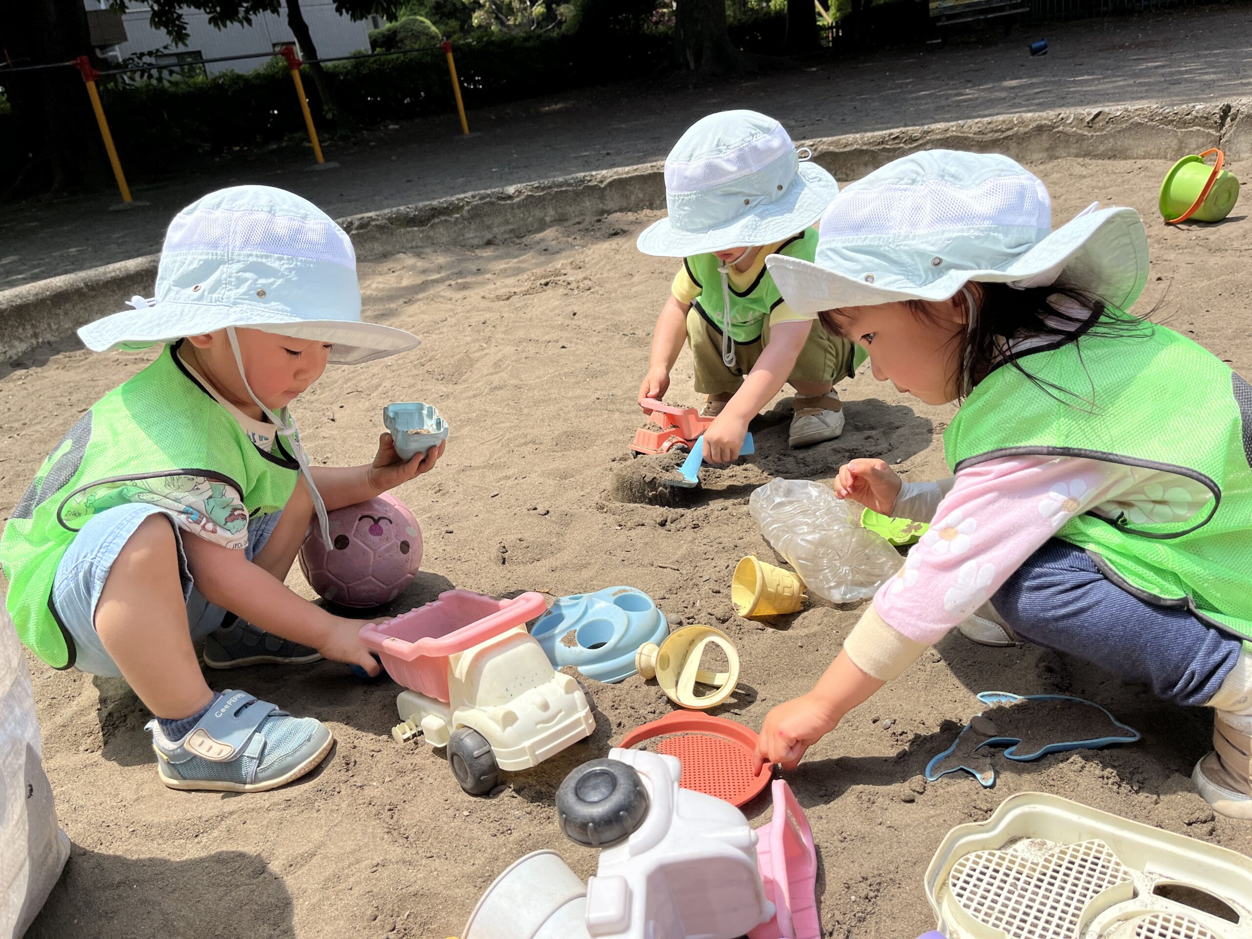 避難訓練の後はお待ちかねの公園へ!暑さが増しているためこまめな水分補給をとりながら、子どもたちは元気いっぱいに砂場へ。
