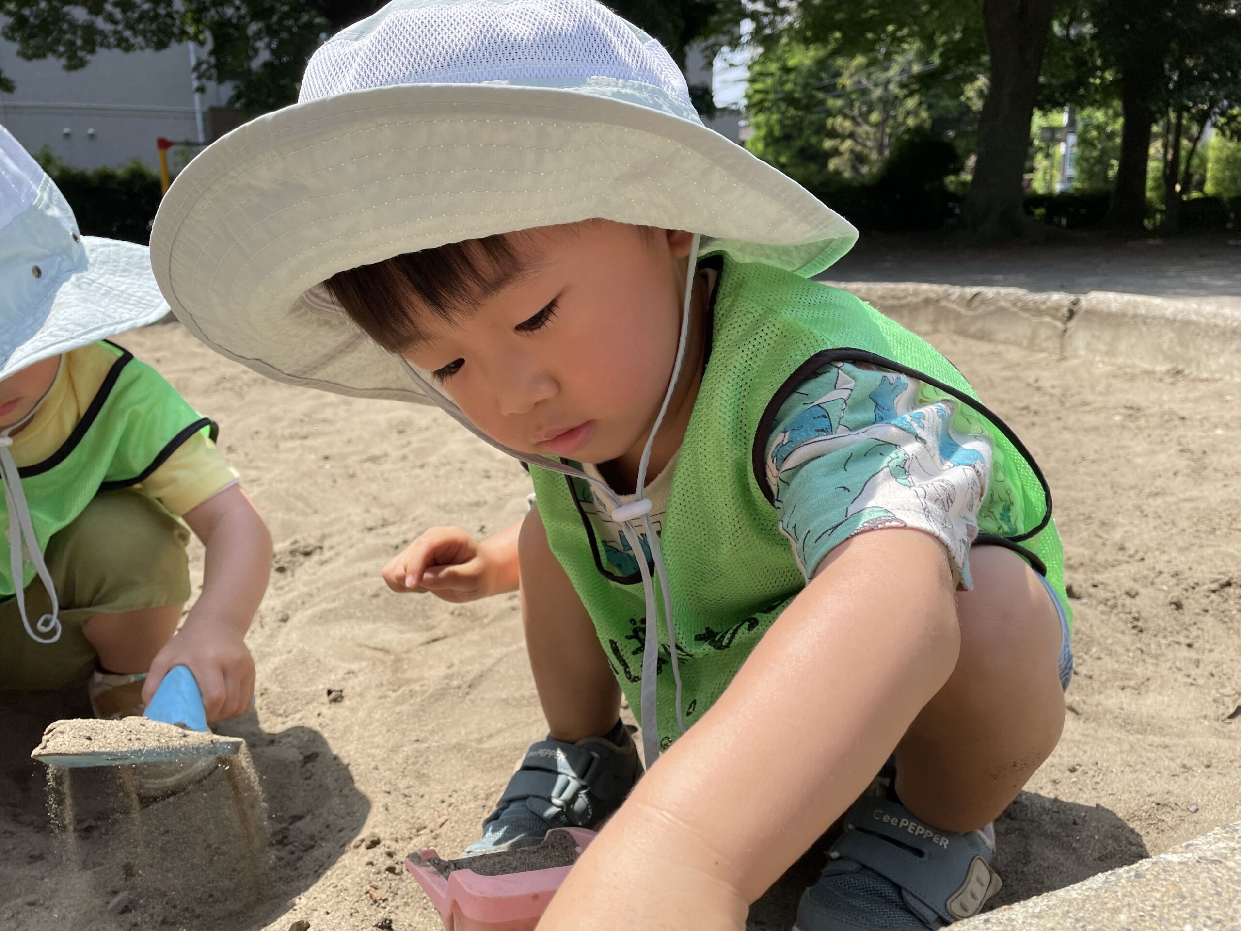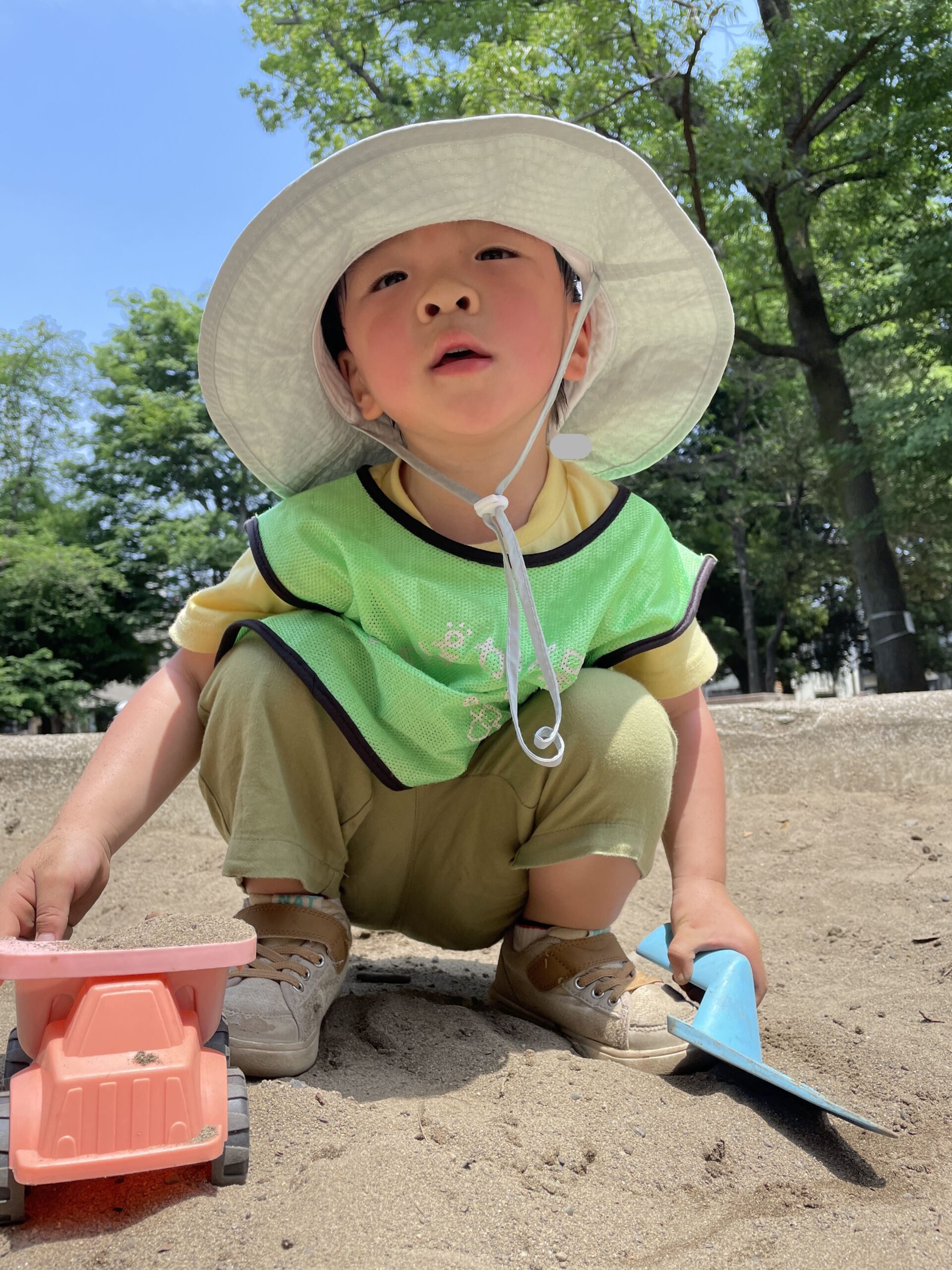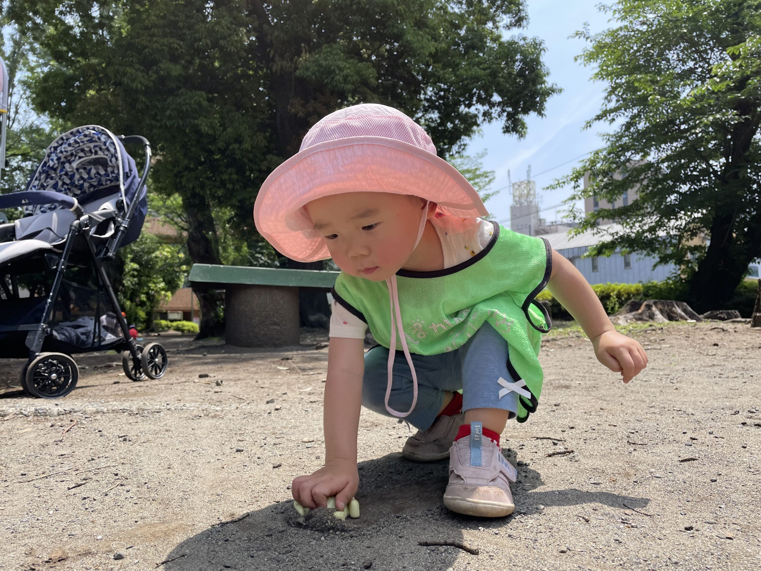 お揃いのダンプカーに砂をのせて「いくよー!」と仲良く走らせたり、砂場の端っこでアリの巣を発見して「これなあに?」「ありさん!」と嬉しそうに教えてくれる姿に癒されました。