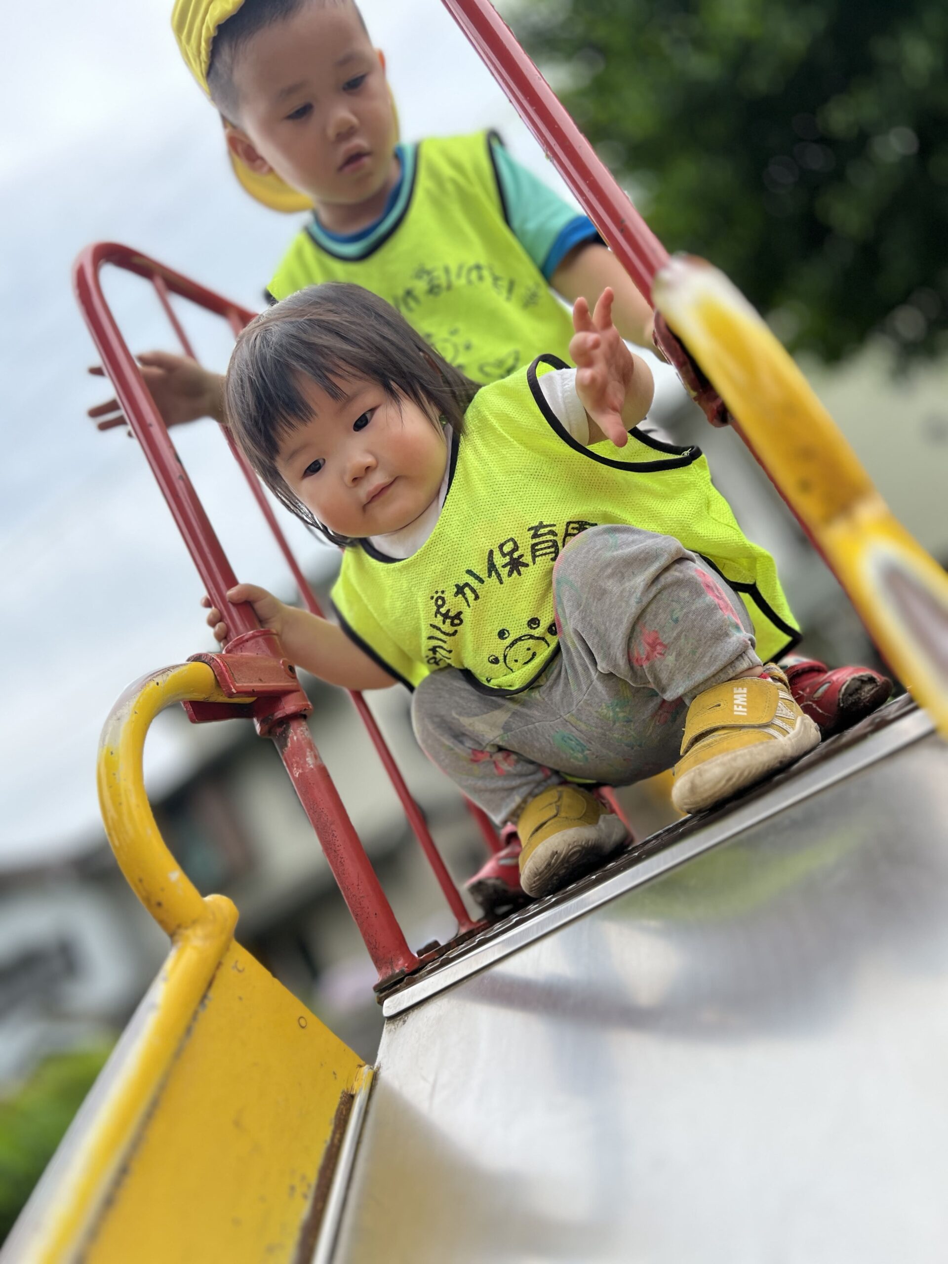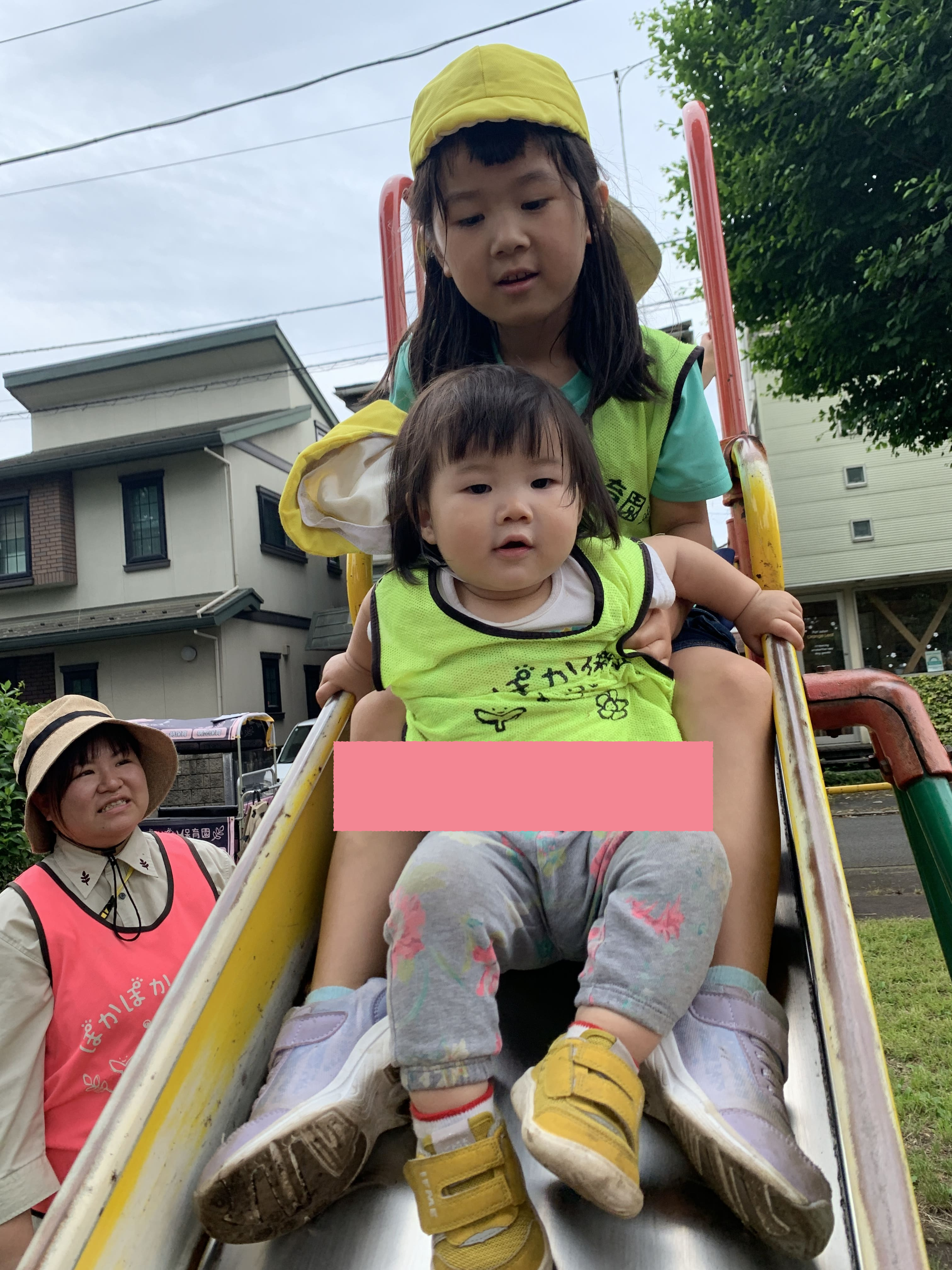 すると、そばにいた5歳の姉さんが、 「だいじょうぶ?うしろでおさえてあげる」 と優しく支えてくれました。 「すごい!じょうずにすべれたね!」と、 すべり終えた1歳児さんは にこにこ笑顔で大喜び♪
