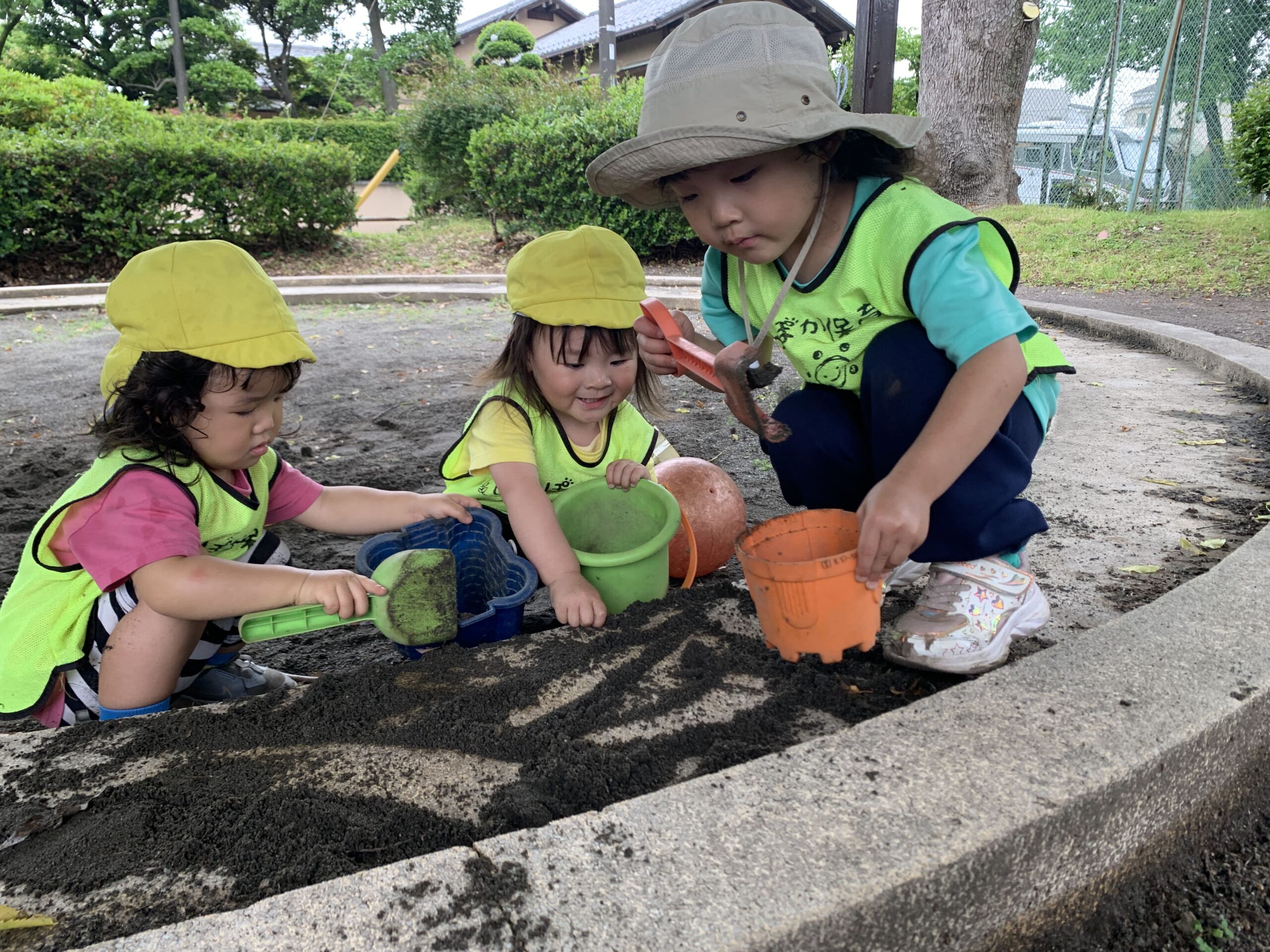 砂場では、お山作りやごっこ遊びも大盛り上がり。 「ケーキつくったよ!たべて~」 「これ、おさらだよ!」と、 想像力いっぱいの遊びが広がりました。