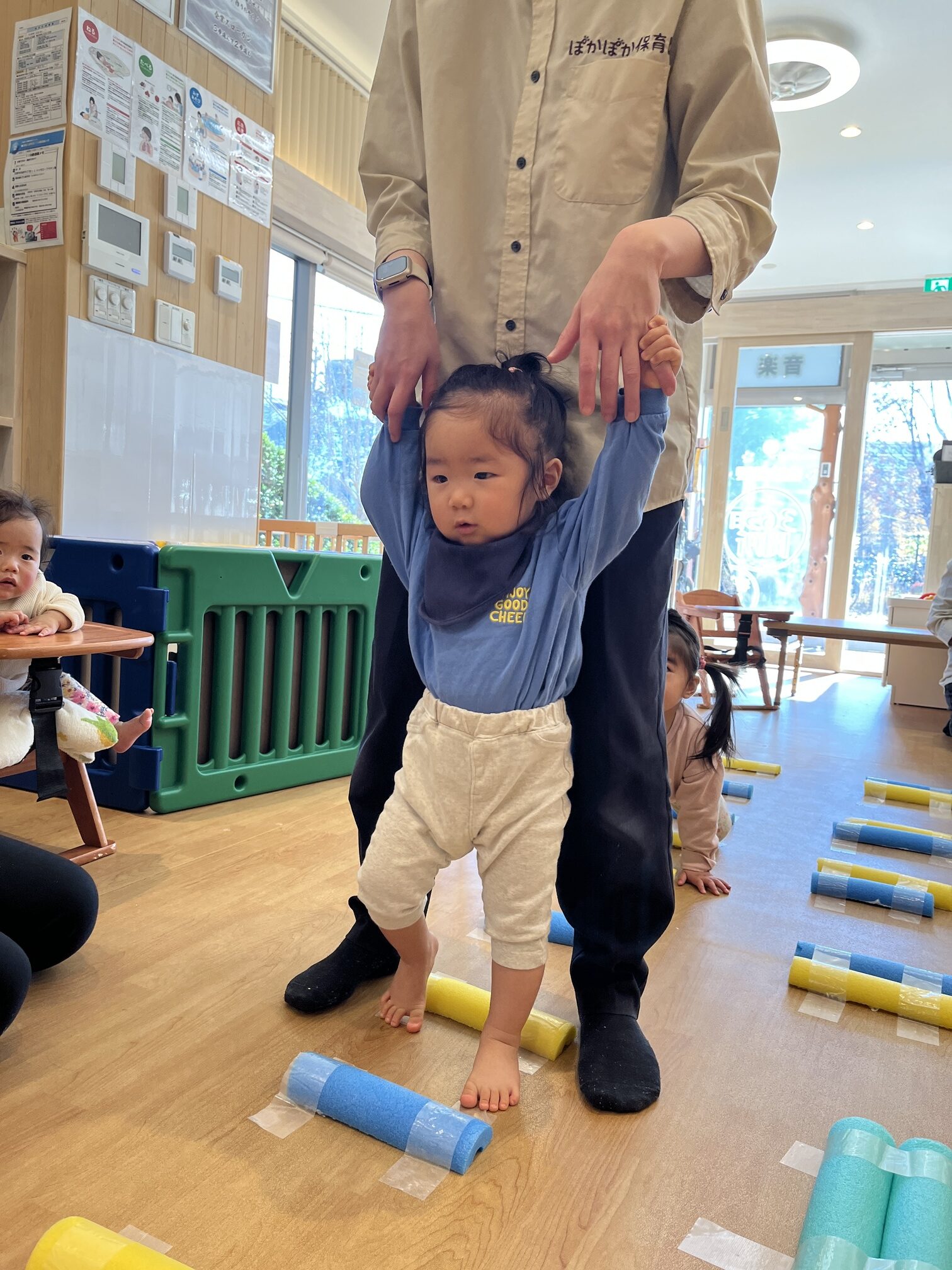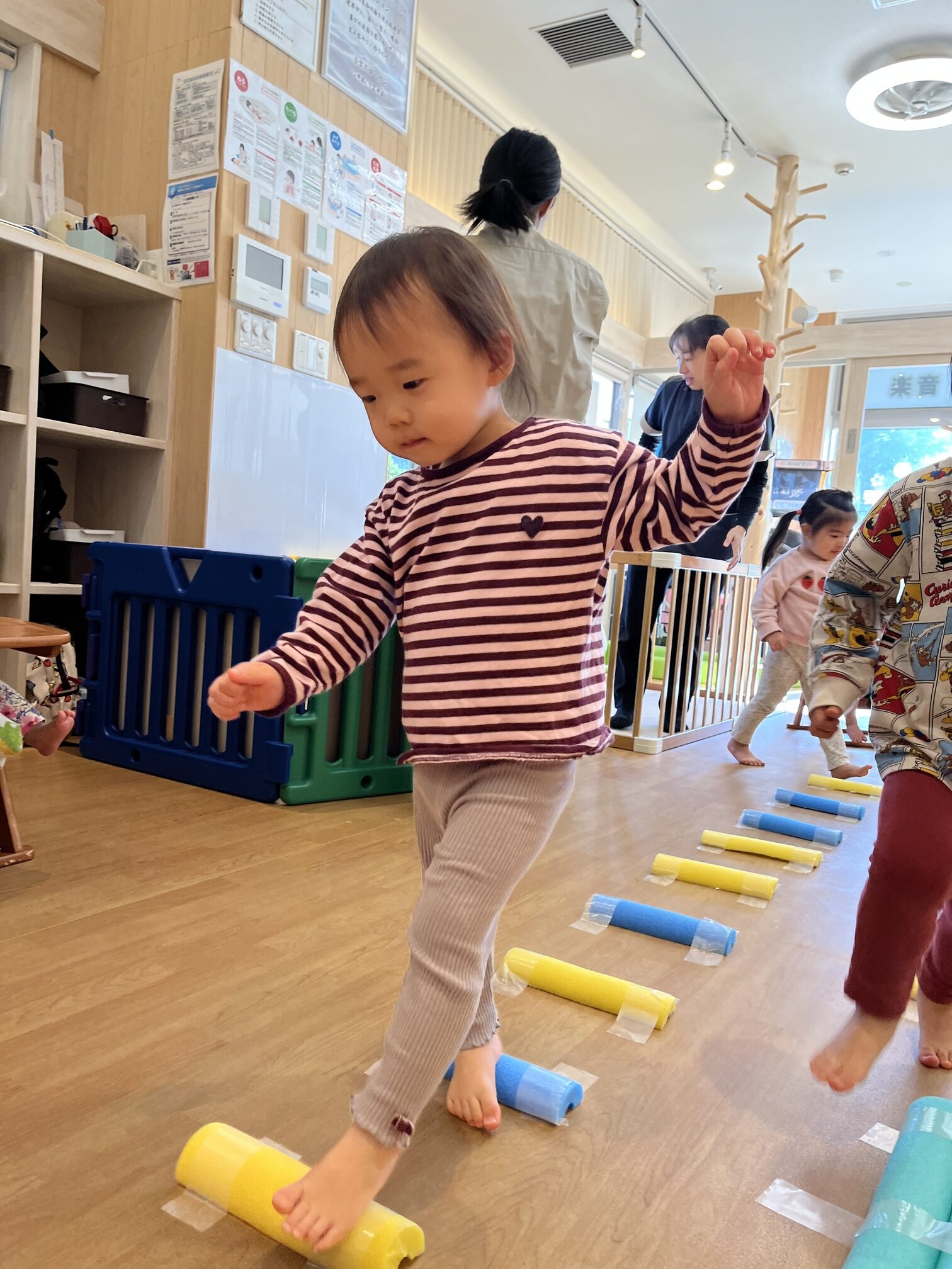 勢いよく渡る子は「トントン!」とリズムに乗り、慎重に渡る子は「そろーり、そろーり」と足先に意識を集中。0歳児は先生と手をつないで「いっちに、いっちに!」と声を添えると、表情がふっとゆるんで安心して楽しめました。