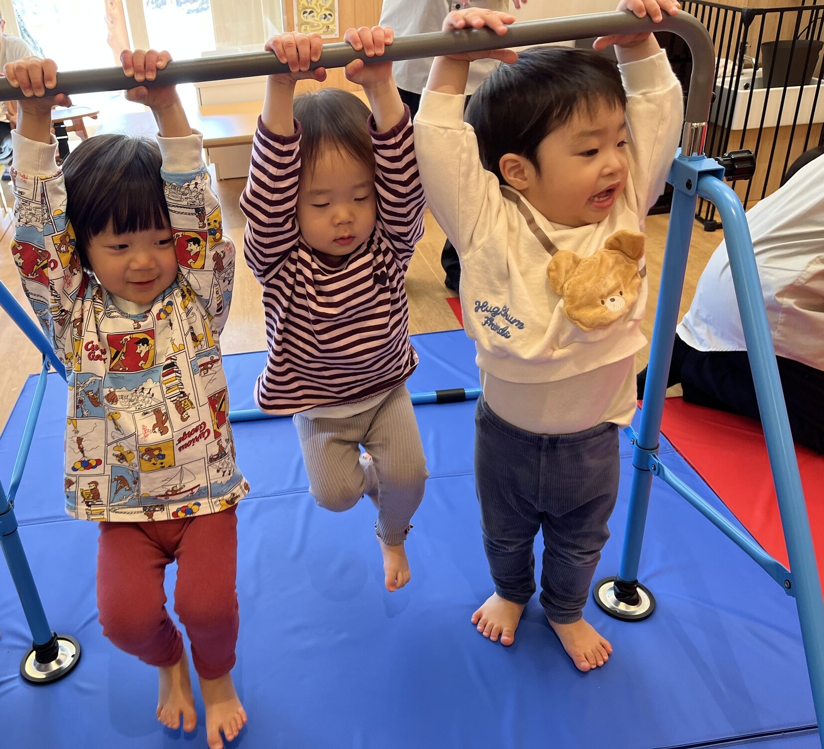 続いて鉄棒を設定し、先生が「順番はどうする?」と聞くと、2歳さんが「ならぶ!」と列づくりに参加。自分の番になると、子どもたちは鉄棒にぶら下がって「ゆらゆら!」と体を揺らして楽しみます。