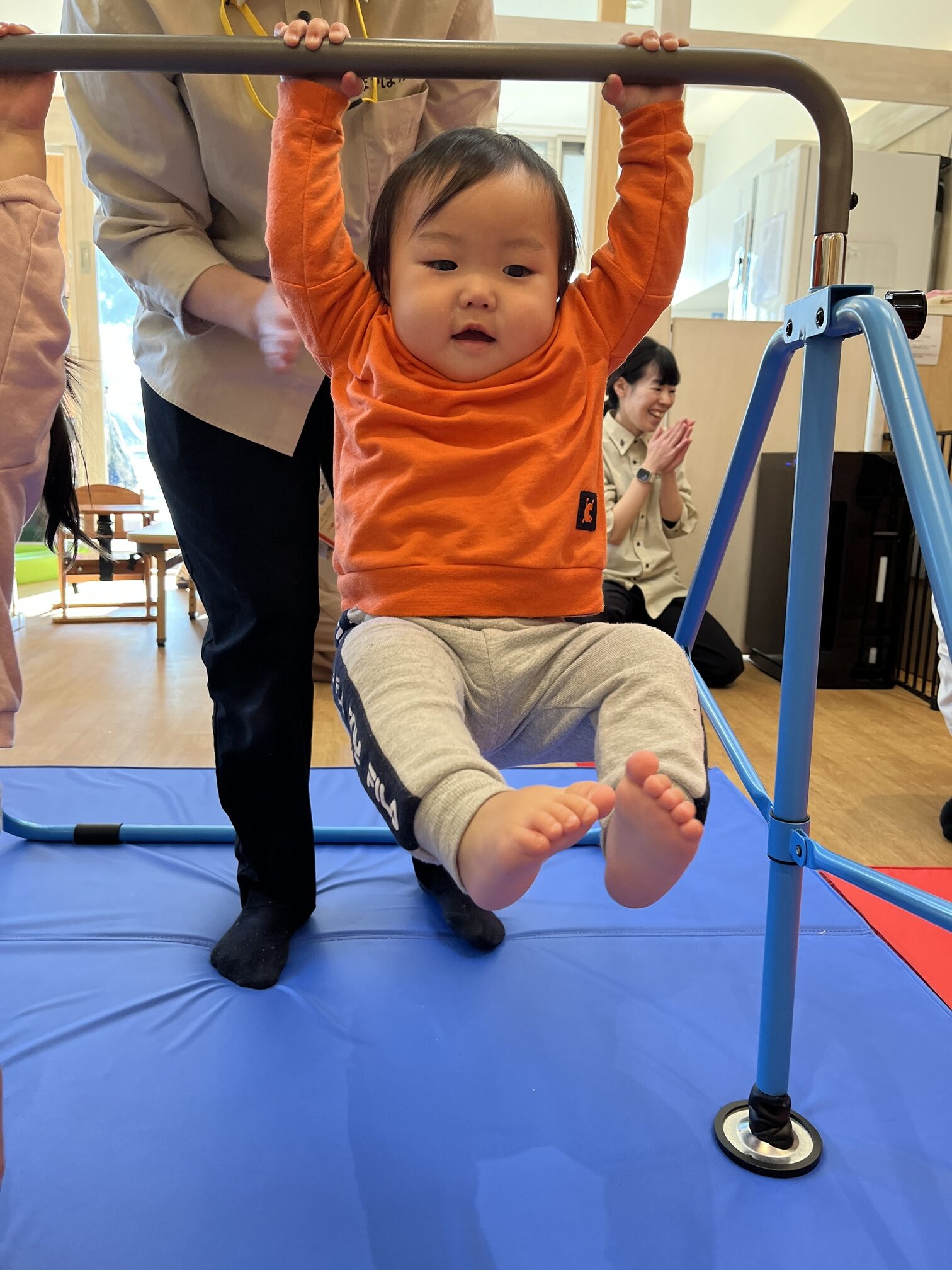 そして0歳児も鉄棒に挑戦!そっと補助すると、自分の力で数秒ぶら下がることができて、先生も「すごい!」と驚きと喜び。見ていた子どもたちからも「すごーい!」と拍手が起こりました。
