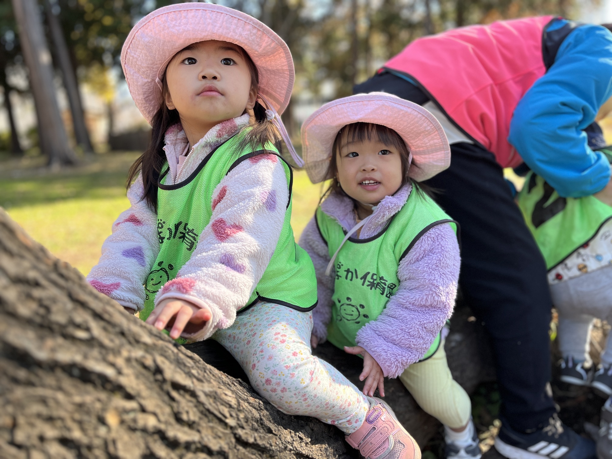 ぽかぽかサークルの後は公園へ。落ち葉を踏んで「カサカサ」、小石を拾って「つめたい」、切り株に触れて「ざらざら」。先生は「見つけたもの、見せてくれる?」と声をかけて、子どもたちが手のひらで見せてくれる小さな発見を受け止めます。道の端で「段差はどうする?」と聞くと、「よいしょ!」と片足ずつ乗り越える姿。自由散策の時間は、体の使い方とことば、好奇心が自然につながる豊かなひとときでした。