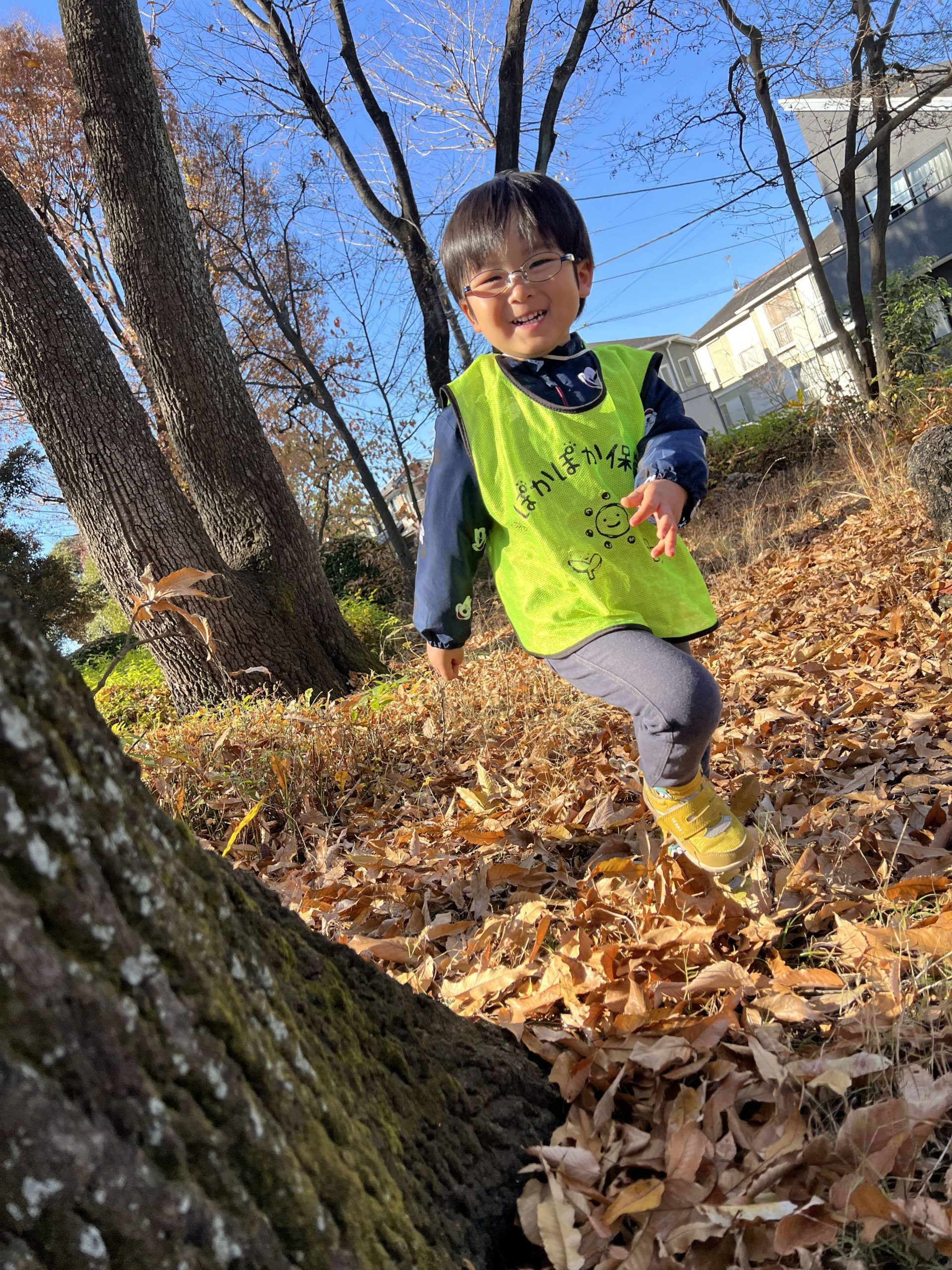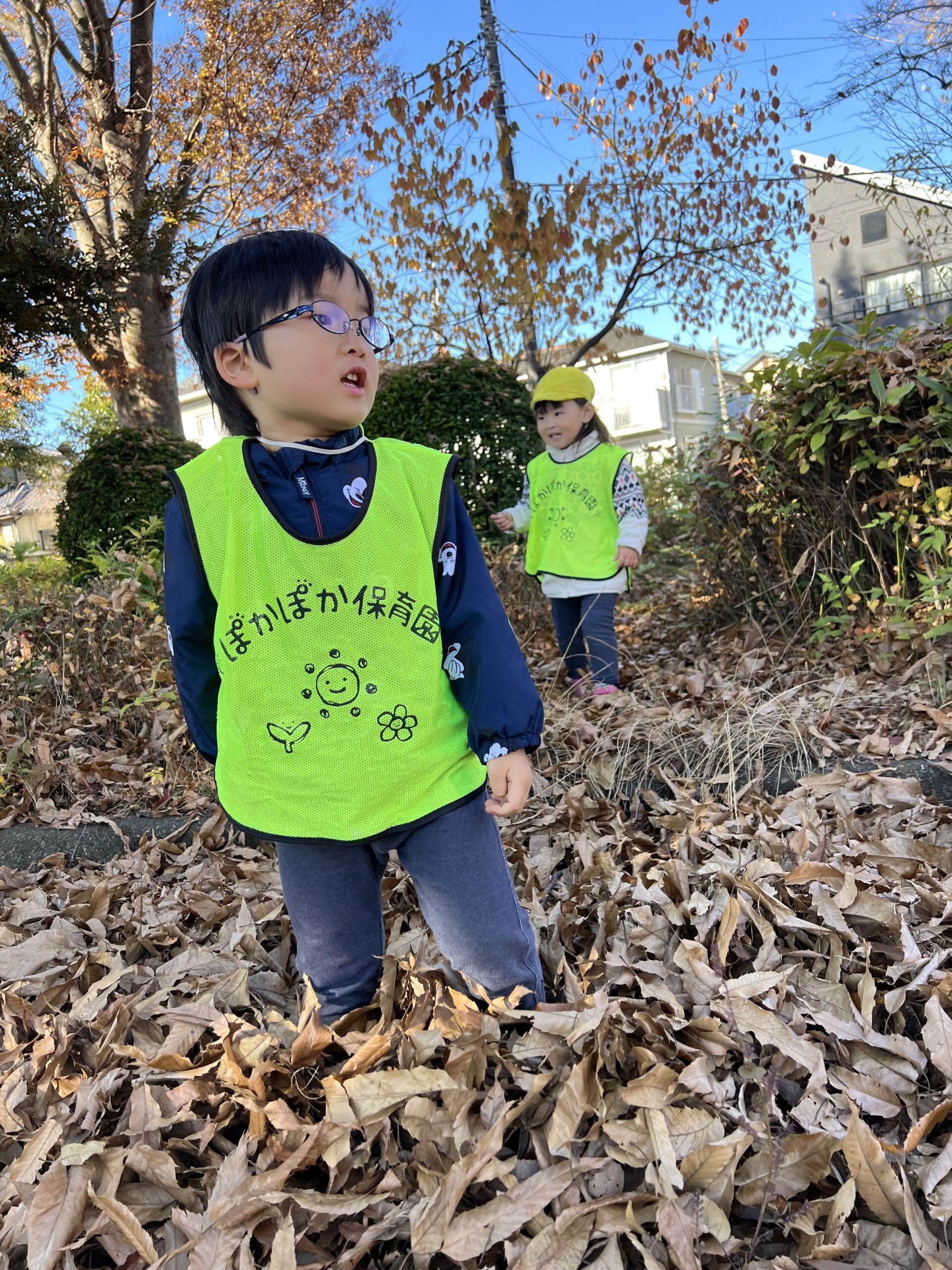 落ち葉の山に飛び込んだり、カサカサという音を立てて歩いたり、夢中になって遊ぶ子どもたち!