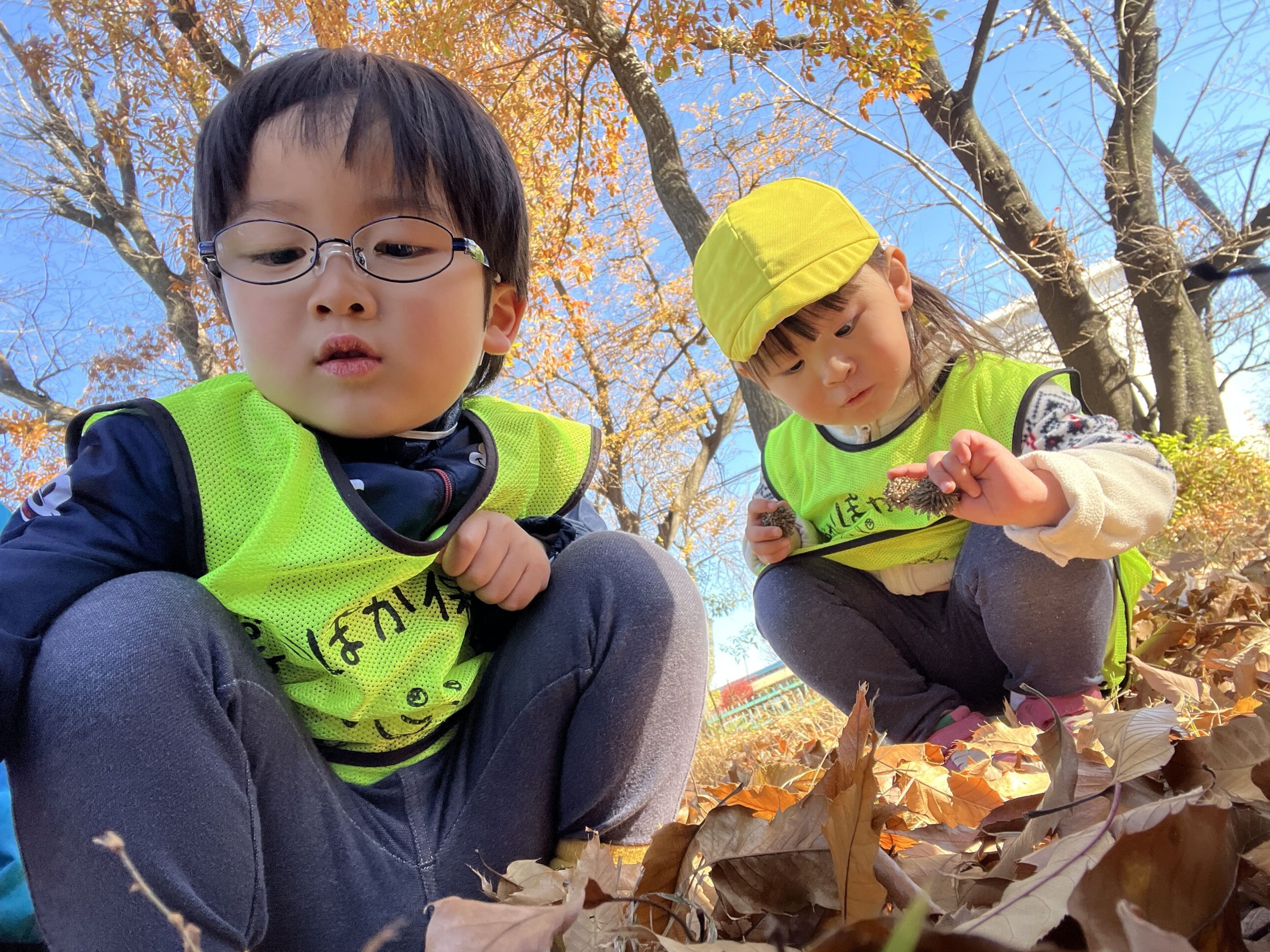 みんなで「秋の宝物探し」と称して、落ち葉やどんぐりを探しに探検に出かけました。