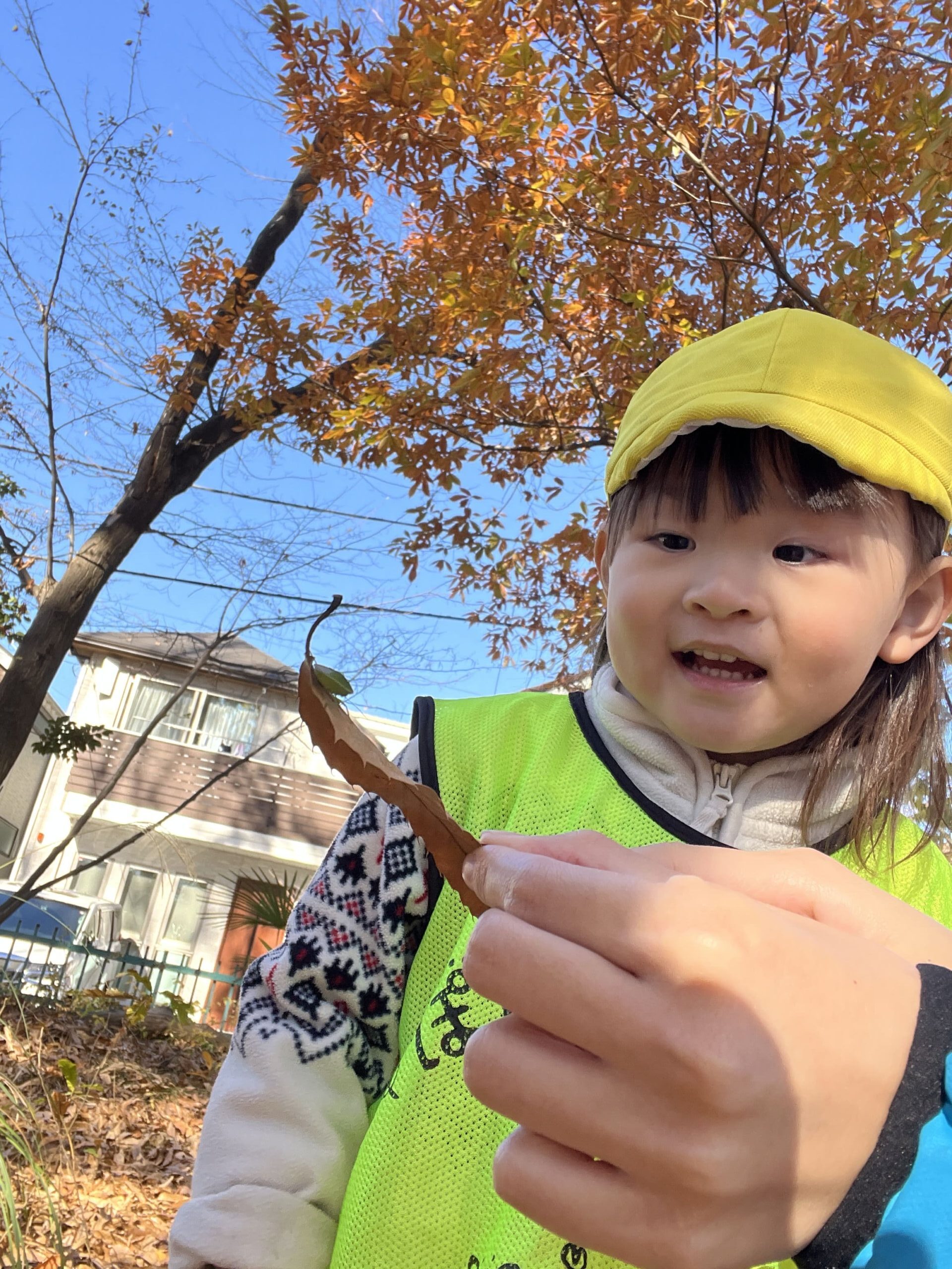 先生が「見てみて、きれいな葉っぱ!」と赤い葉っぱを拾い上げ、見せてくれました!