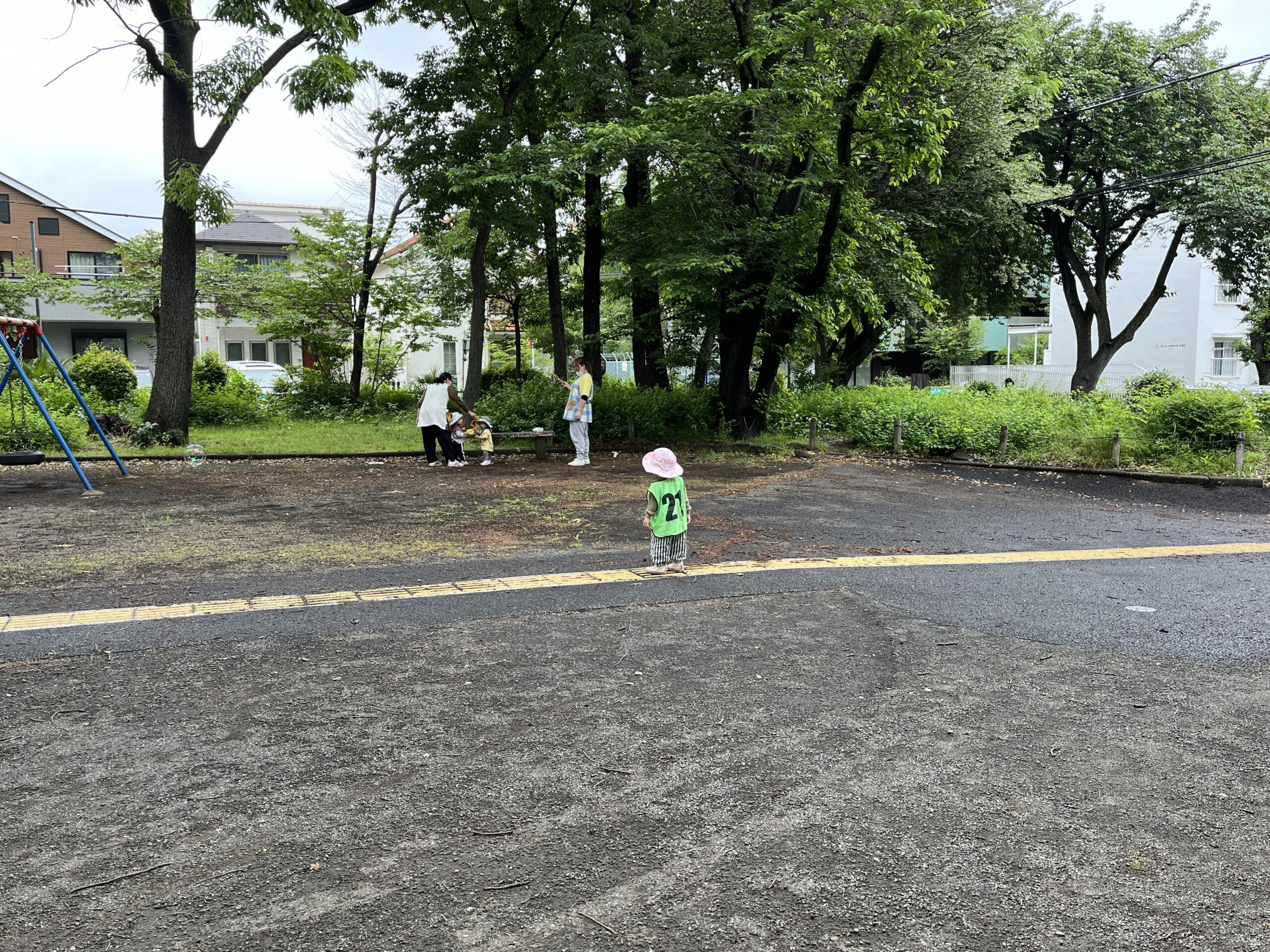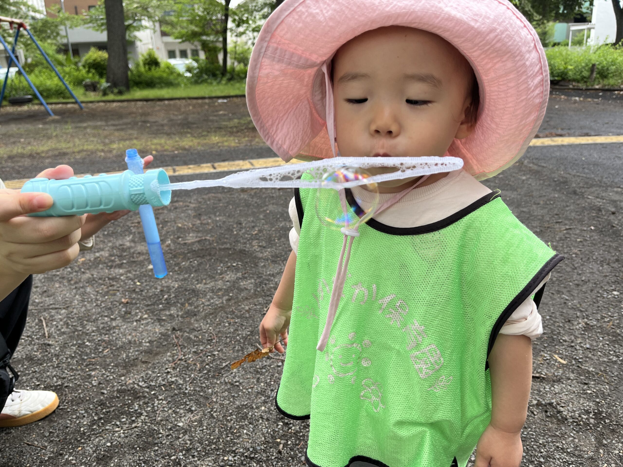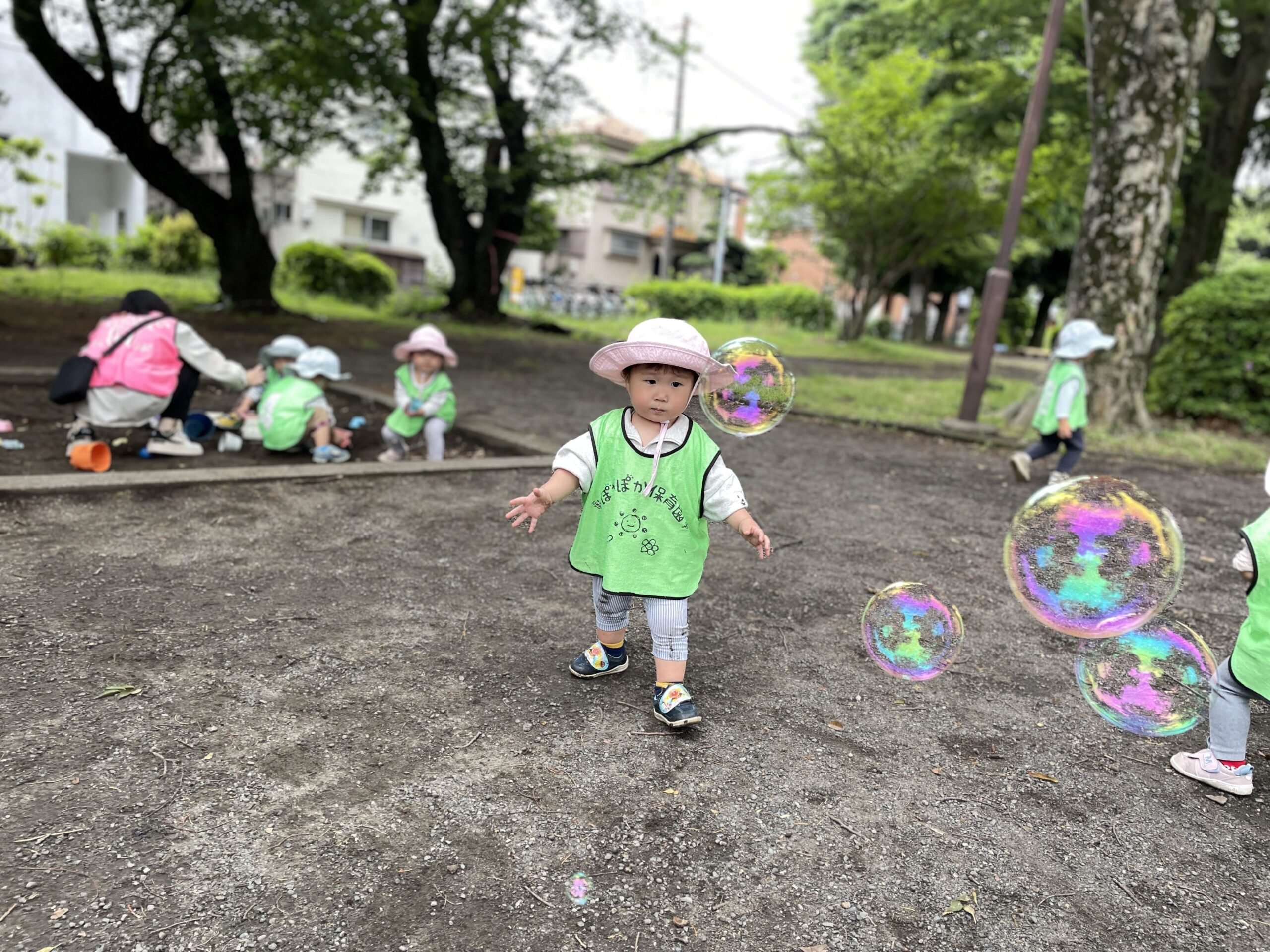 すると、近くにいた別の園のお友だちがシャボン玉をしているのを発見!!