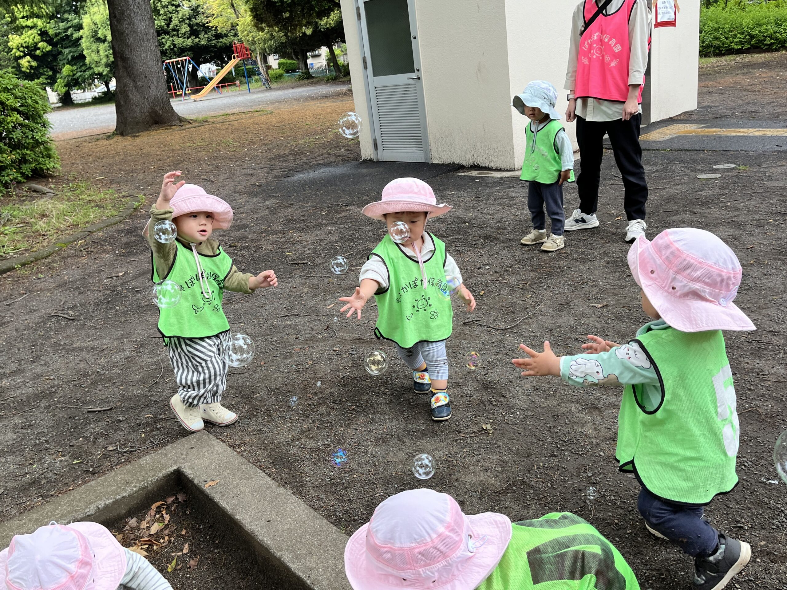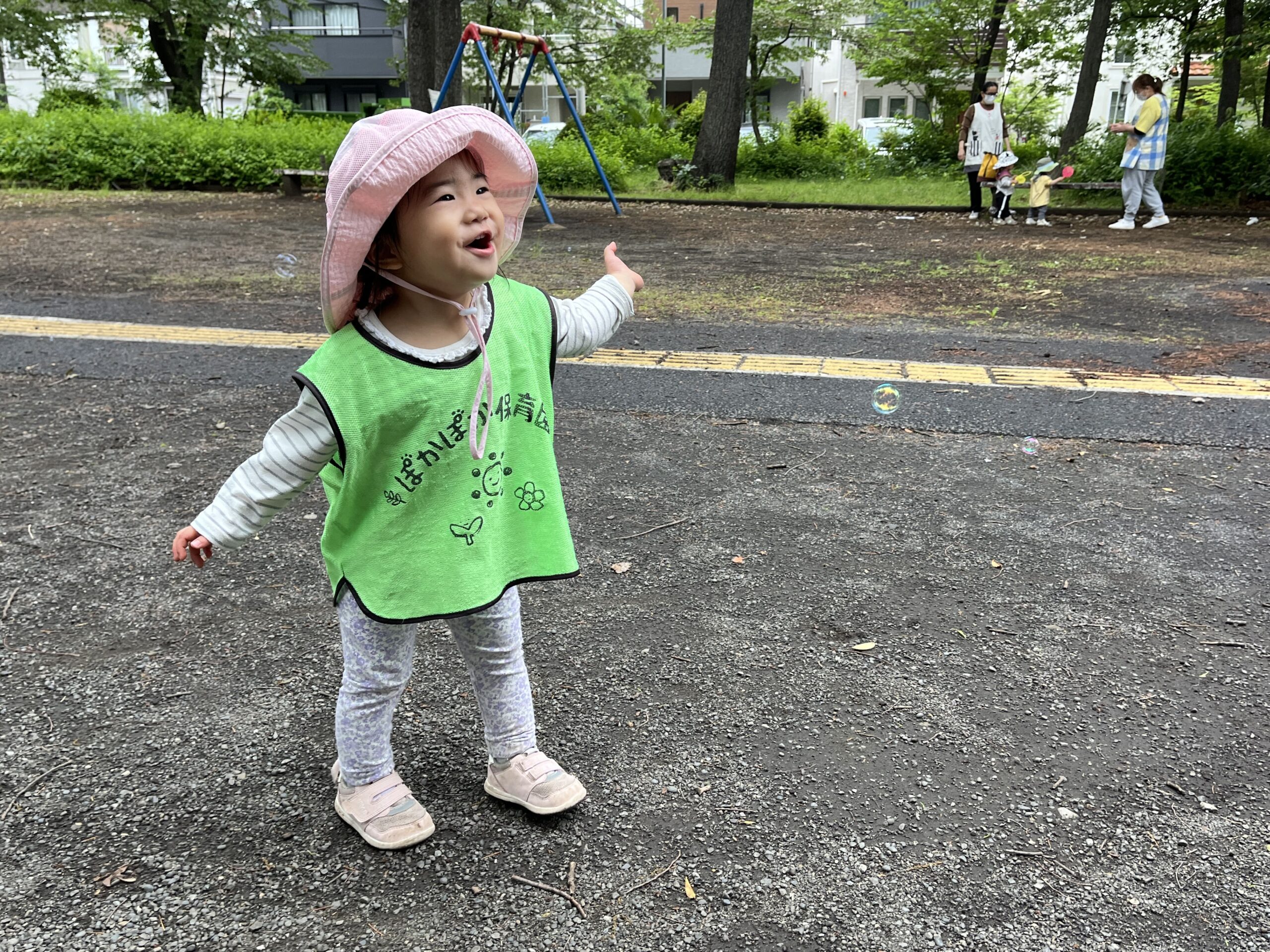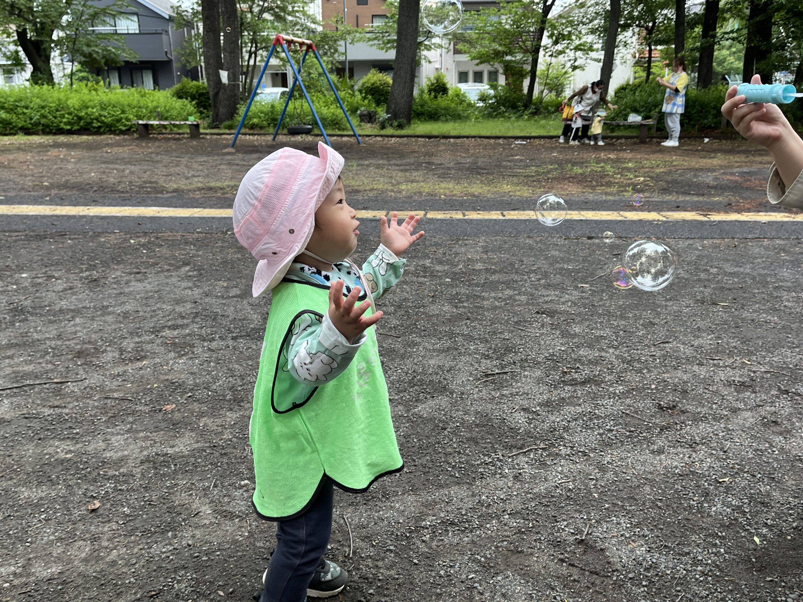 すると、近くにいた別の園のお友だちがシャボン玉をしているのを発見!!