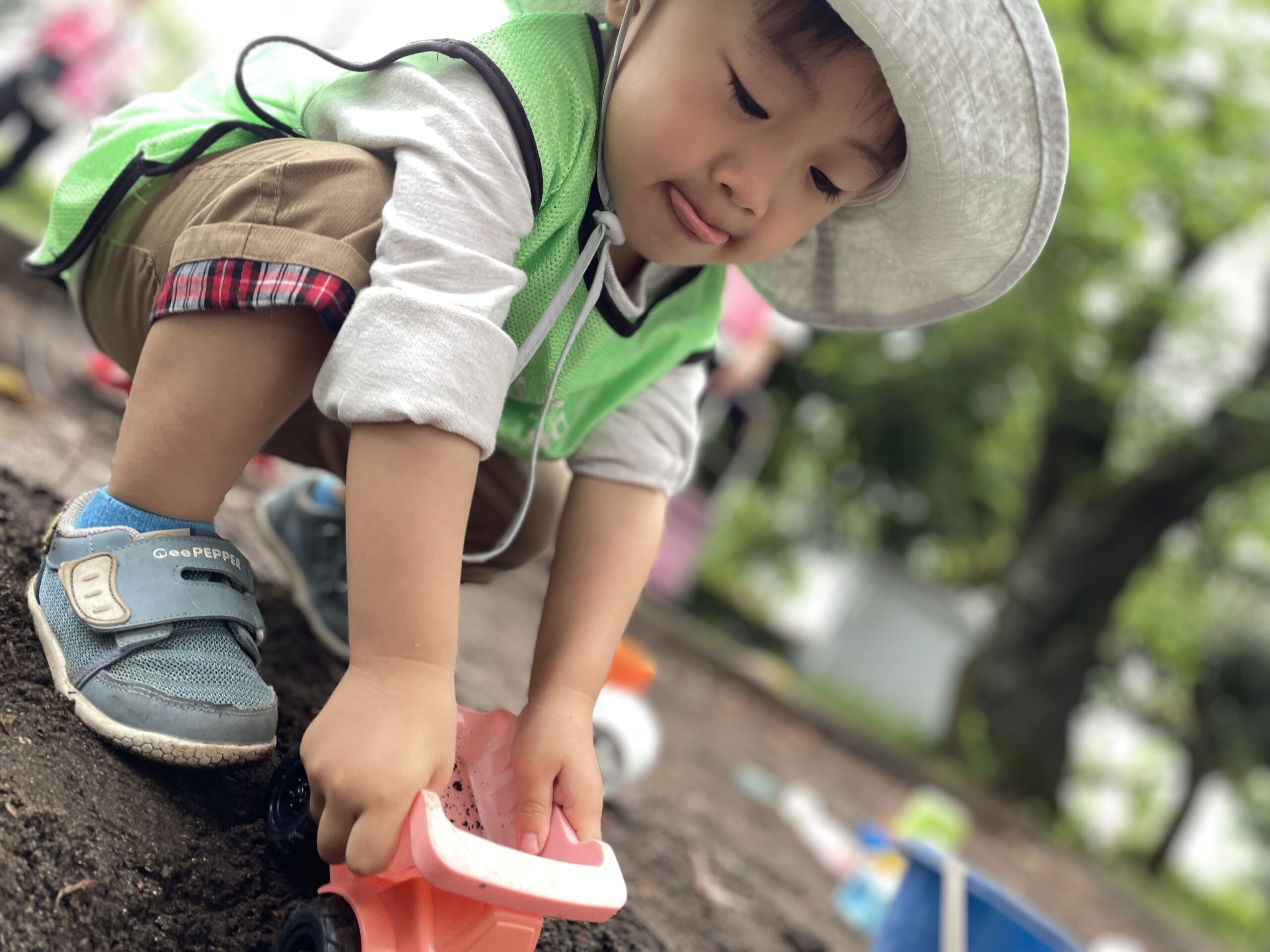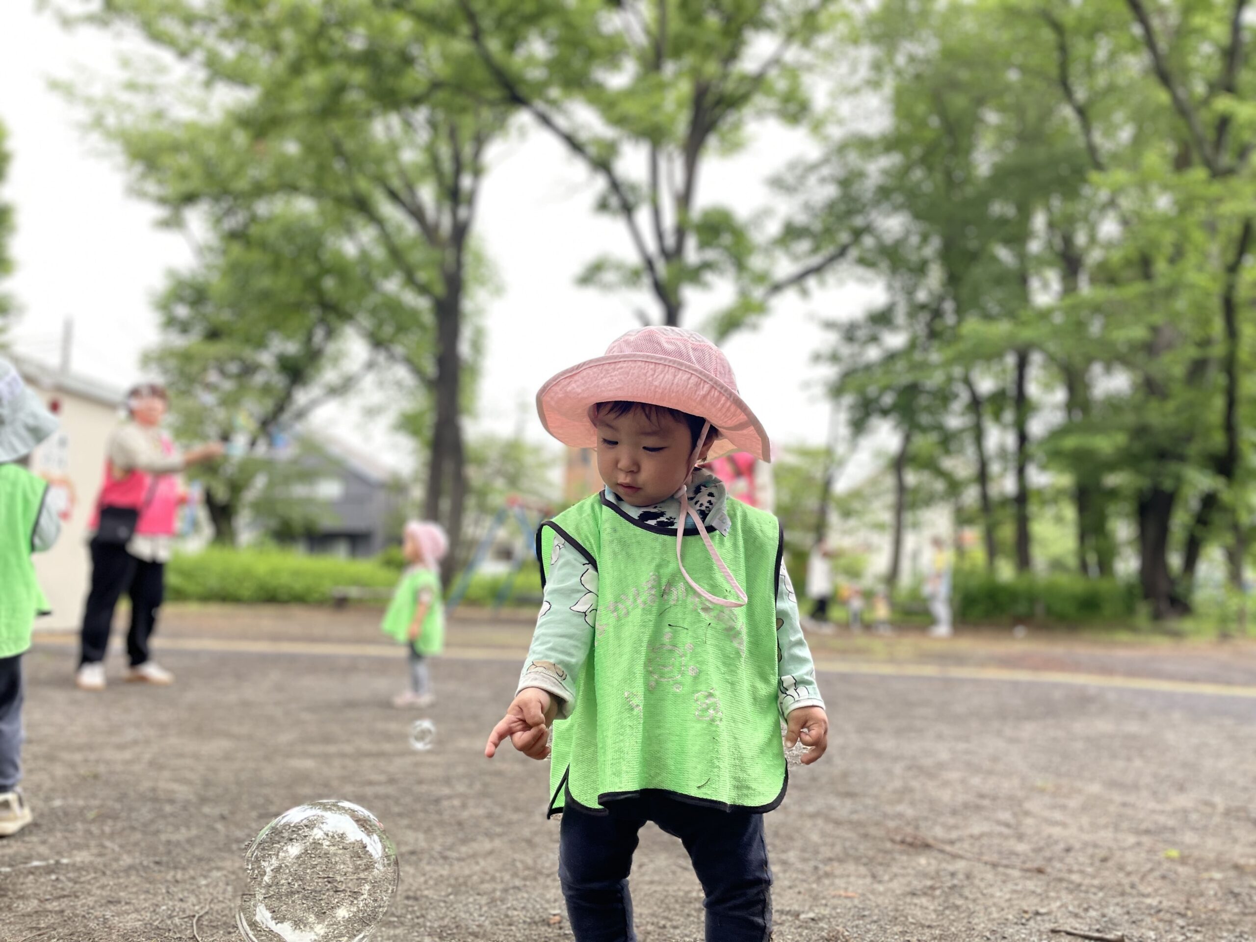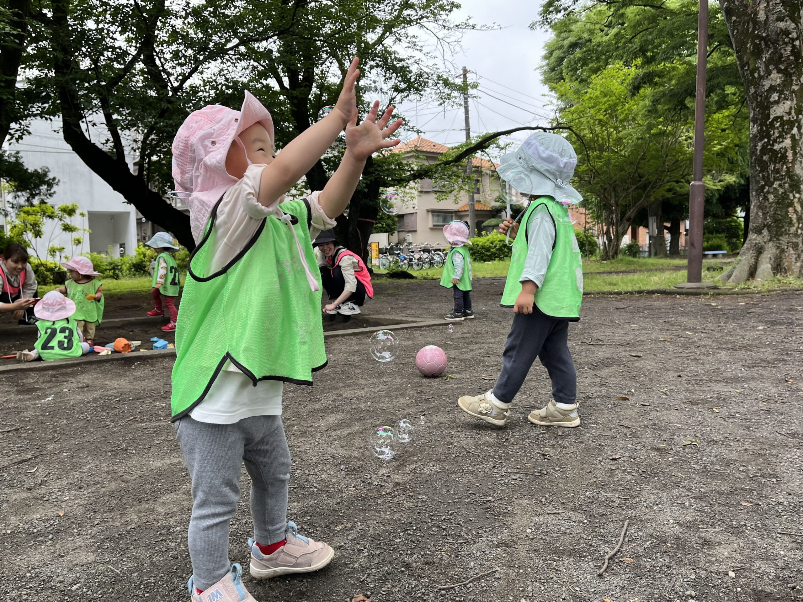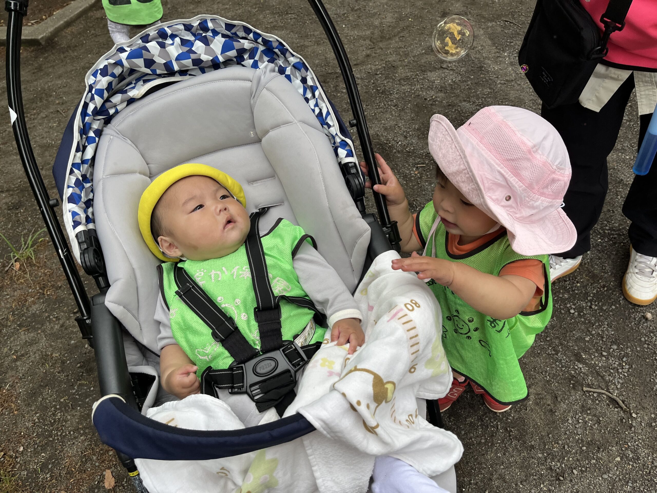 すると、近くにいた別の園のお友だちがシャボン玉をしているのを発見!!