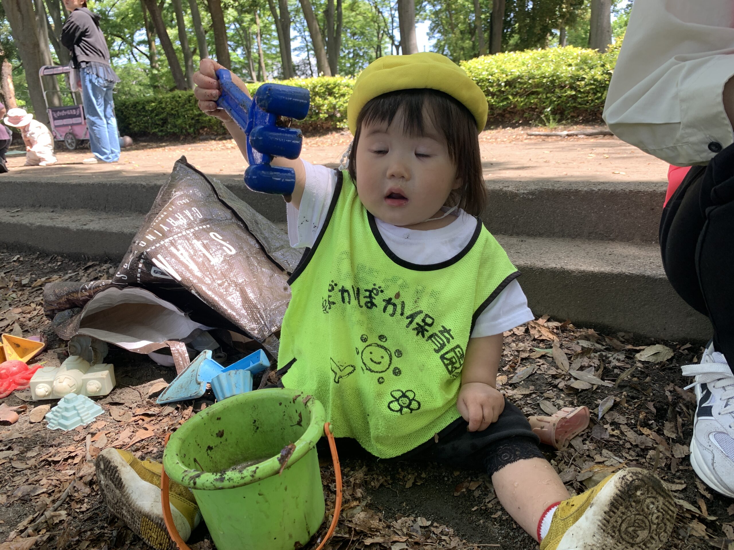 こっちでは。お砂場でバケツを片手に