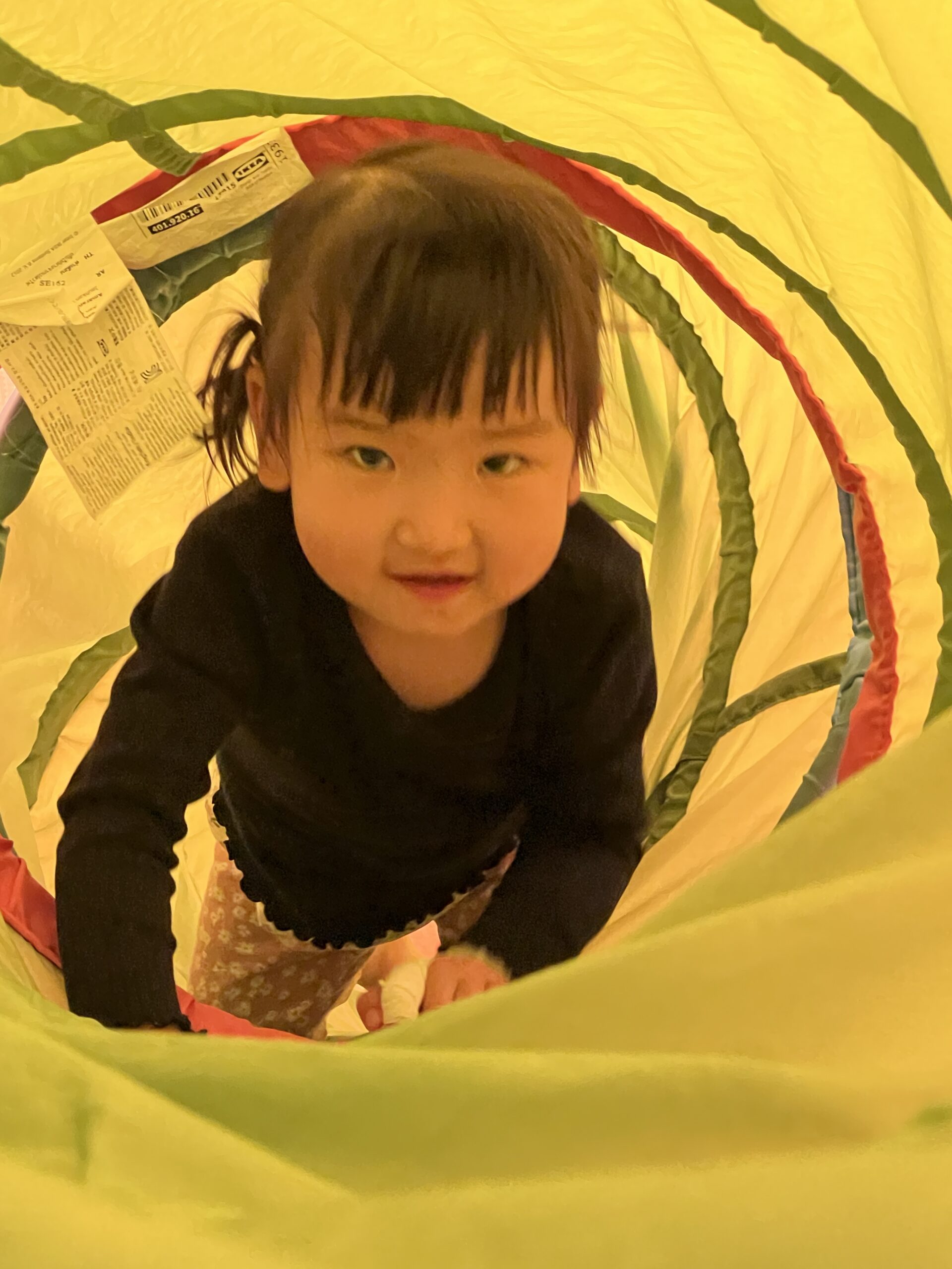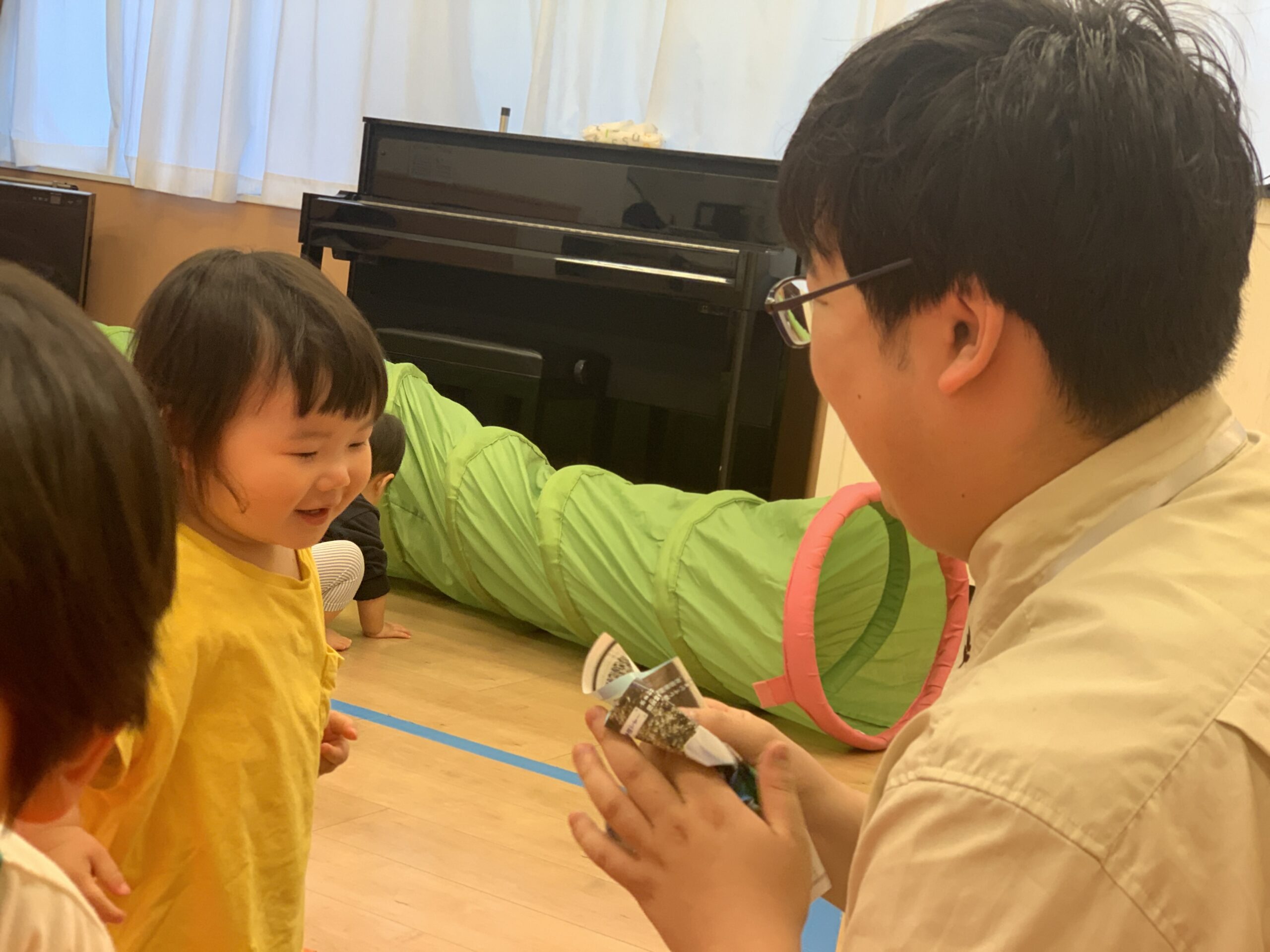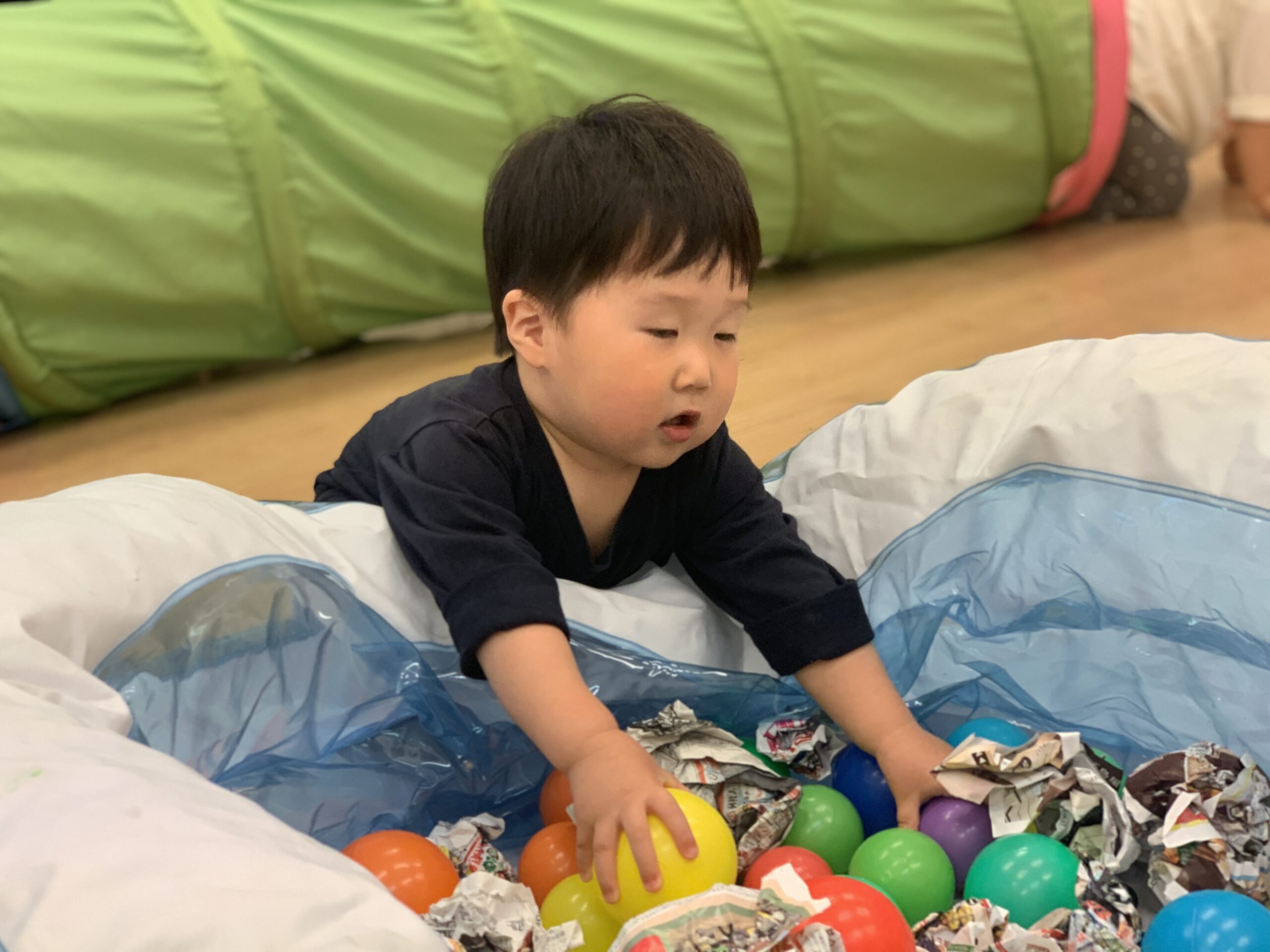 トンネルの中をハイハイでくぐると、 「わぁ!でてきた~!」と先生。 「もういっかい!」と、何度もくぐって ニコニコ笑顔があふれていました♡