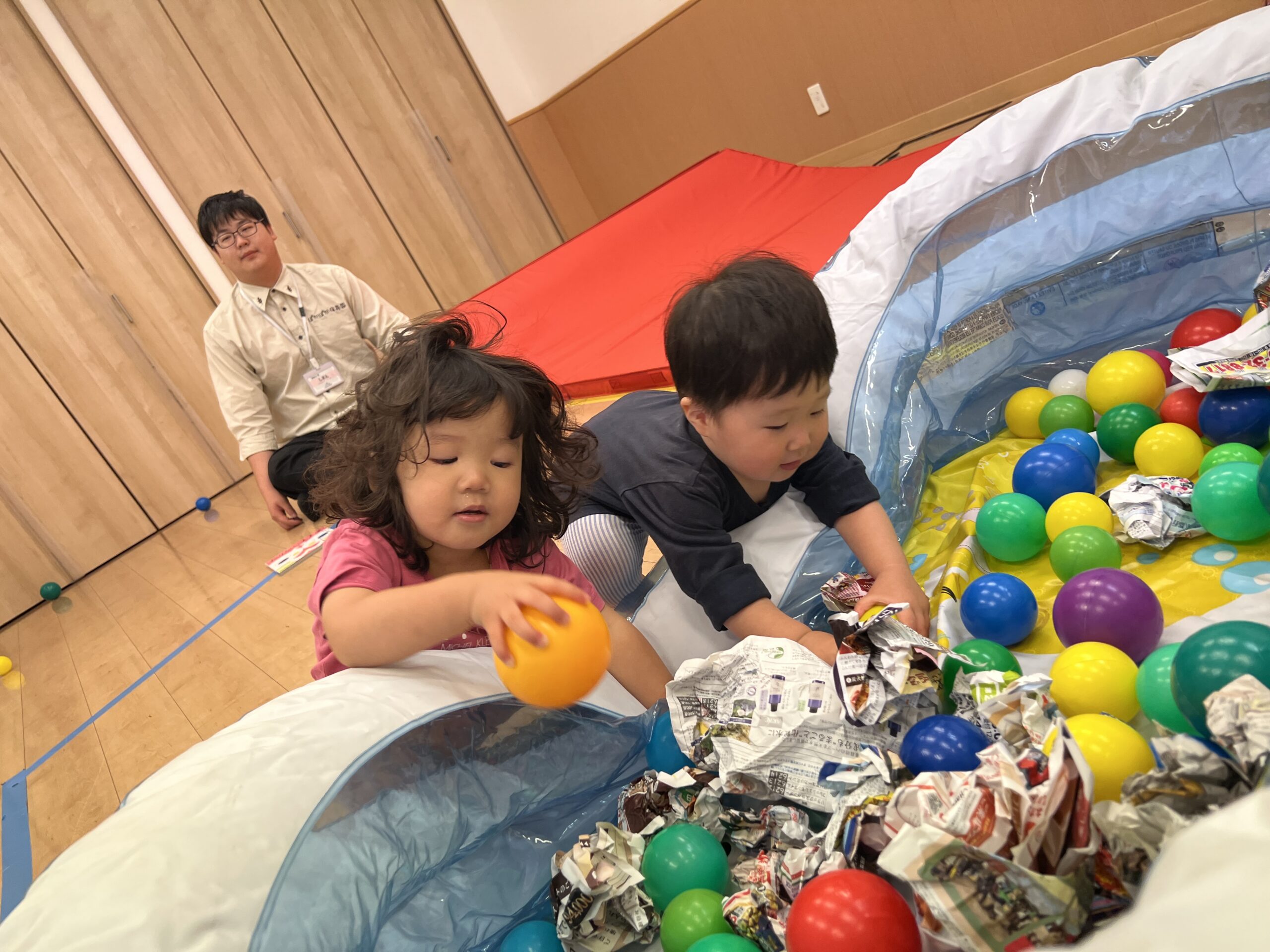 「くしゃ~」「できたー!」と 自分で丸めた新聞紙を見せてくれました☆
