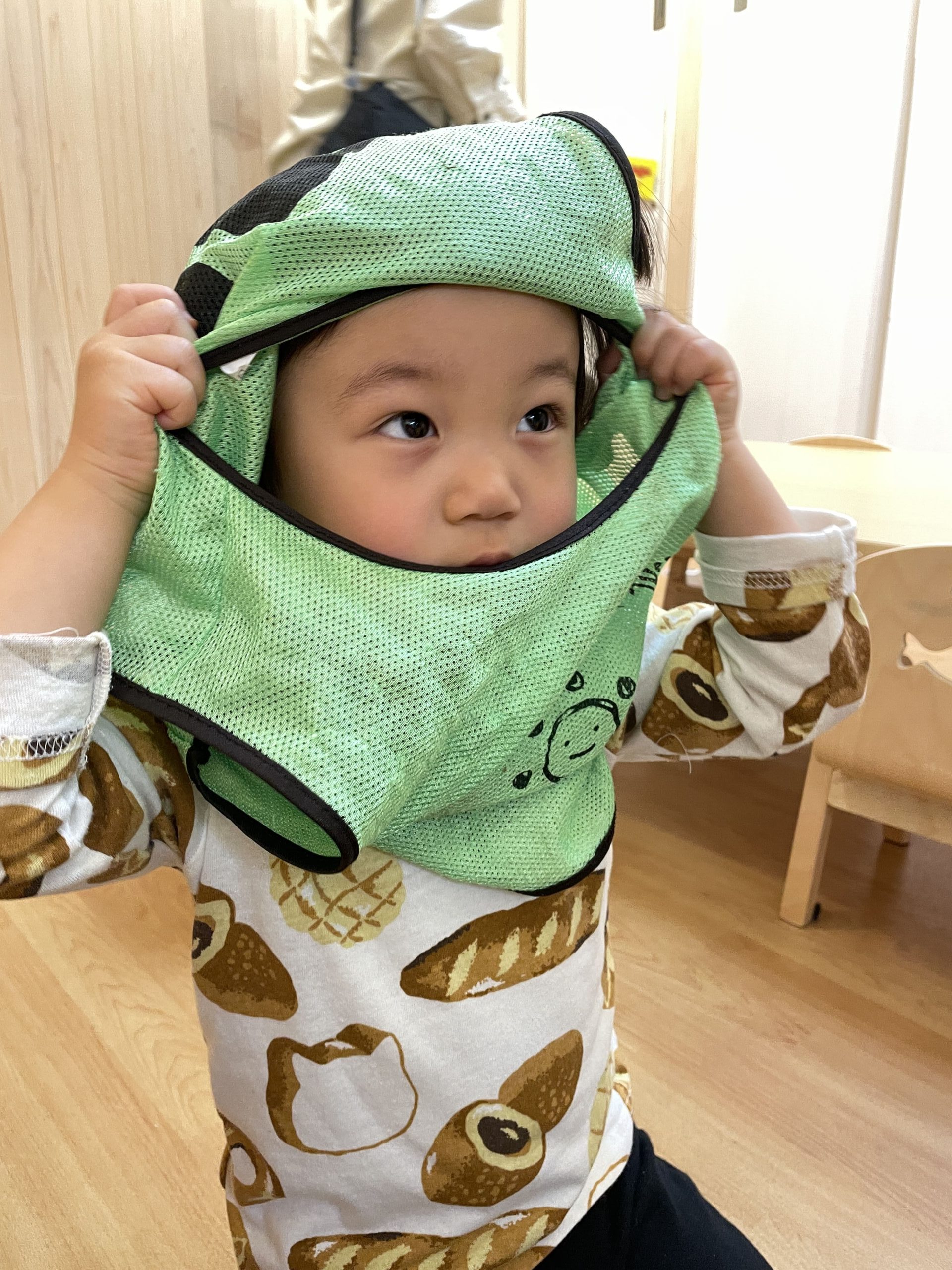 お外に行く前は、ビブスも頑張って自分で着てみます!