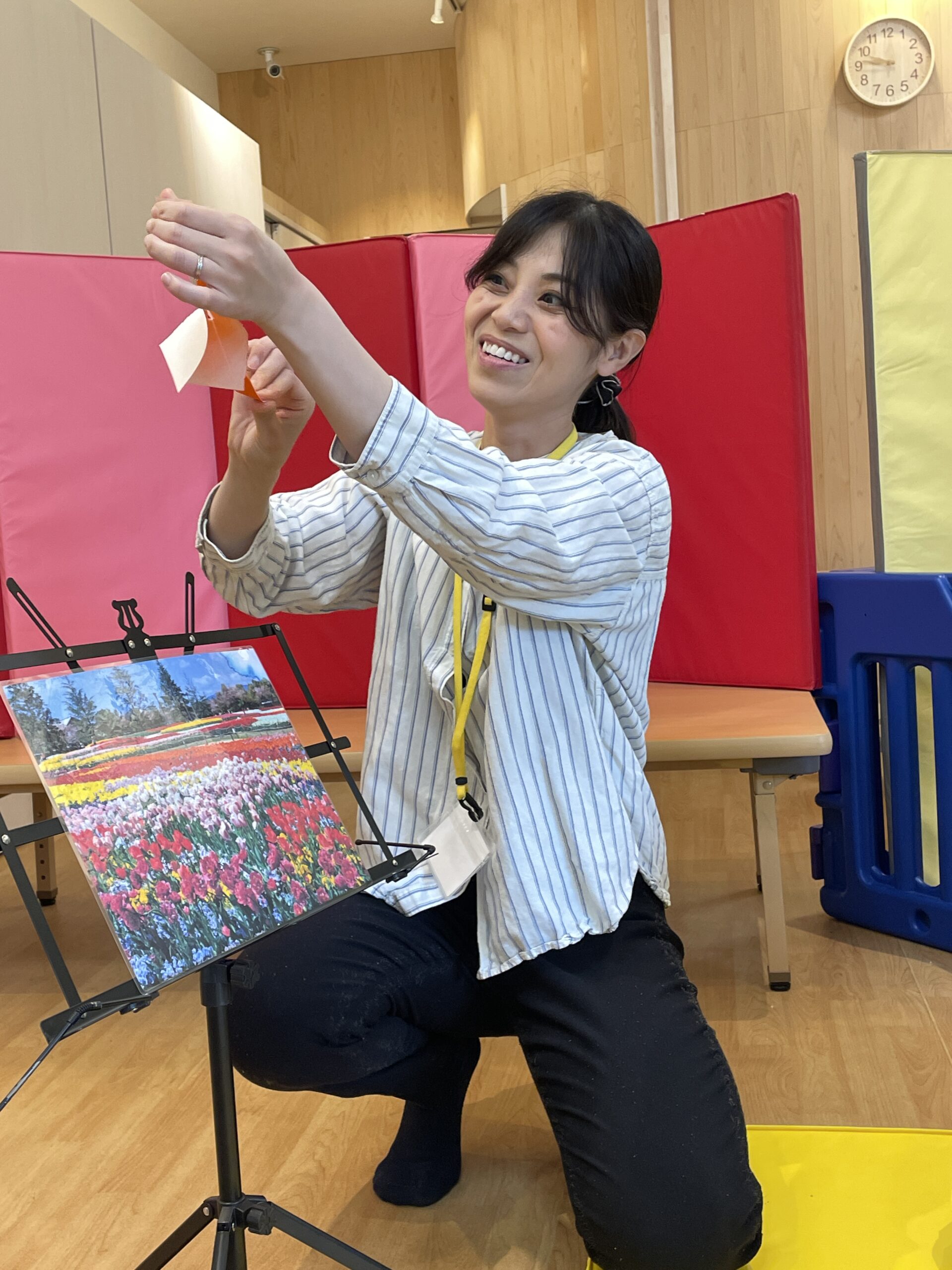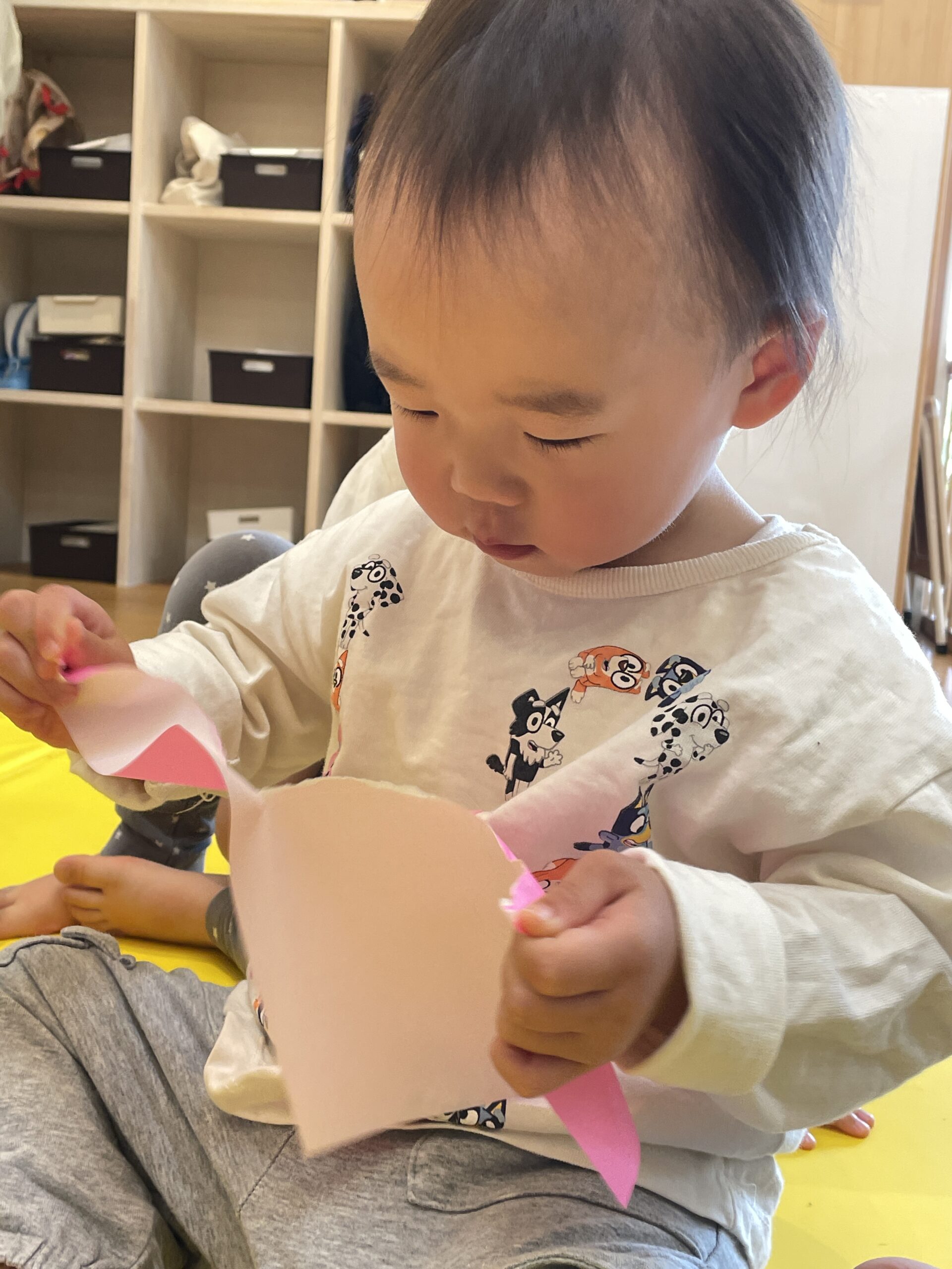 折り紙でびりびり音も楽しみながら、花びら作り🌷