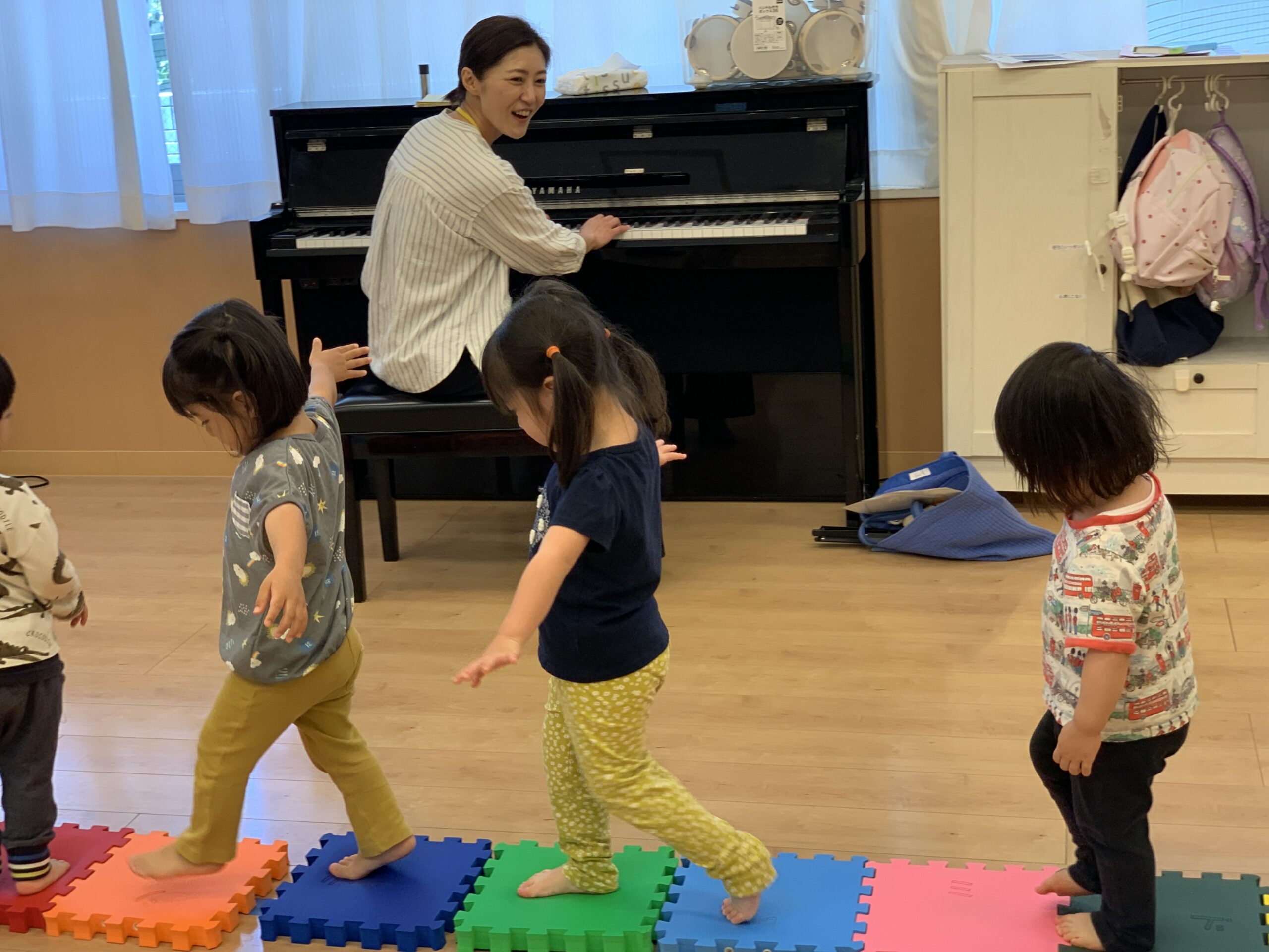 音楽に合わせて歩いたりジャンプしたり、