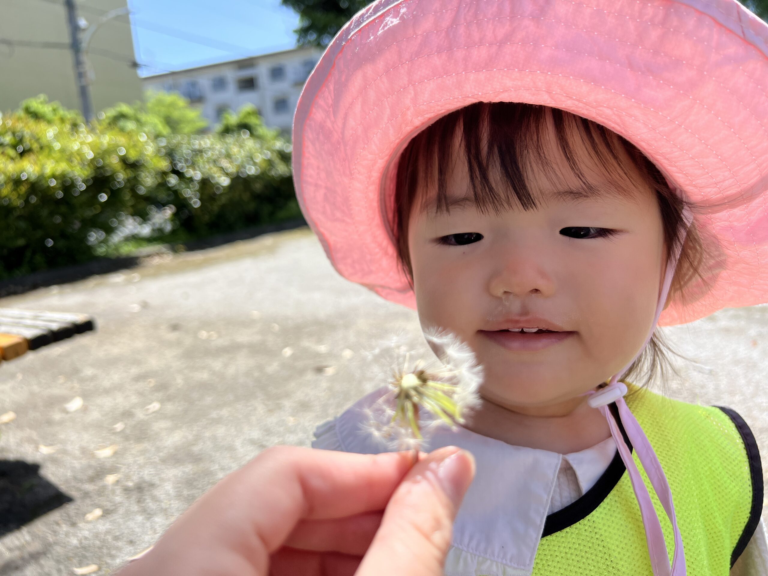 広場では、たんぽぽの綿毛を見つけて「ふーっ」と吹いてみたり、木の枝を拾って感触を確かめたりと、自然とのふれあいを楽しみました。