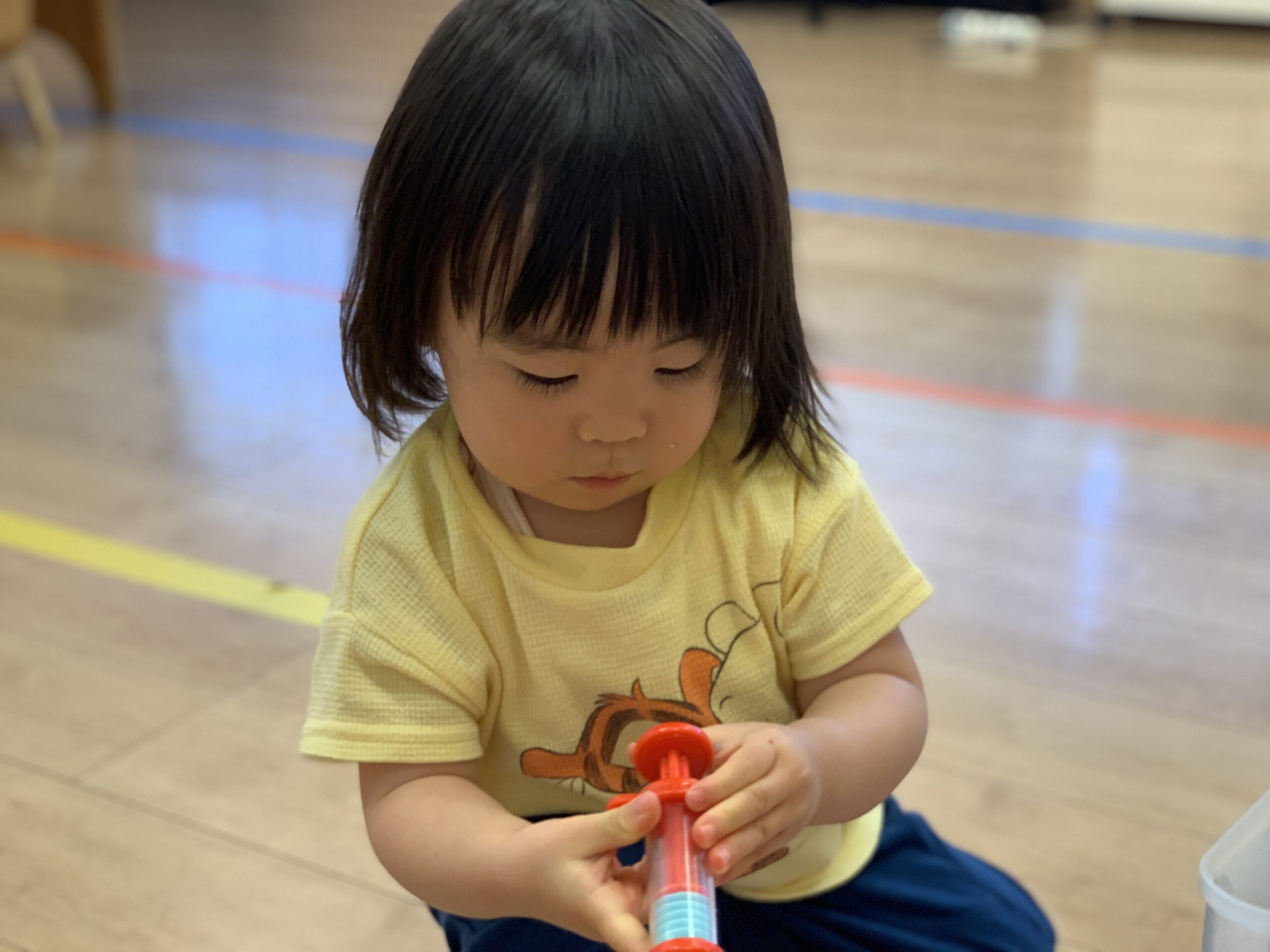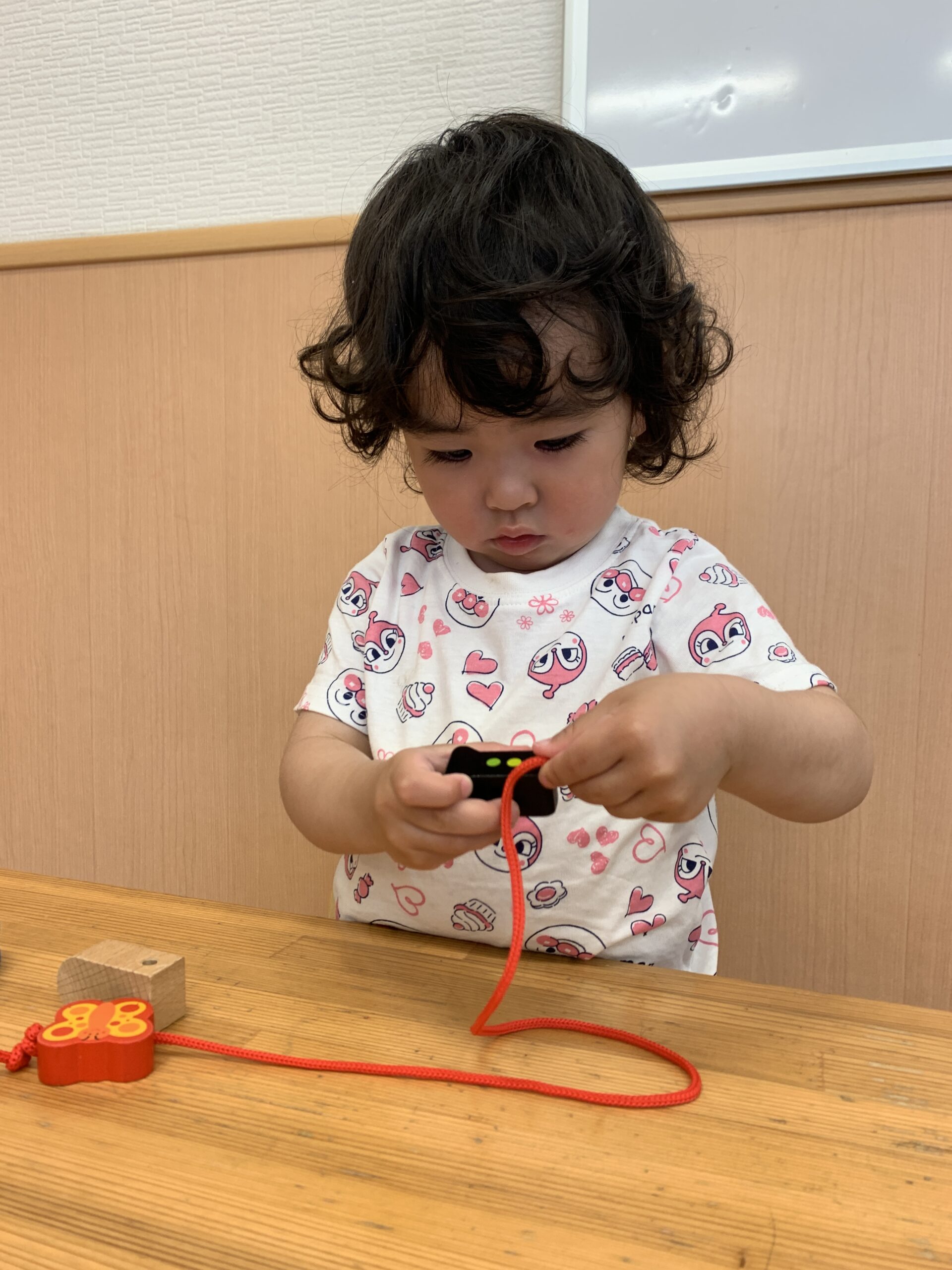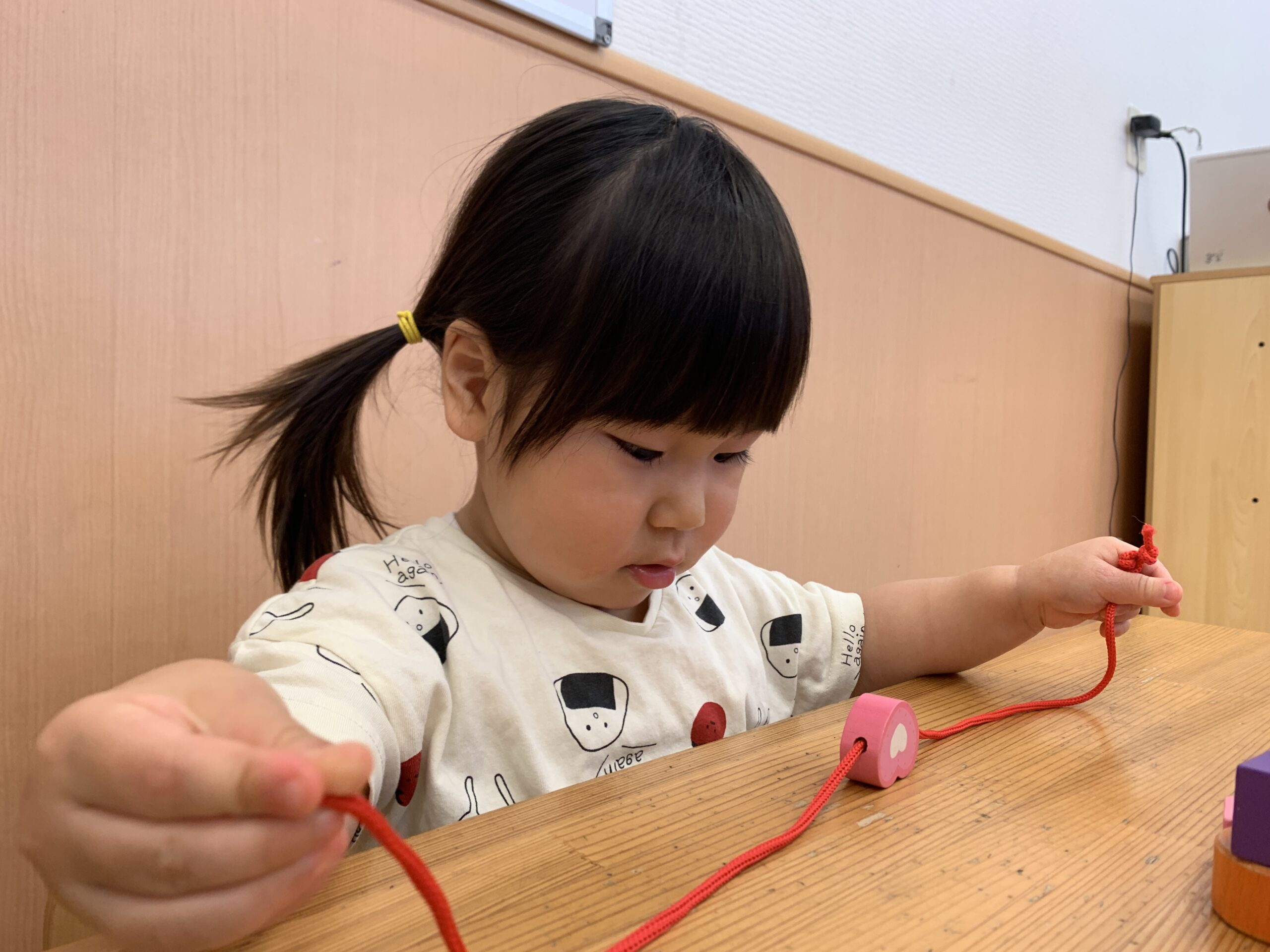 2歳児は保育室で、指先を使った遊びに挑戦しました。紐に通したり、小さな穴に玉を入れたりと、集中して取り組む姿が見られました。