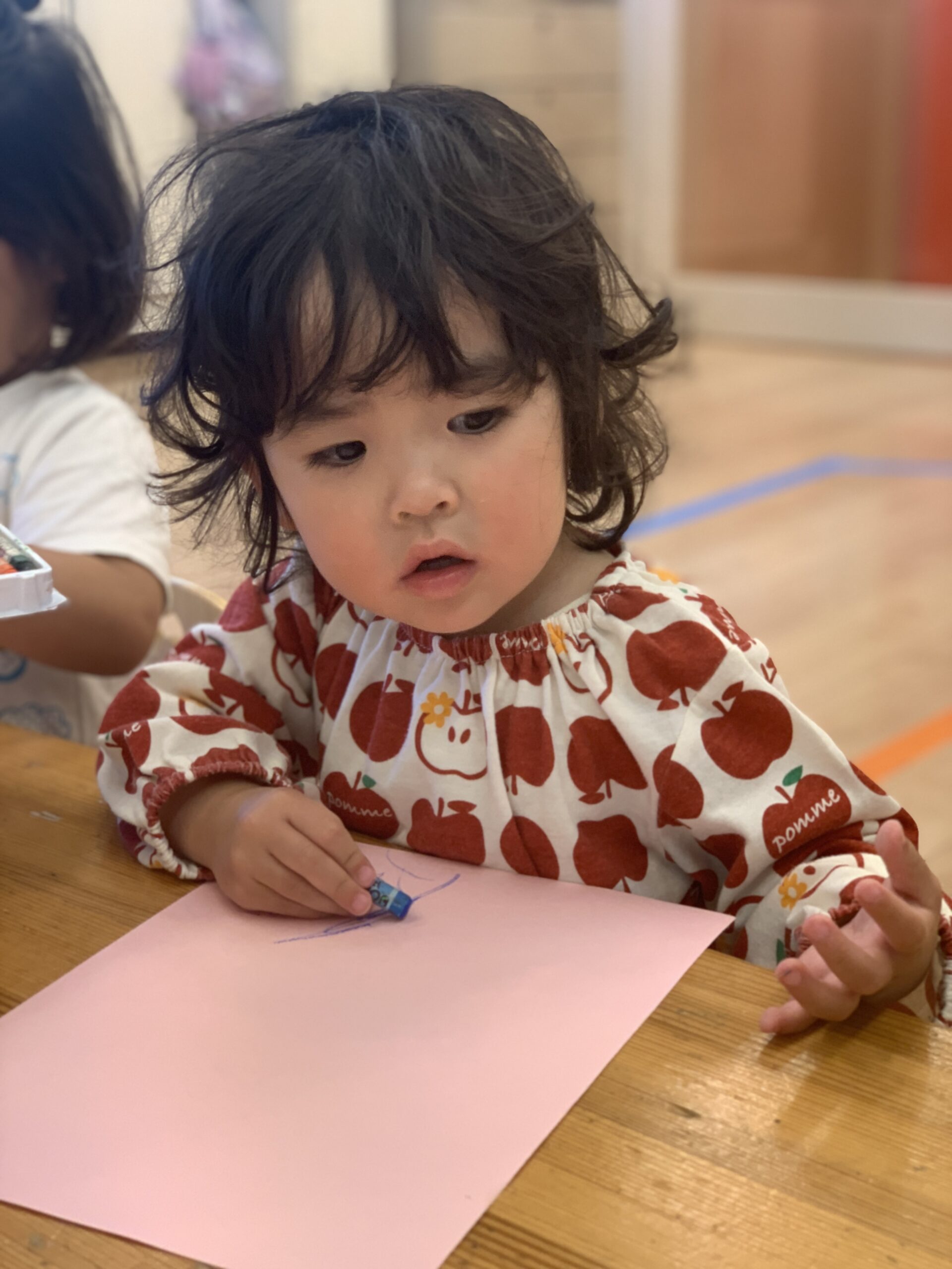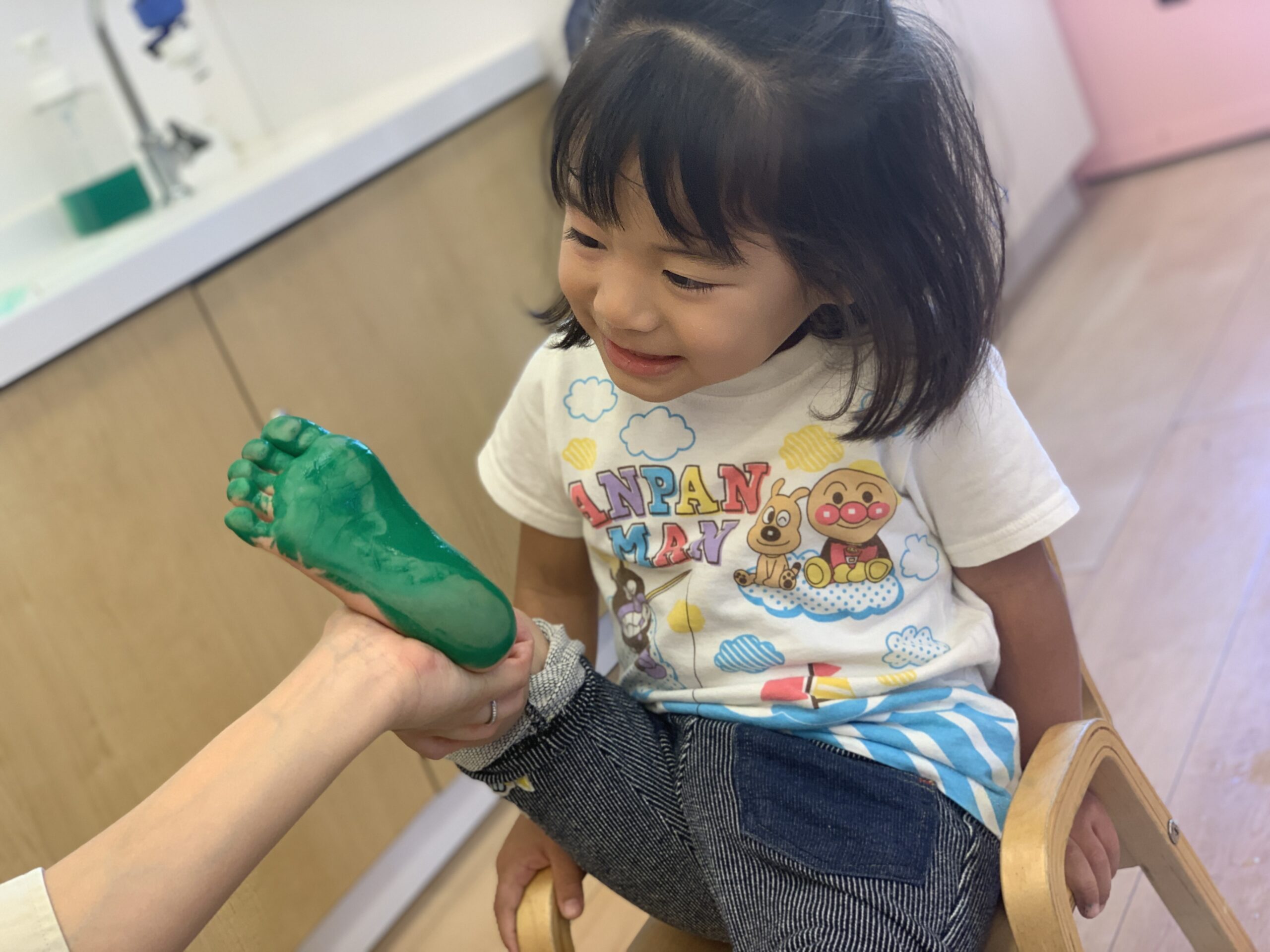 絵の具をポンポンと塗ったり足に塗って紙にぺたん!「せんせい、みて〜ぼくのて!」と得意げに見せてくれる子や、「なにこれ〜?」と不思議そうに眺める子も。冷たさにびっくりして足を引っ込める子もいれば、くすぐったくて笑ってしまう子、不思議そうにまじまじと見る子などひとりひとりの反応がとても微笑ましく、素敵な制作時間となりました。