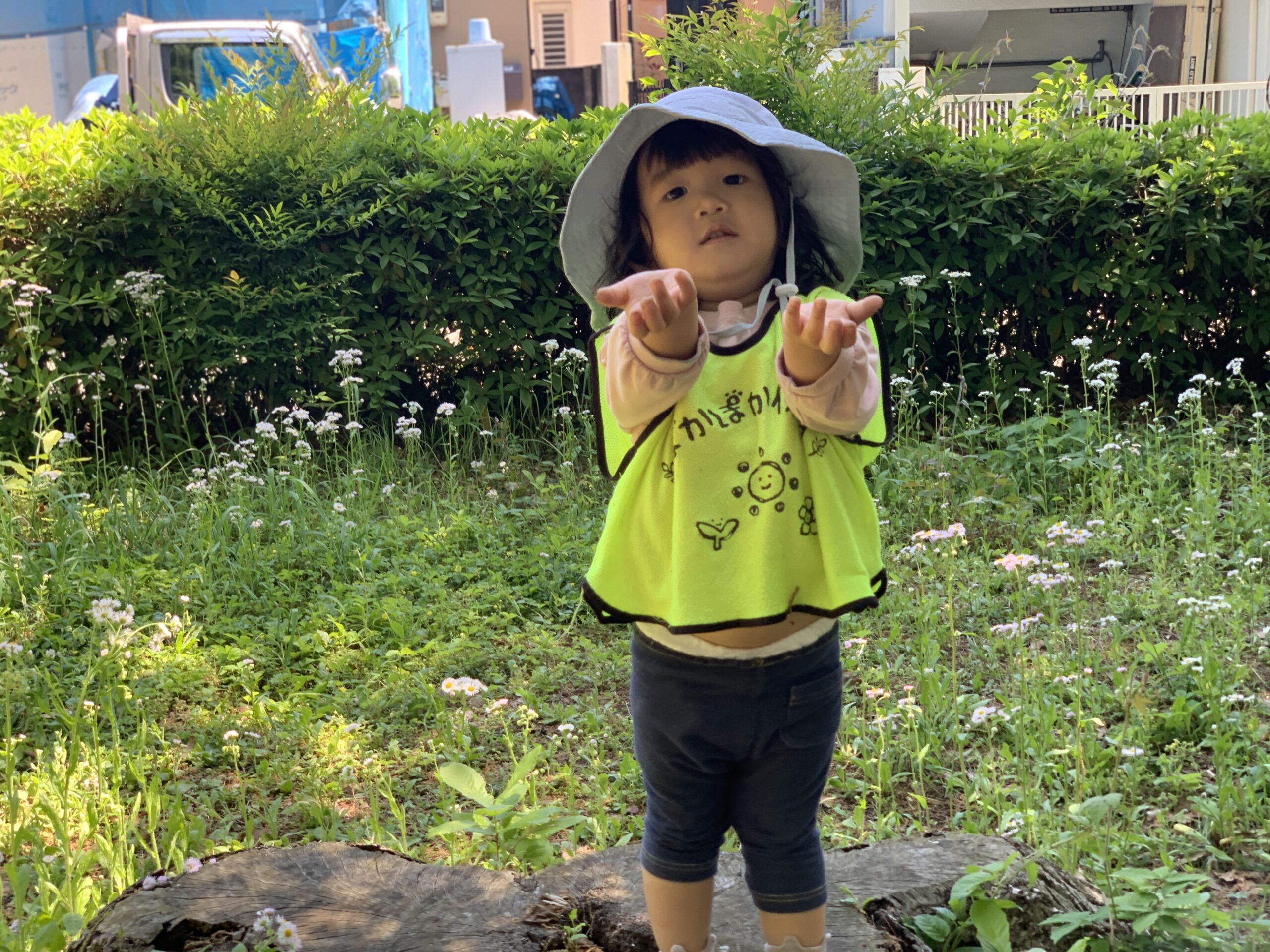 制作のあとは、0・1歳児さんはお部屋でブロックを使ったり、テラスでそよ風に吹かれながらのんびりとした時間を過ごしました。「せんせい、みて〜たかくつんだよ!」とブロックを高く積み上げる子に「すごいね!」と拍手。心地よい風に当たりながら、自然を感じる散歩タイムにも笑顔があふれていました。