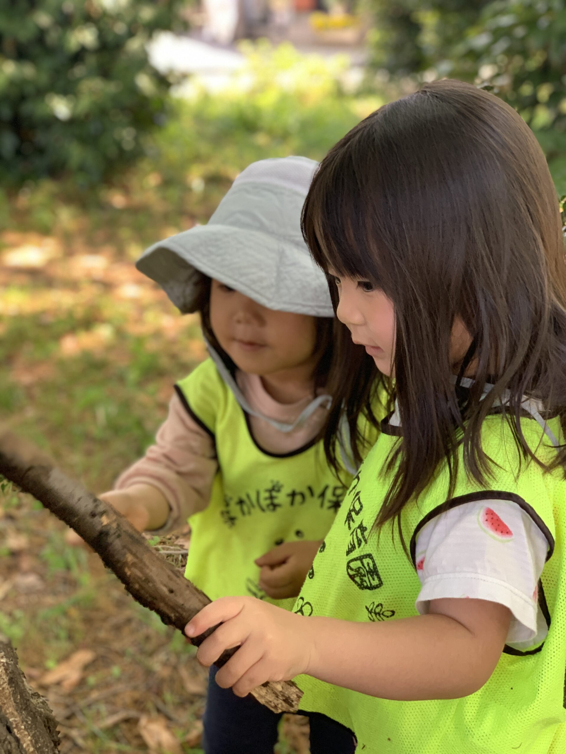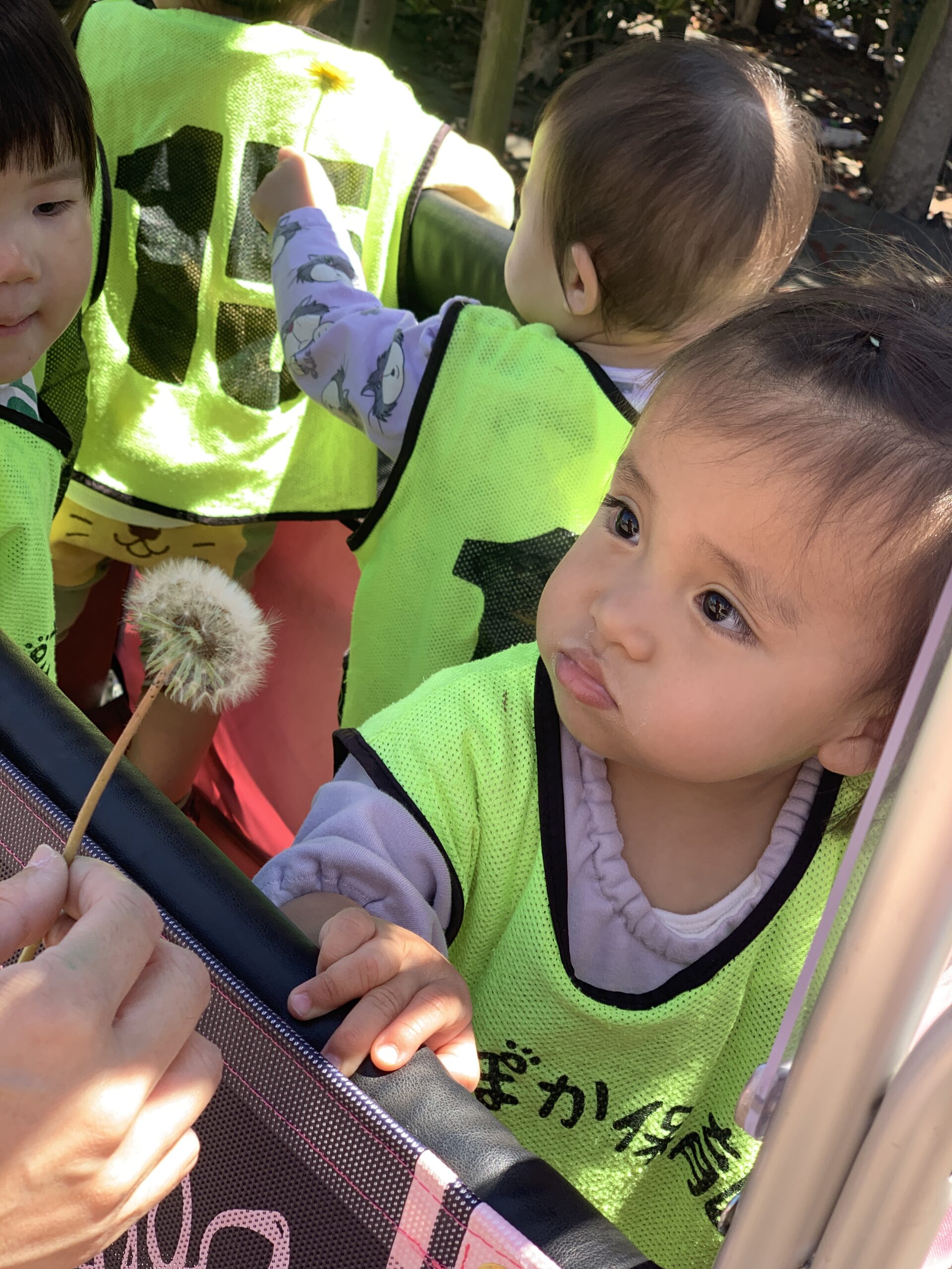 2歳児さんは、近くの公園へ出かけて体をたくさん動かして遊びました。公園を走り回ったり、しゃがんで葉っぱなどを観察したりと、春の自然に触れながら思い思いに楽しんでいました。「あっ!ちょうちょ!」と指をさす姿や、「ここにどんぐりあるかも」と真剣な表情で探す様子も見られ、自然とのふれあいを通して豊かな感性が育っているのを感じました。