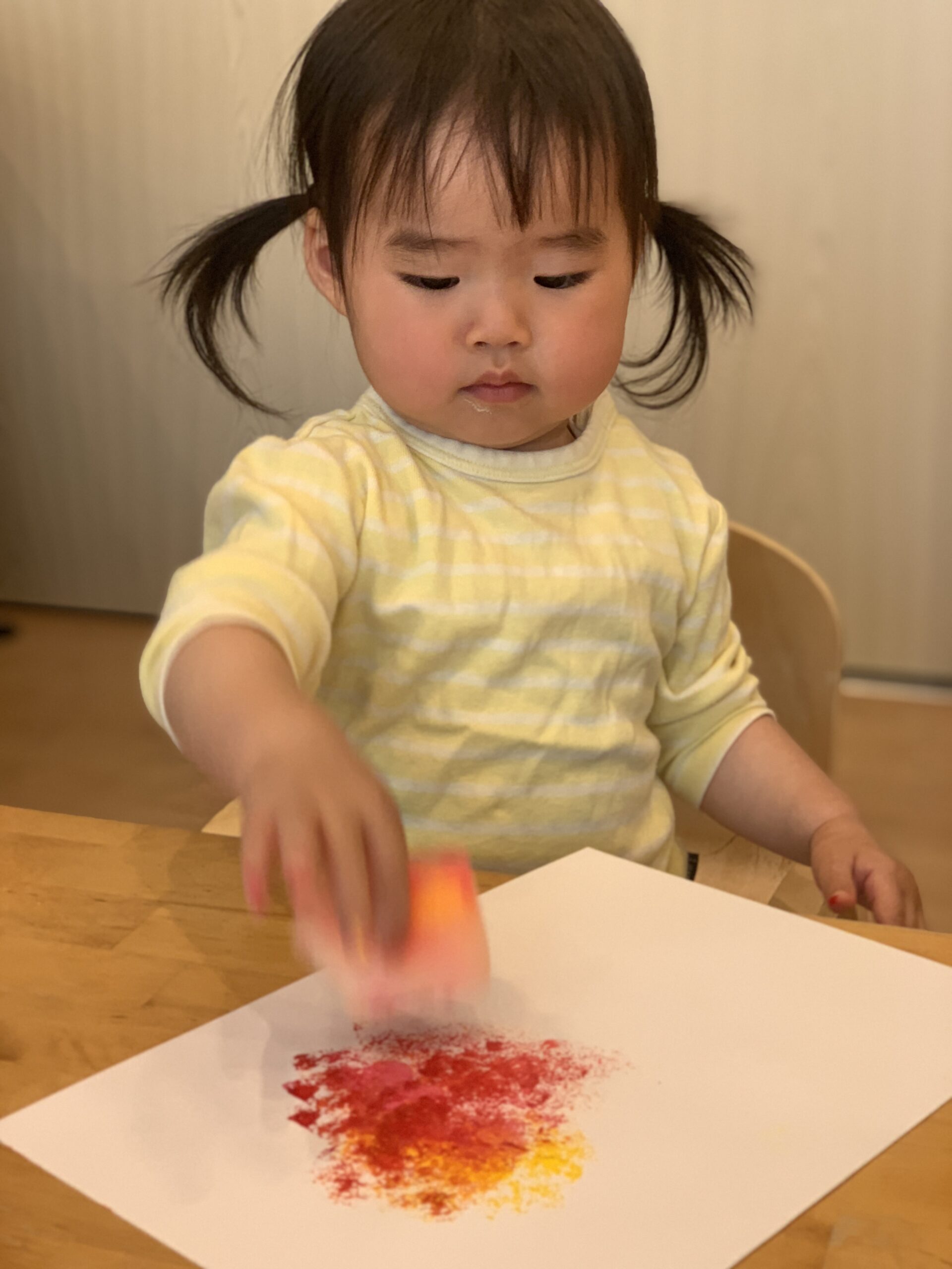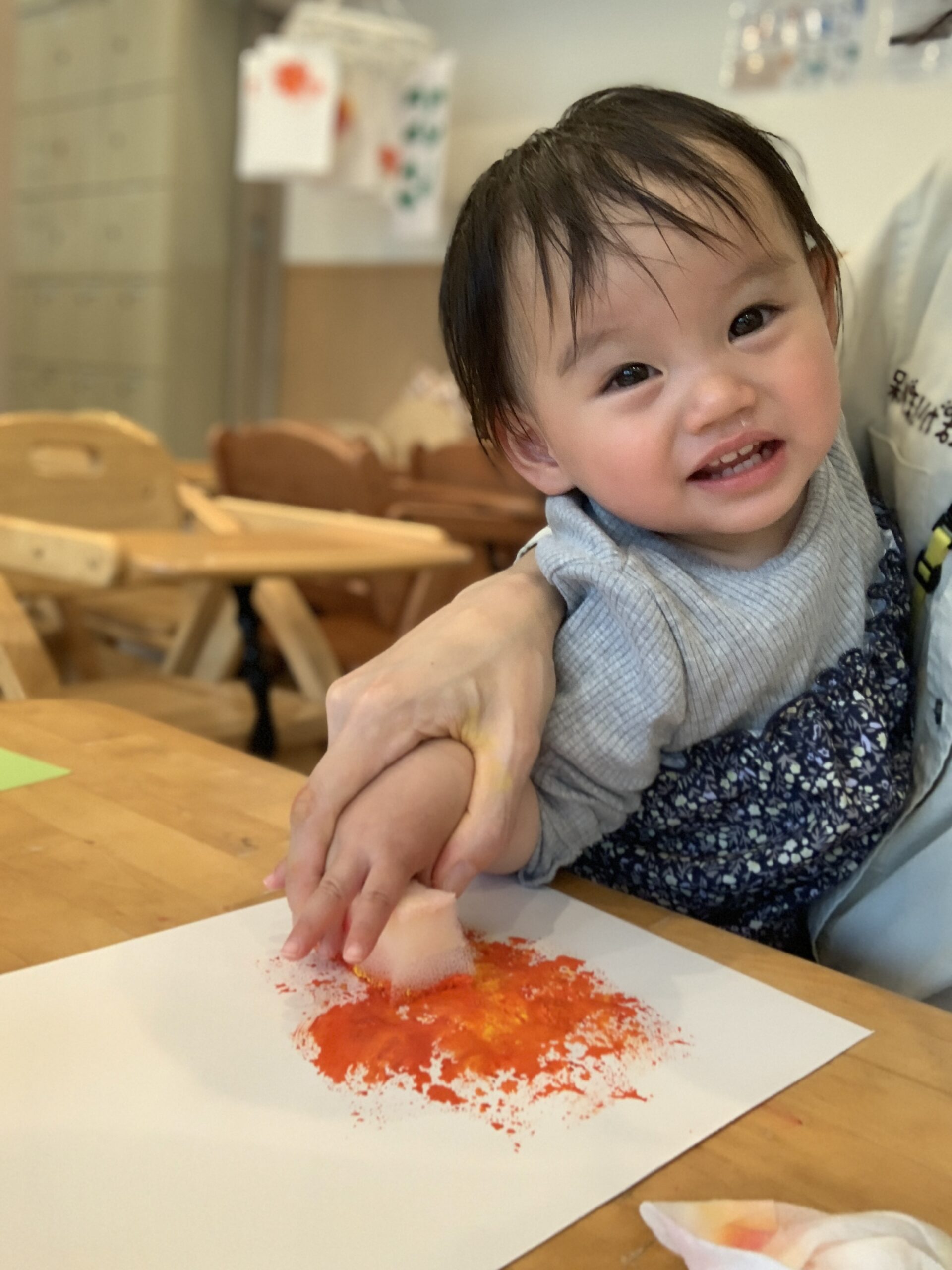 今日は0・1・2歳児のみんなで、5月に向けた季節の制作に取り組みました。保育室には「たのしい!」「つめたーい!」「くすぐったい〜」と絵の具の感触に反応する、にこにこ笑顔がたくさん広がっていました。