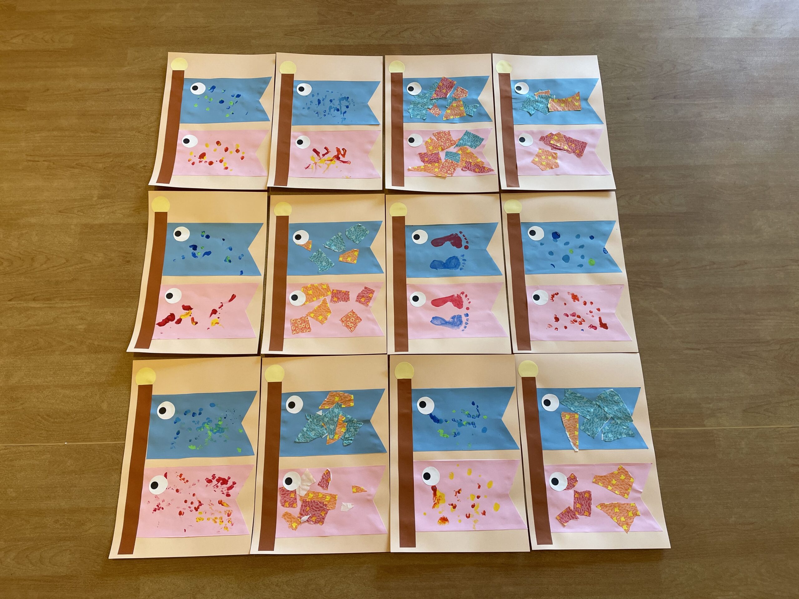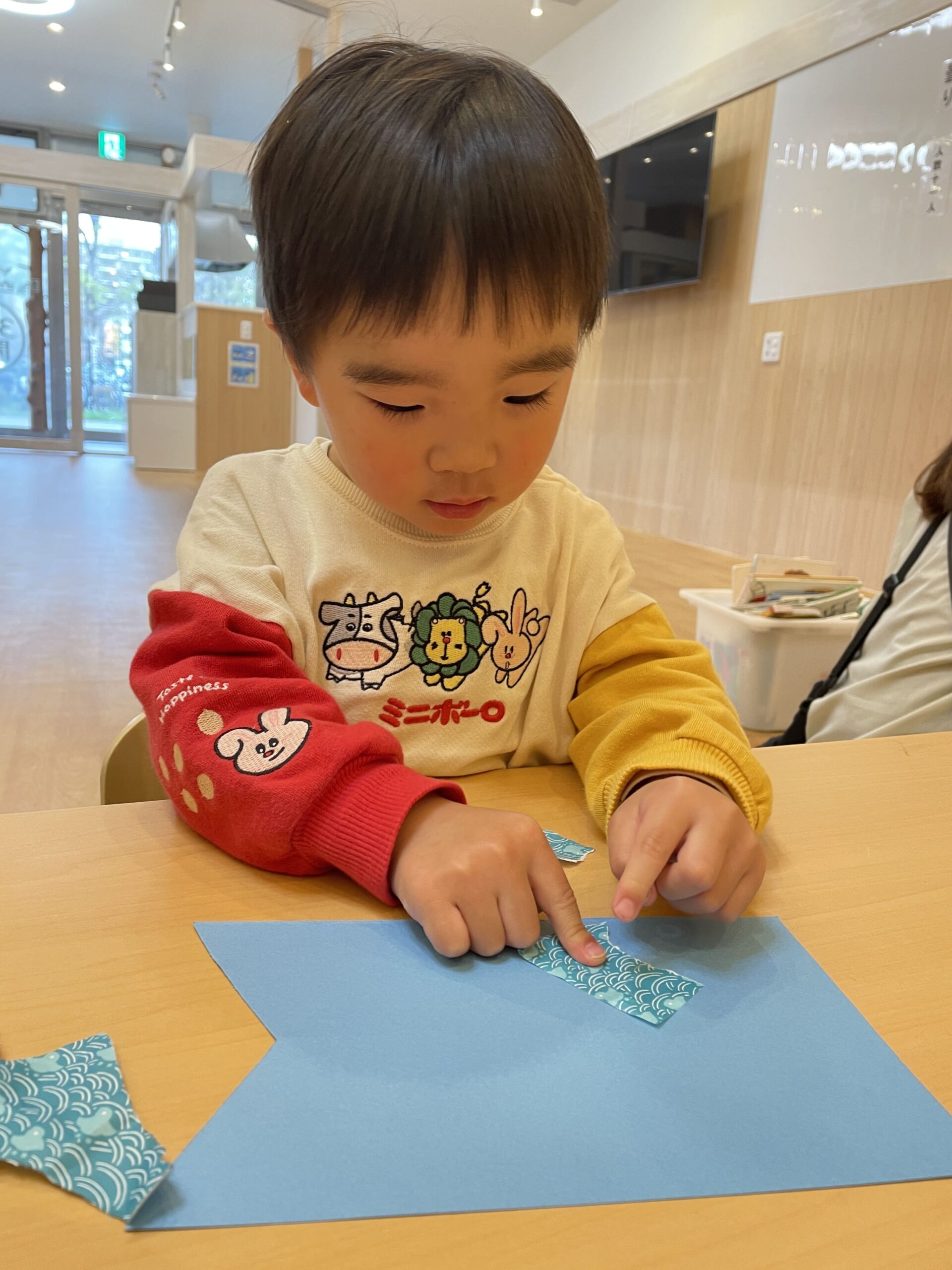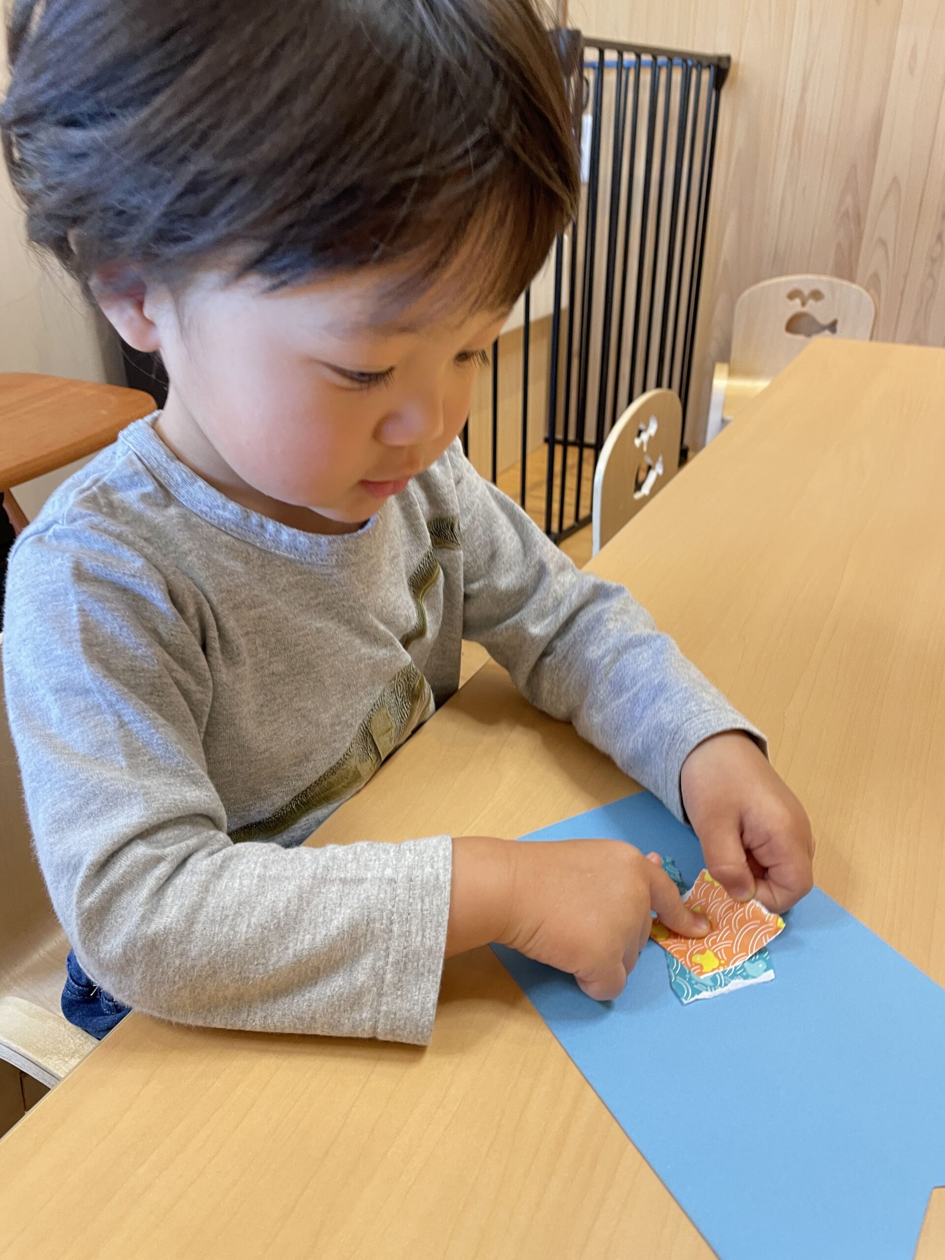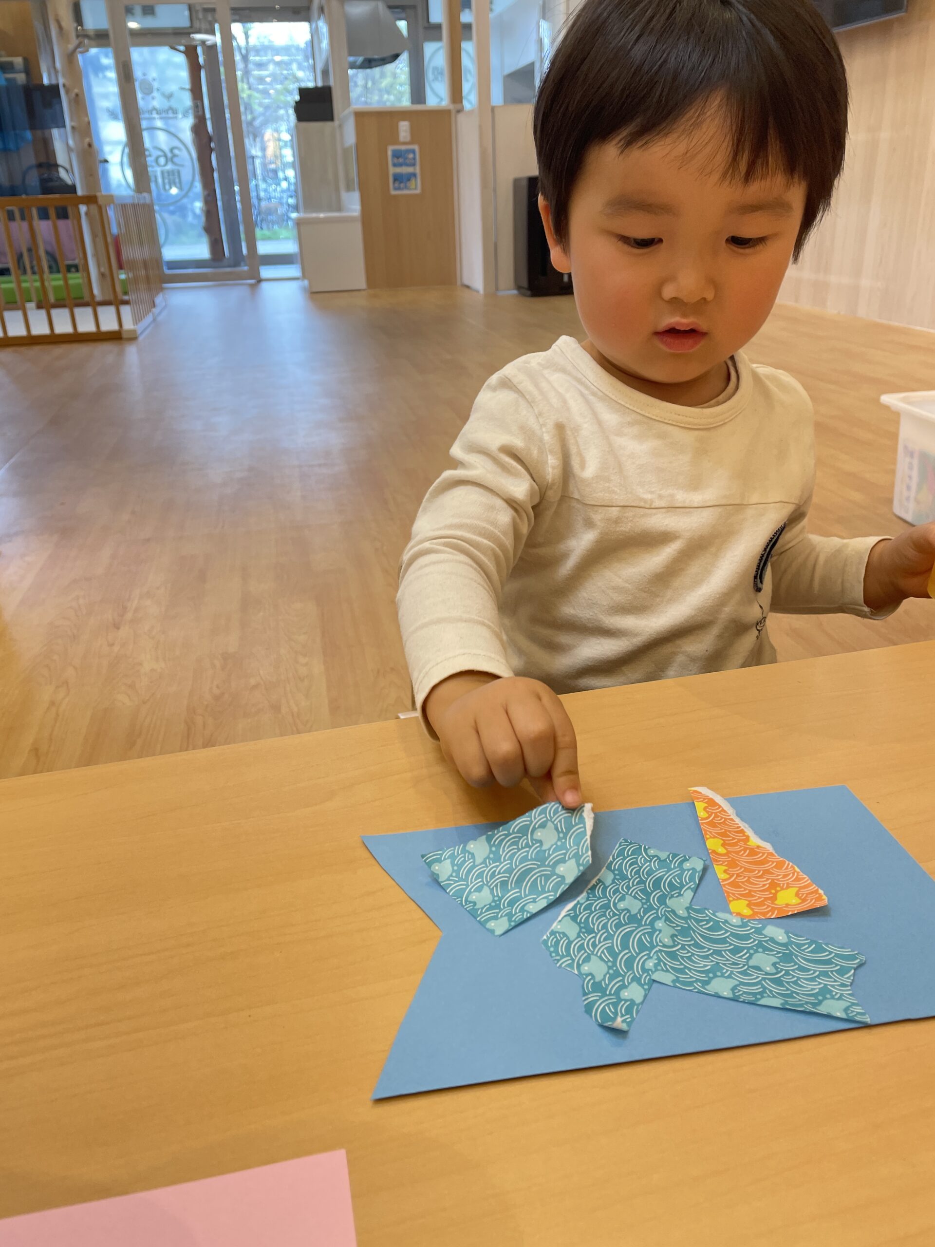 上手にびりびり出来たものを自分の好きなところに、台紙のこいのぼりに糊付けしていきます。