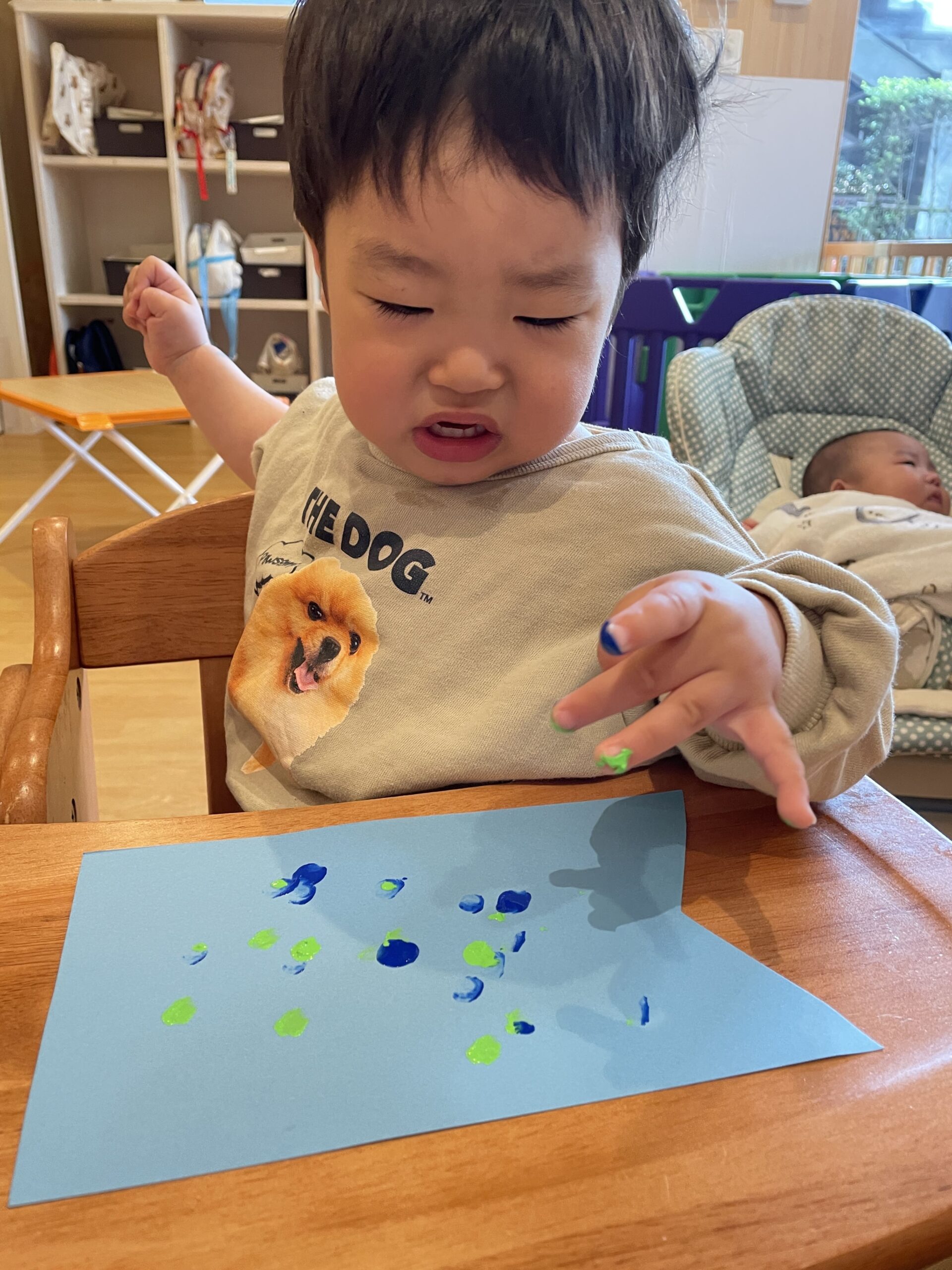 初めての絵の具を足にペタペタ。新しい感覚に不思議な表情!!