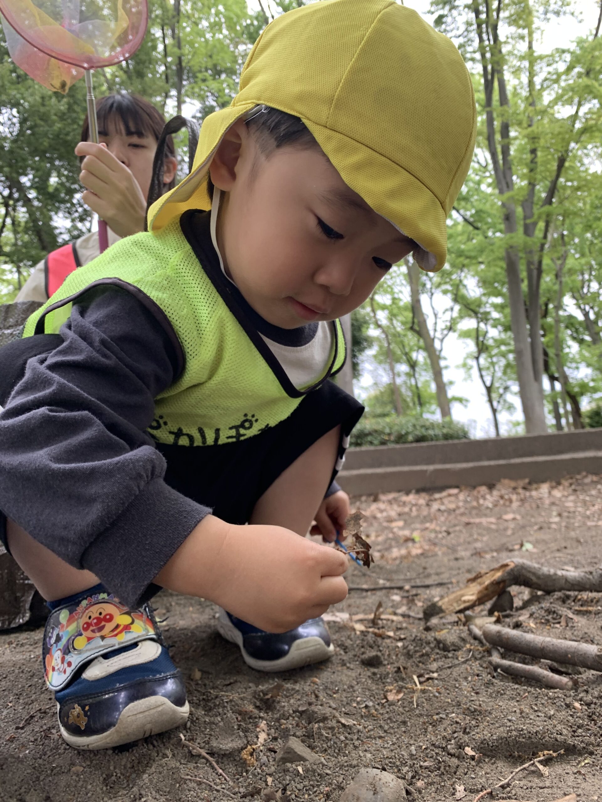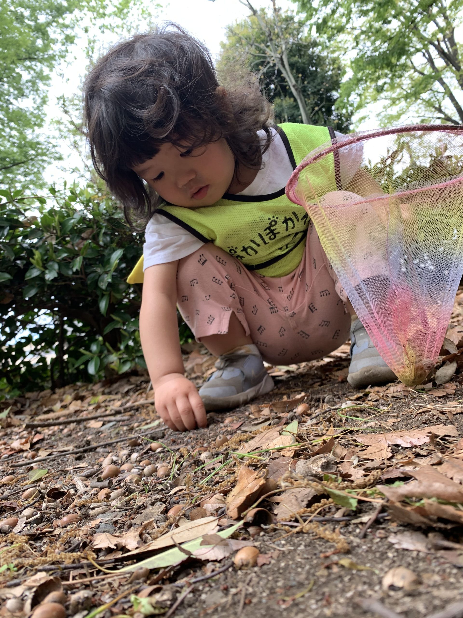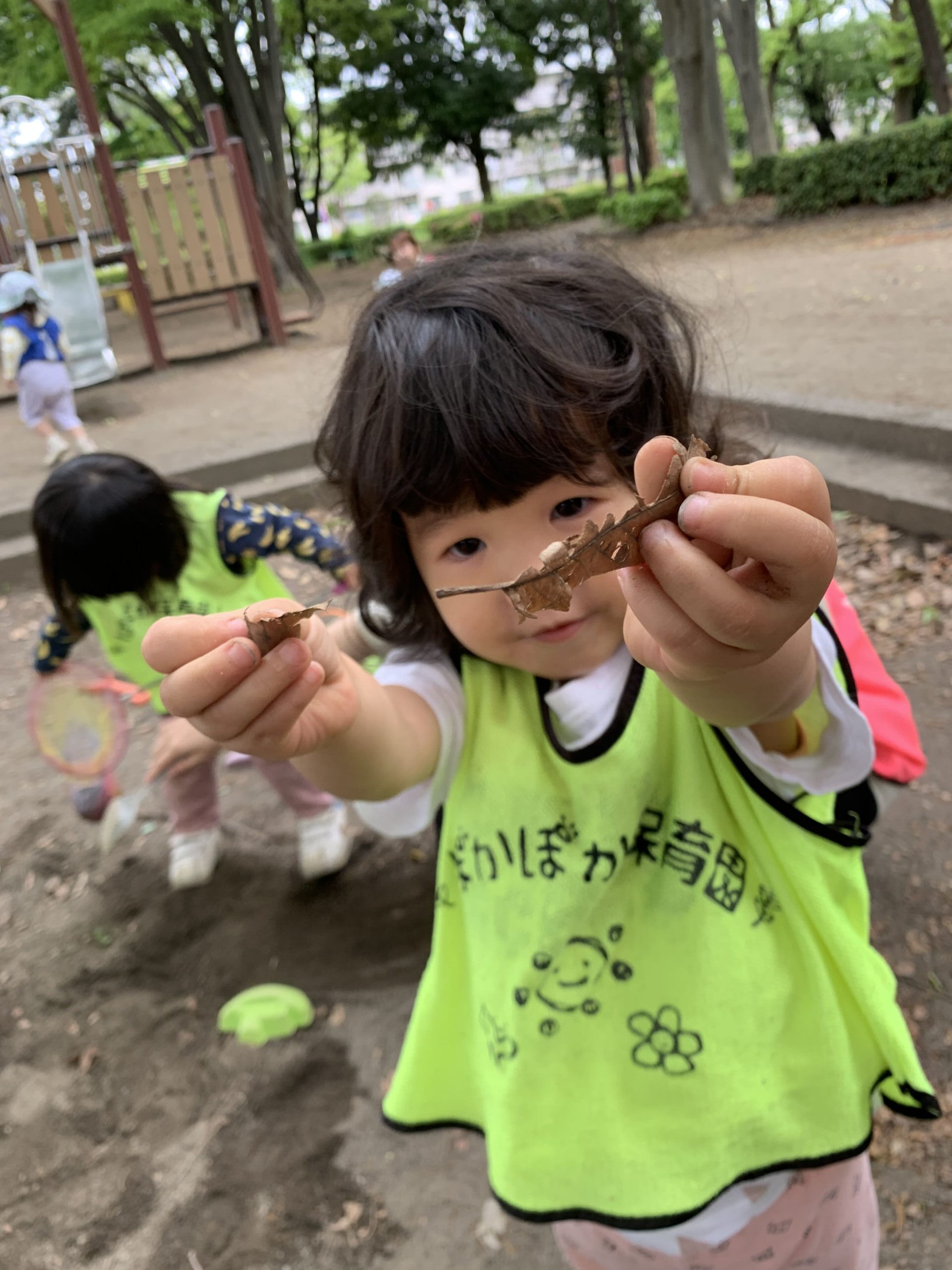 その後、葉っぱ集めをしているお友だちもいました。「先生、これきれい!」と、2歳児のお友だちが自分の手に乗せた葉っぱを見せてくれました。「本当にきれいだね、葉っぱもいろんな形があるんだよ!」と先生が話すと、その子は嬉しそうに葉っぱを大事そうに握りしめていました。