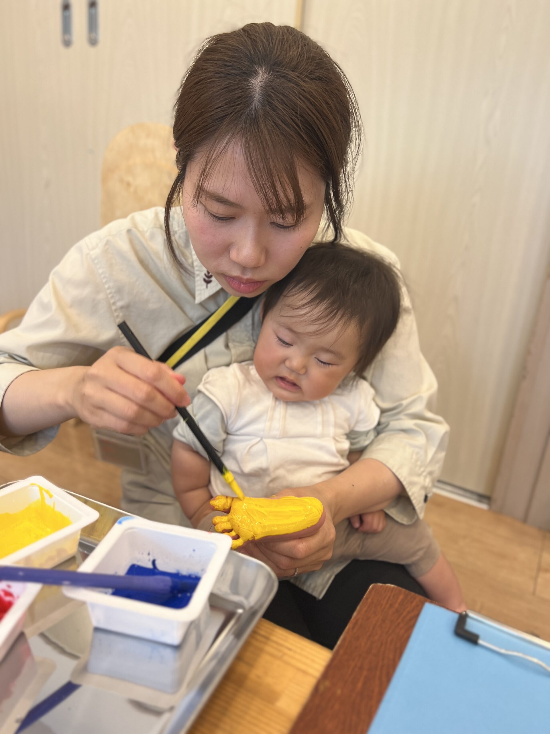ちょんちょんと付ける子もいたり、全体に広げその様子を楽しんでいたり、ダイナミックすぎて自分にペイントをしてしまったりと一人ひとり違う様子がとっても面白いですね♡