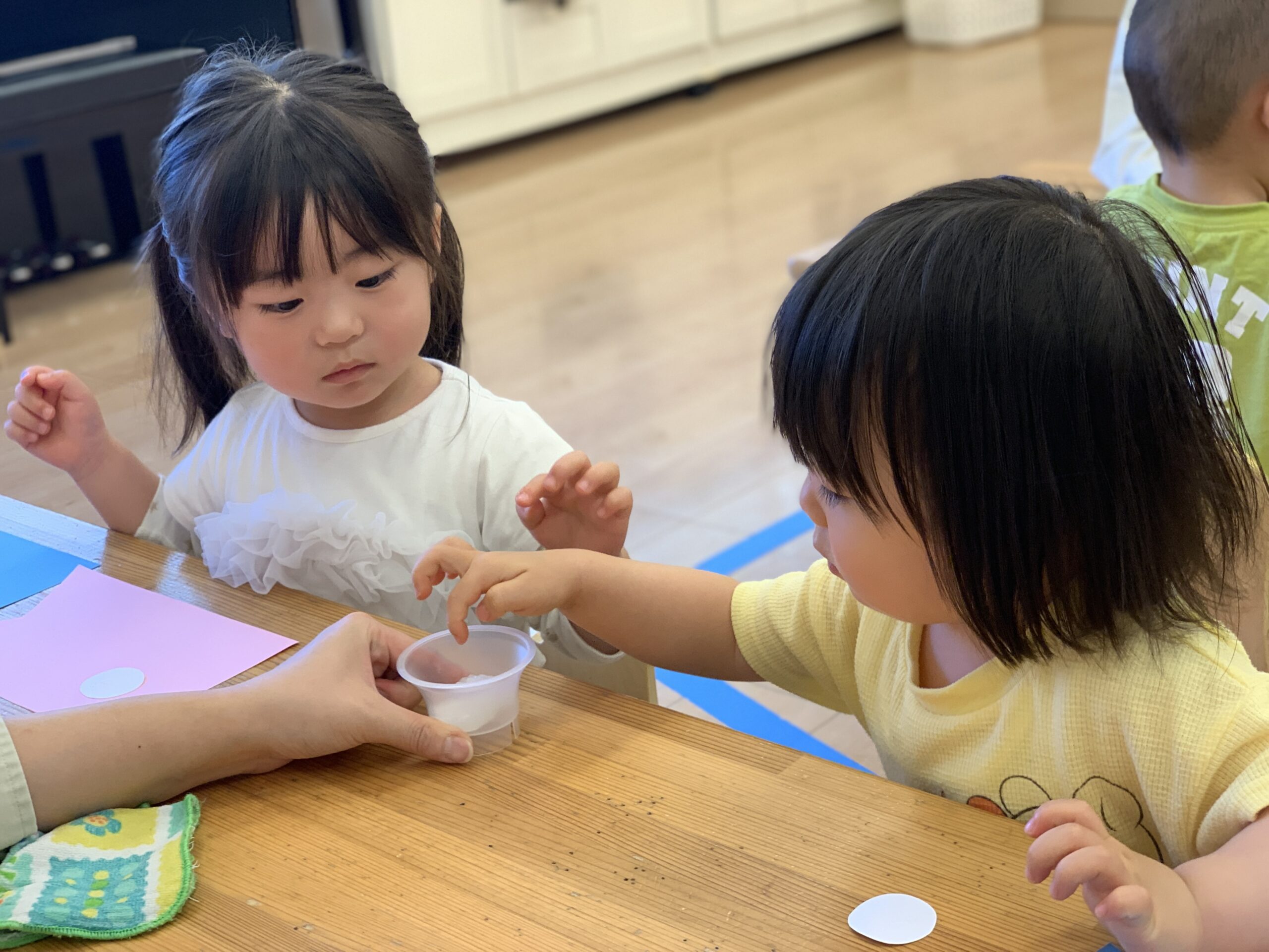 2歳児さんは手先の動きを使った制作を行いました。