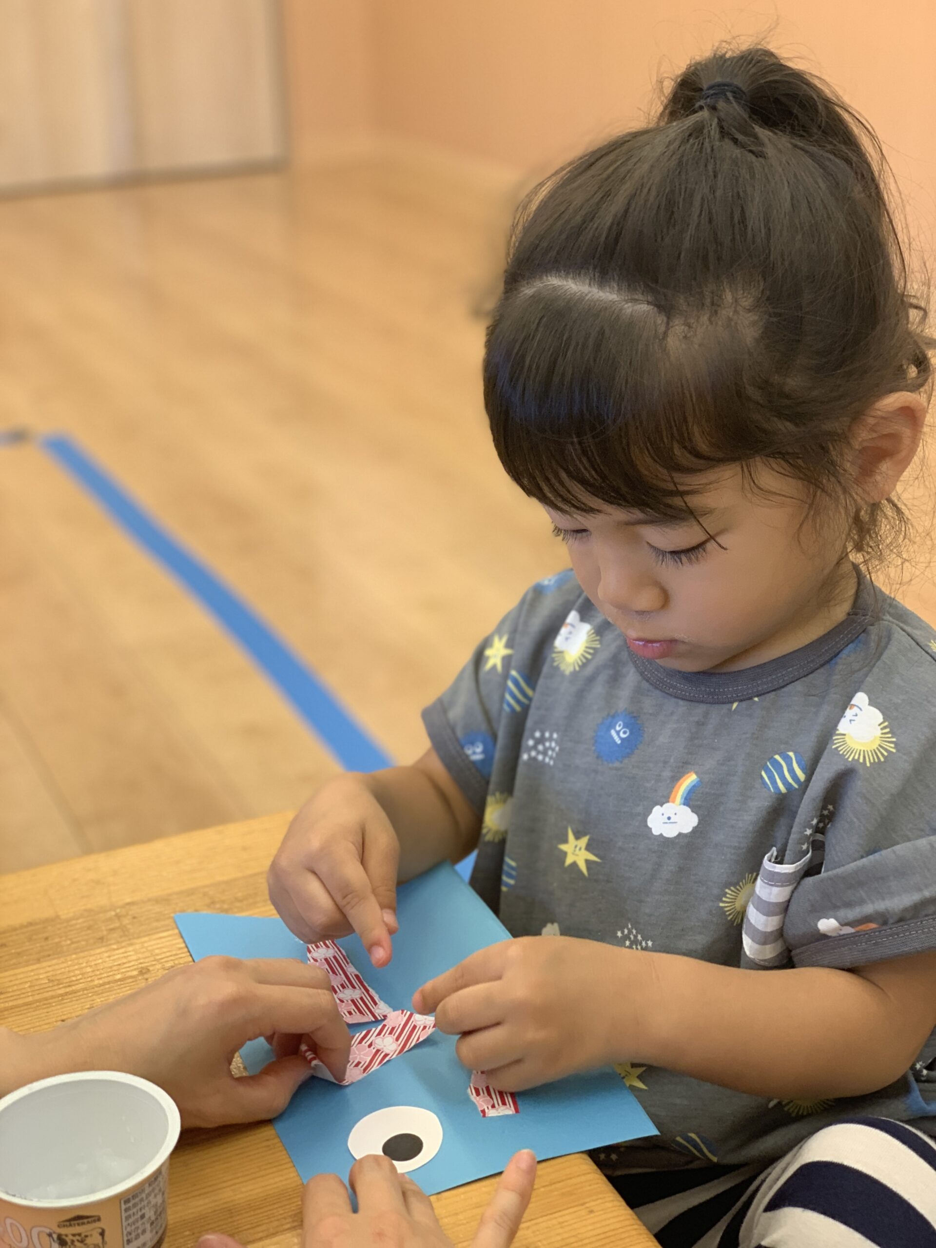 ・工程→千代紙(1人1枚)をちぎり、保育者と一緒にのりで貼る。